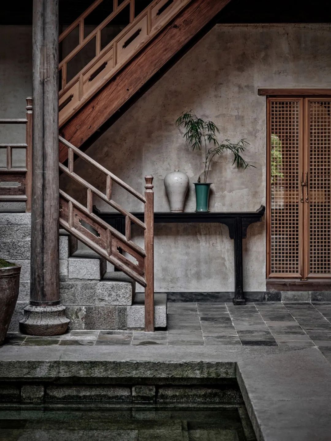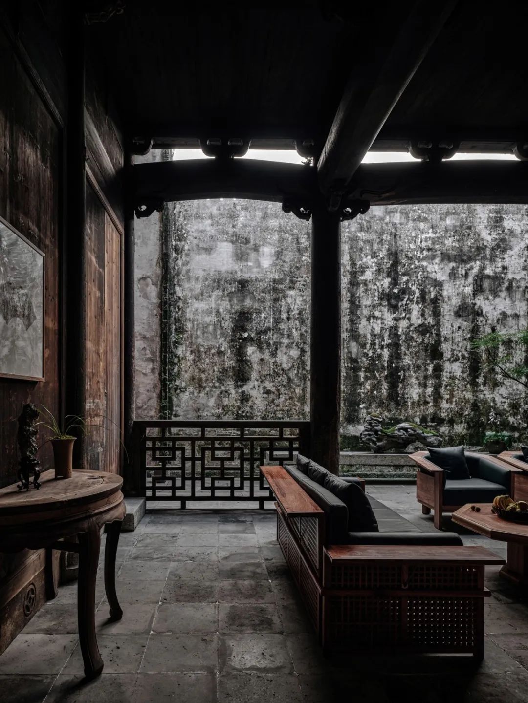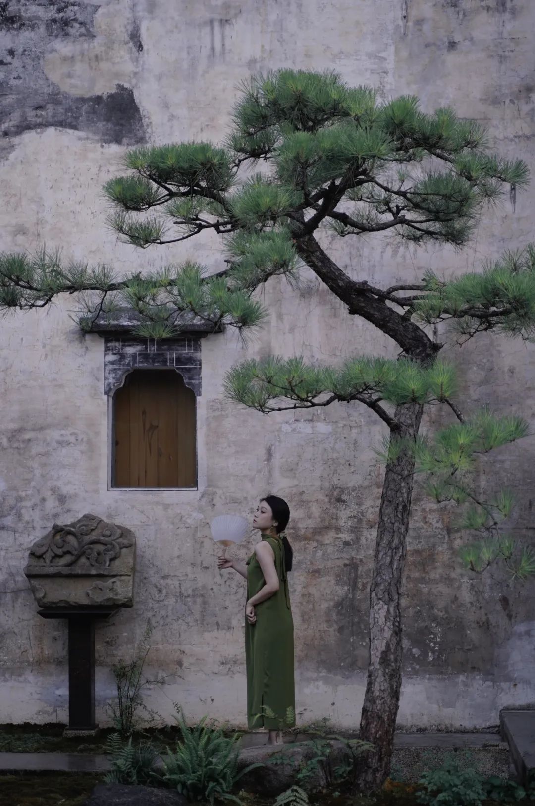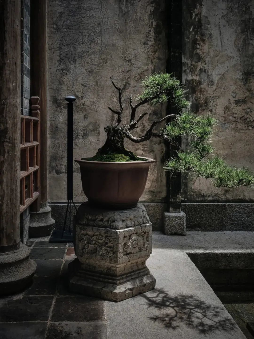 甚至不需出⻔闲逛,收纳一方天地的天井,挂满古字画的中厅,⻔前静立的松与石墩,哪一样不值得细细赏味呢。