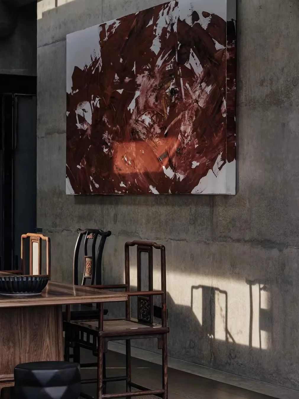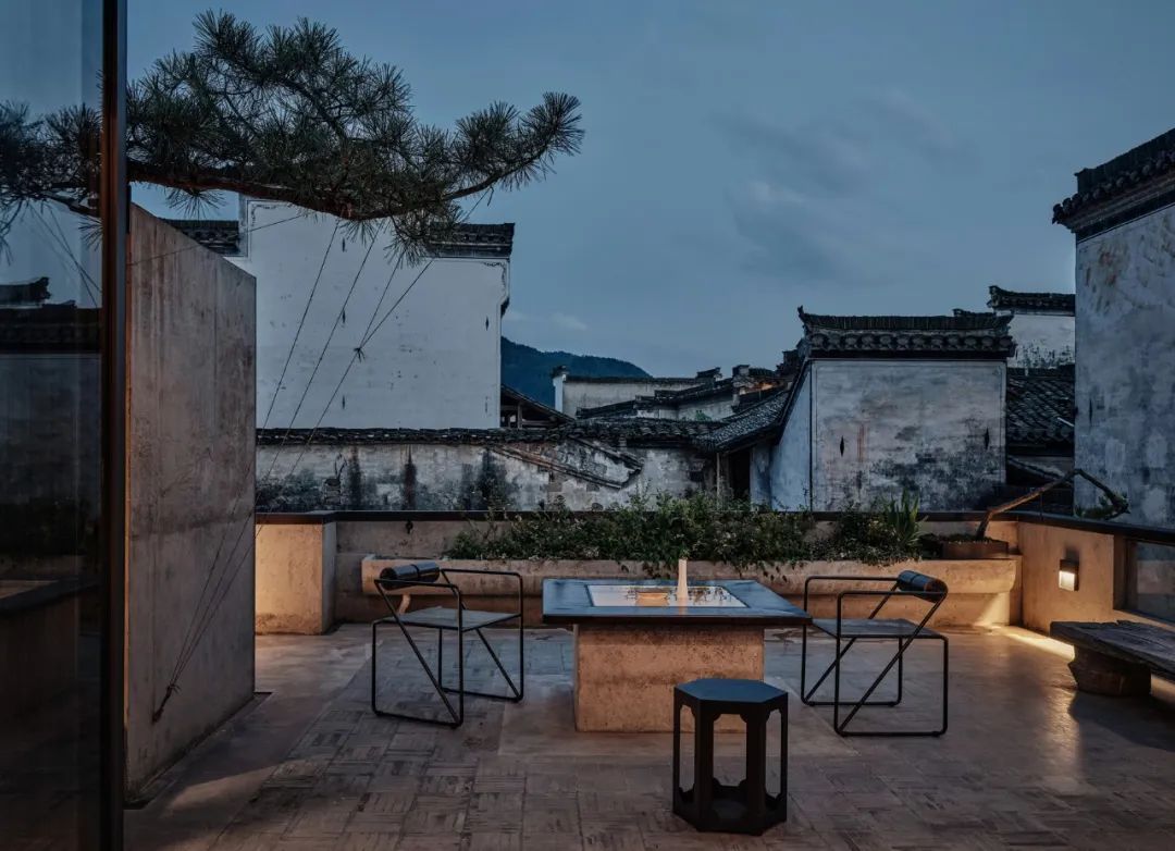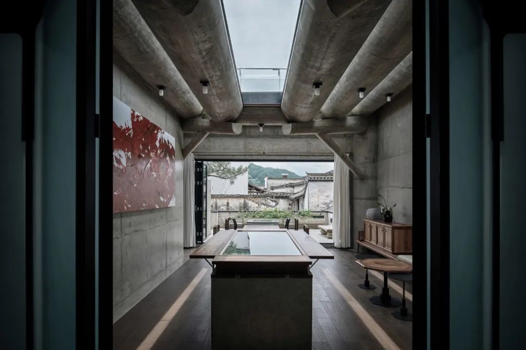 有趣的是,这栋3层建筑与文郁堂的古建遥相对望,一新一旧。但是,这栋建筑的“新”也是相对的,建筑师王灏从徽派建筑榫卯与梁柱中获得灵感,用混凝土复刻了传统四水归堂的制式。当你在二楼餐厅的空间中,传统的、现代的在这里交融,天光洒下,时间惬意而缓慢。