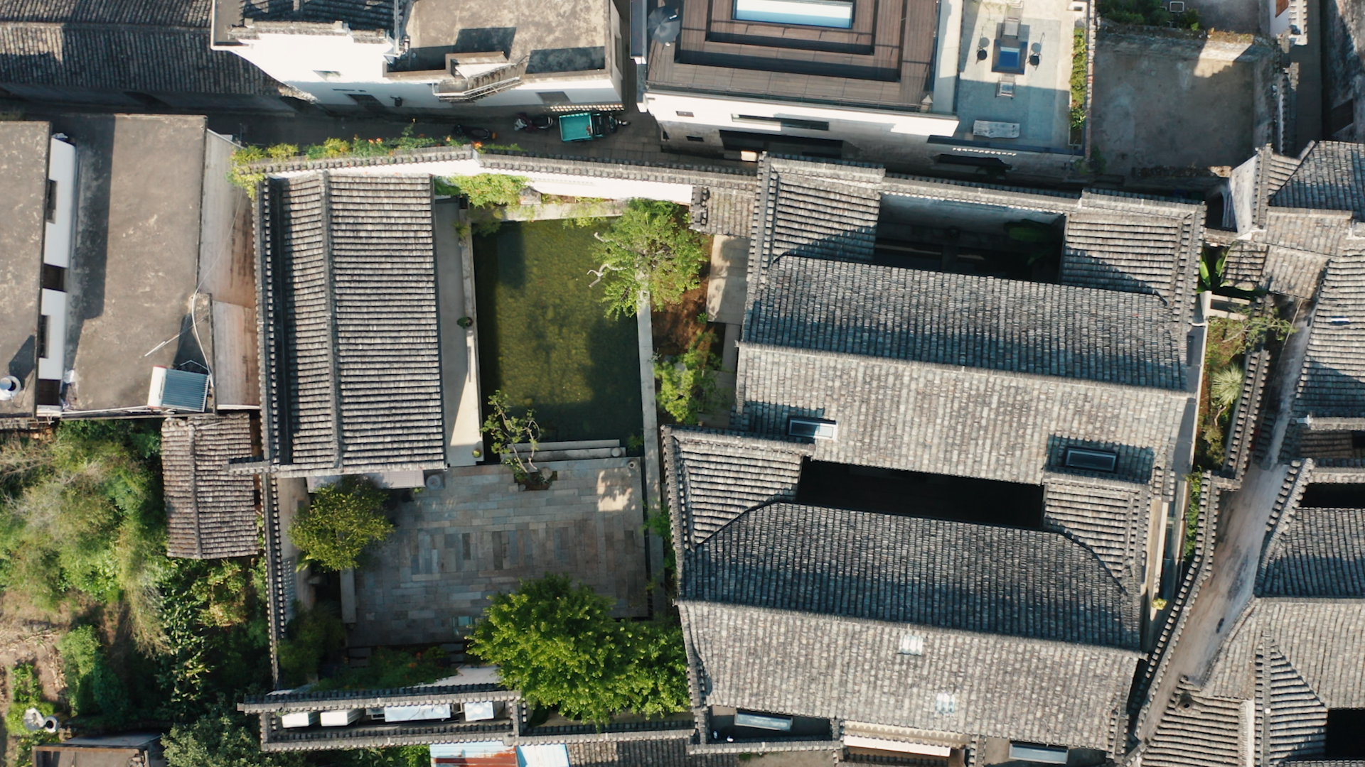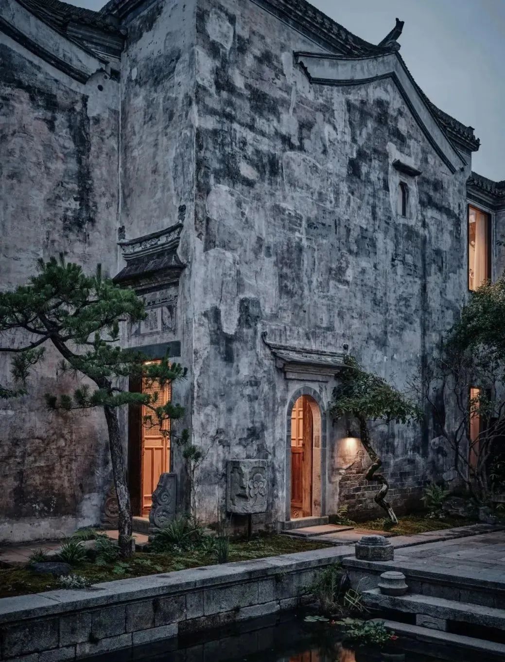 你从窄门踏入,大门墙壁上的斑驳痕迹清晰可见。推开一道旧木矮门,水潭、石板、松树、盆栽、青苔——一幅生动的旧时人家生活的场景。两栋穿越了500年历史的老房子,一前一后,恍如昨日出现在眼前。