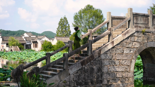 古村荷塘,旧日高墙,斑驳石桥,今夏荷花,此刻一一在我们眼前铺开。