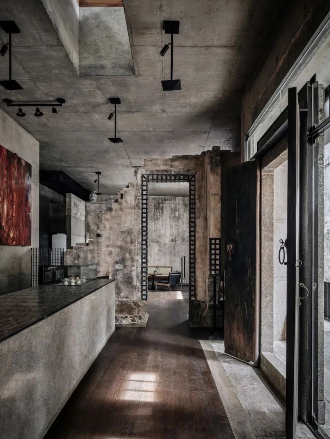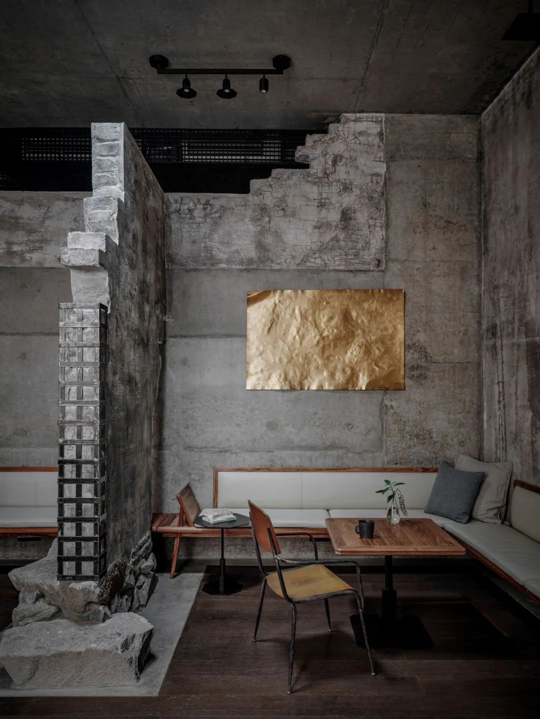 只是在旧墙壁上包裹上金属,废墟重生夹杂着工业感。就在这样的一个新生的废墟空间中,墙壁上的艺术品便起到了点睛作用,废墟对新生,粗粝对精细。
