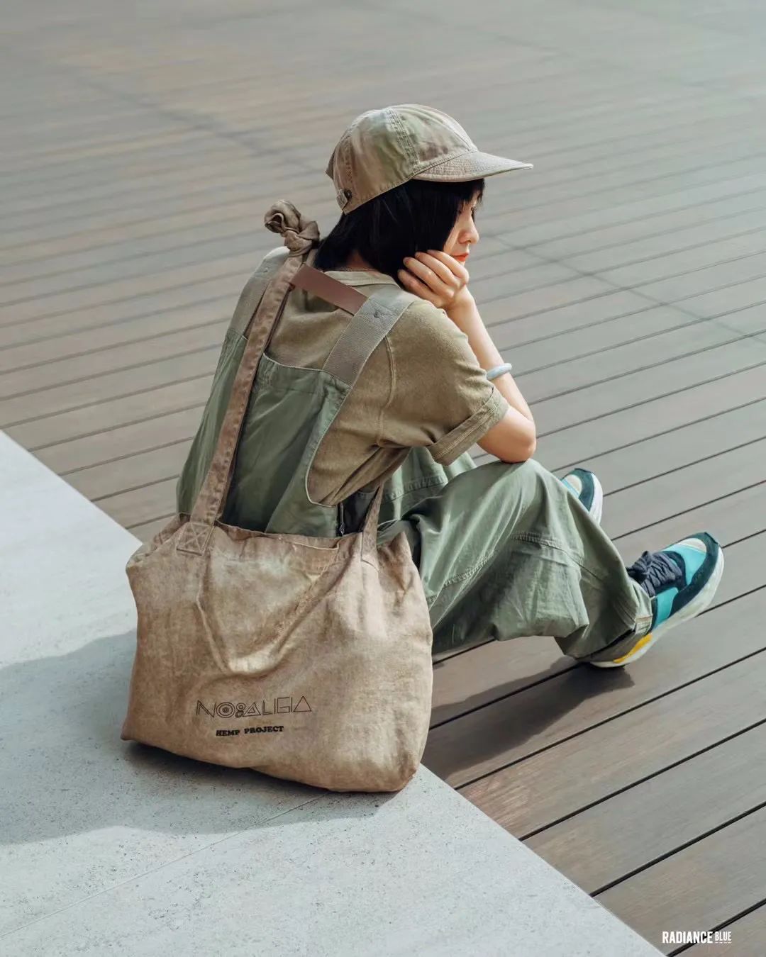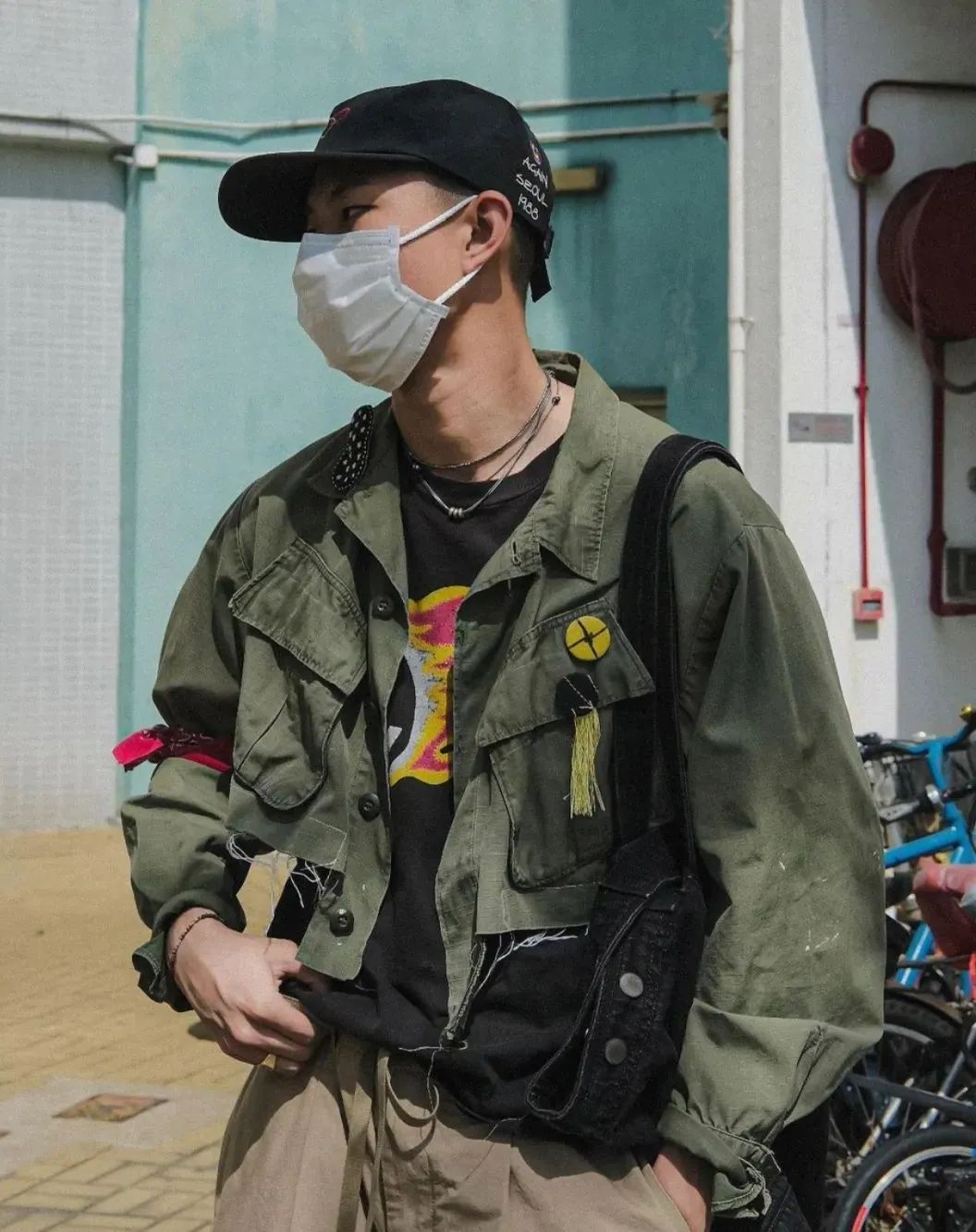 同色系的组合永远都不会错,万事起头难这句话放在这里根本就是笑话。先用拥有身上所有颜色的迷彩机修帽来定调,再把有同样染色效果的Nigel Cabourn日产线Tee和NOSALIGIA的汉麻包趴趴叠在Factory Dungaree上面,嗯,完事~