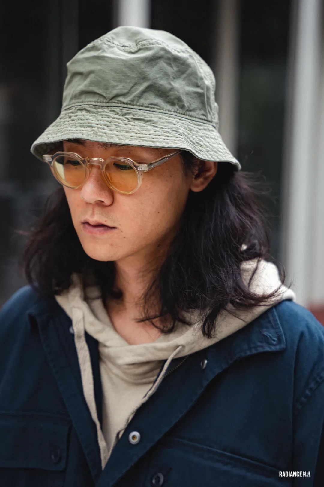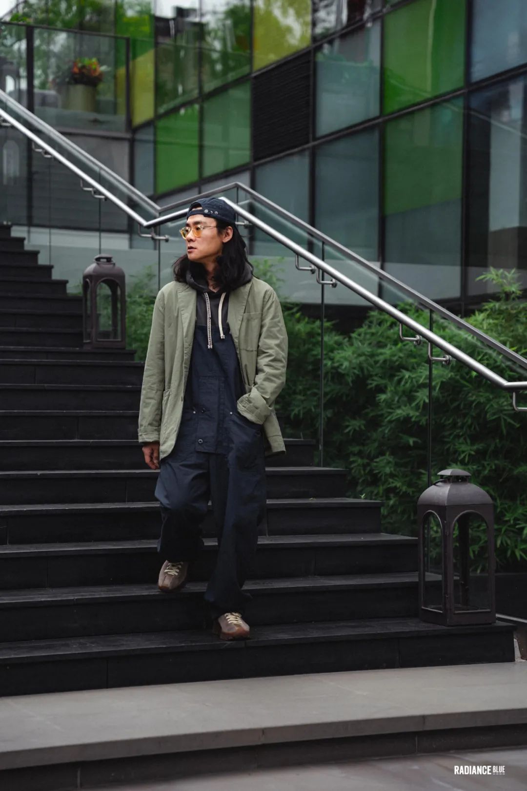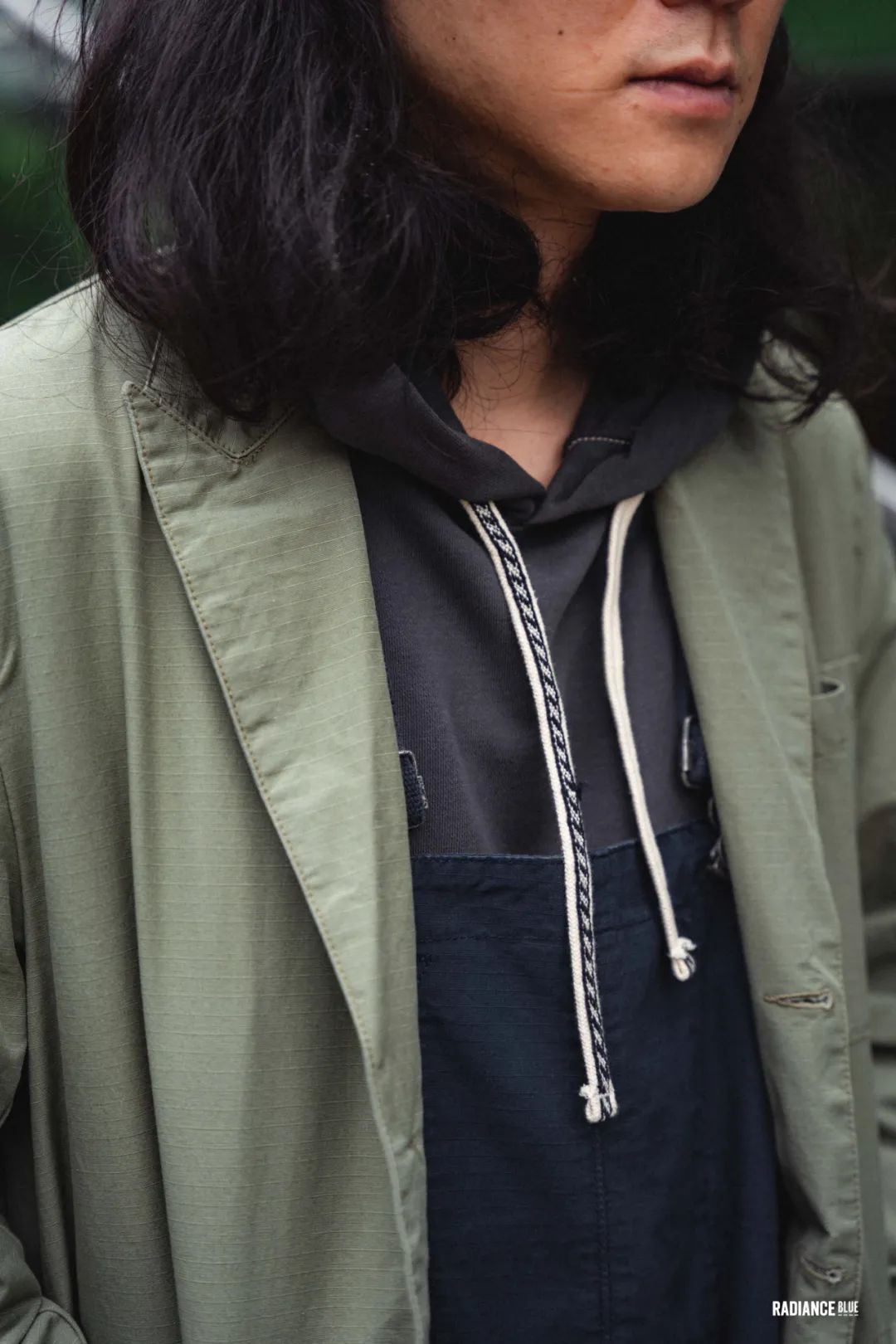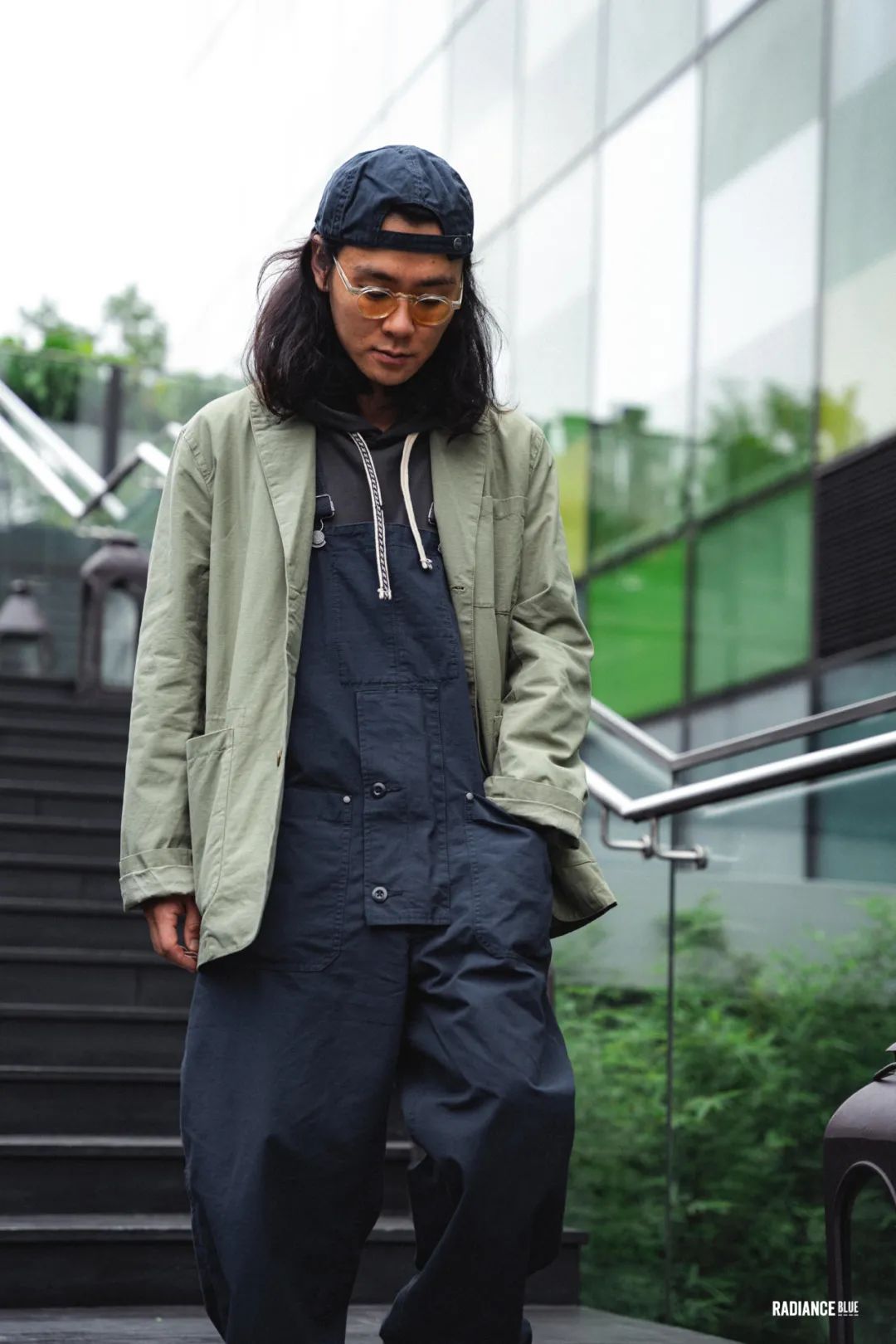 帕克先生选择先用INSULAiRE春夏系列里的卫衣作为内搭,把两条有刺绣花纹的拉绳露出来,配上同样来自LYBRO的Factory Dungaree,外搭Peak Blazer让卫衣的帽子自然地摆在后面,把Mechanics Cap反戴除了突出休闲感以外,让整个人都更显精神。