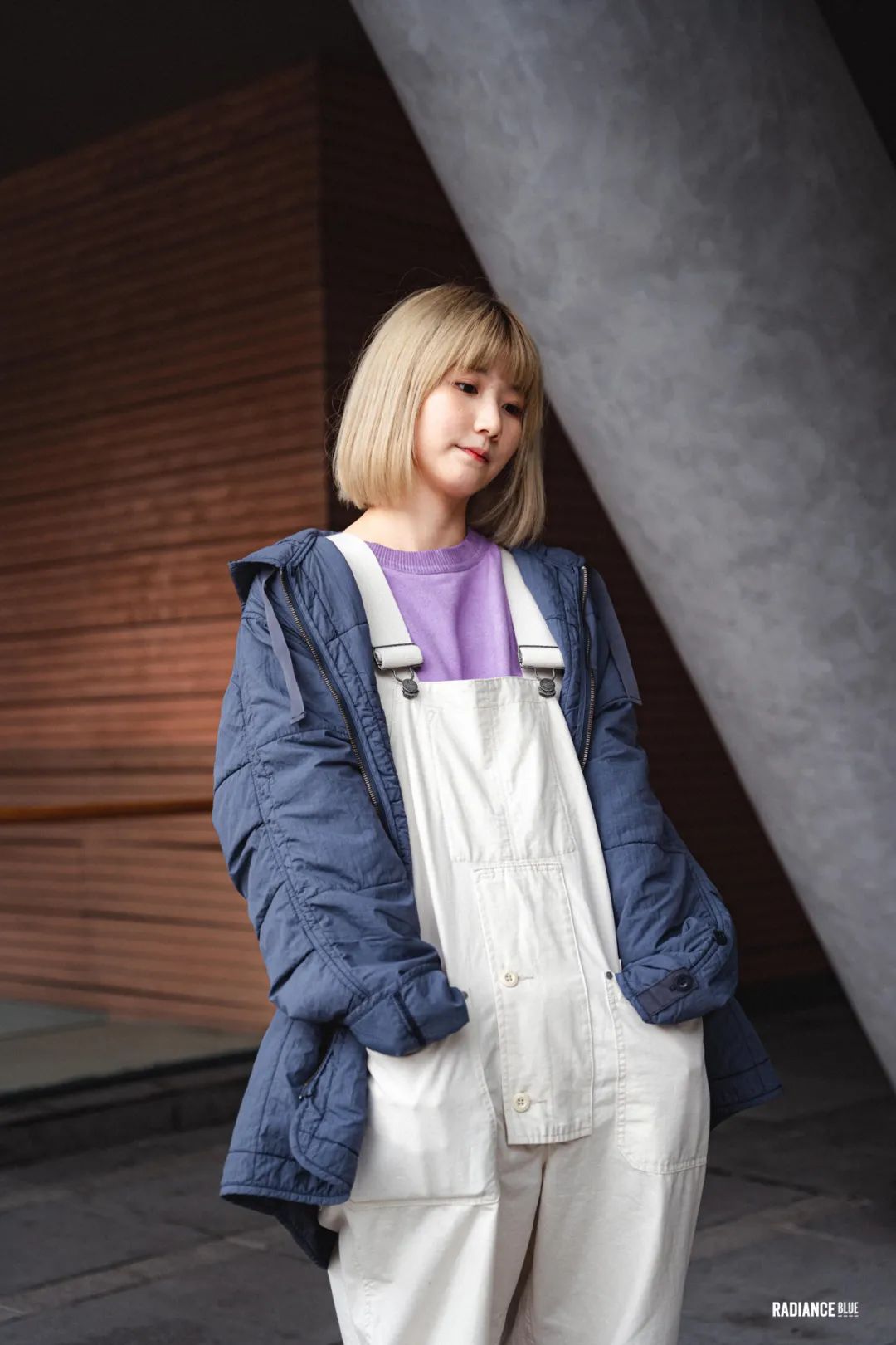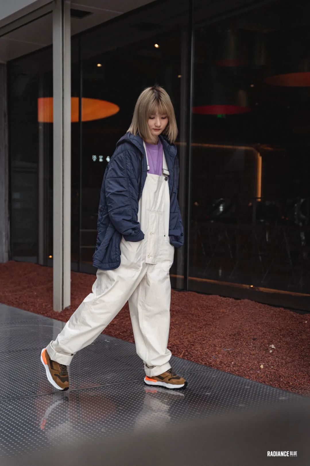 在米白色的Factory Dungaree外面套上以美军M65内胆为灵感来源的Quilted Parka,外套的尼龙水洗效果与背带裤做旧的扣具形成强烈的整体感,而Mihara x Nigel Cabourn运动鞋的亮橙色跟NOSALIGIA CANAPA Tee的粉紫色则让一身的搭配更有亮点~