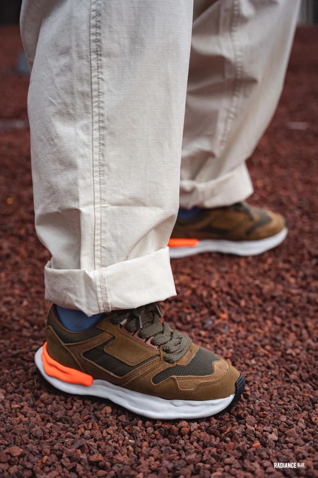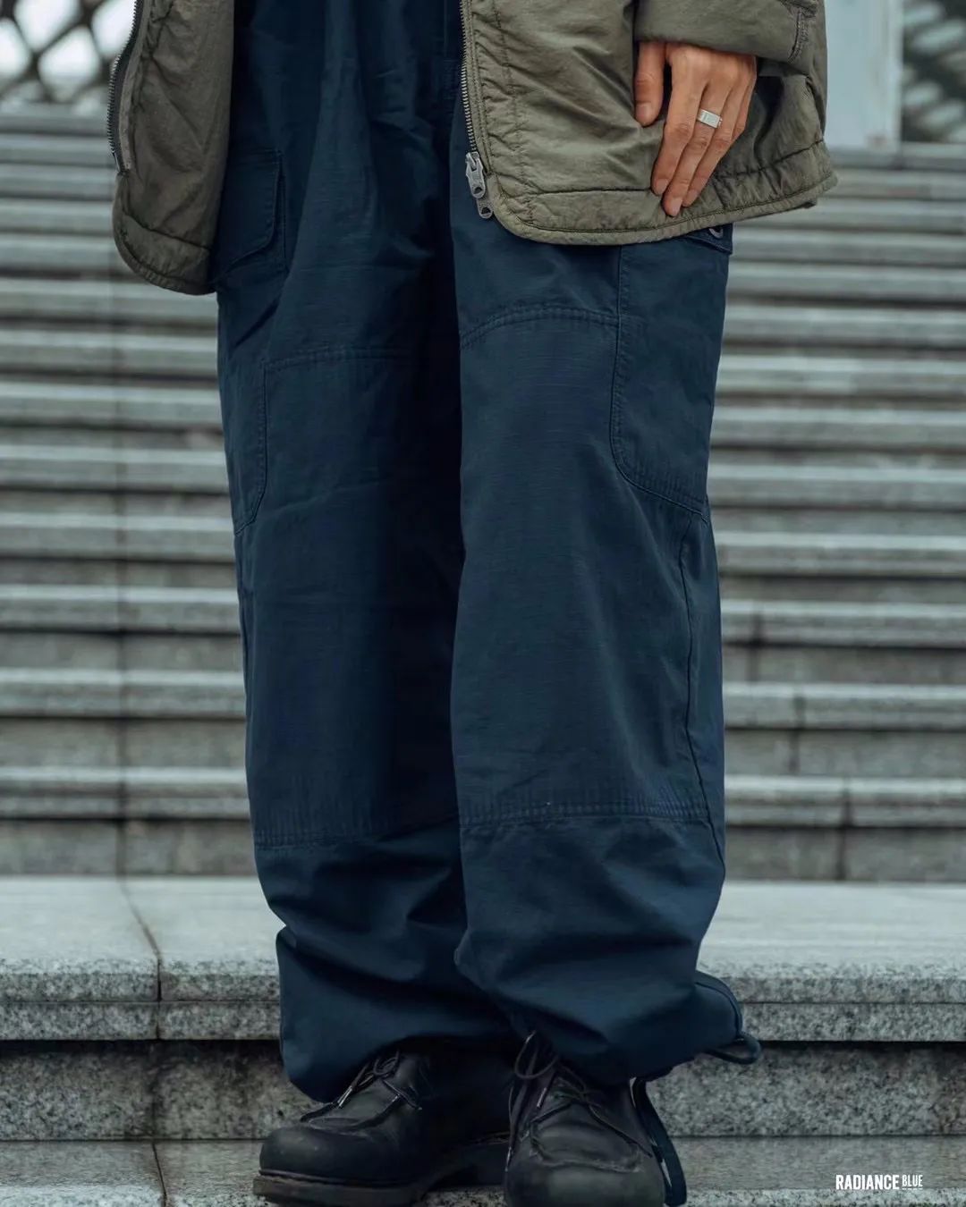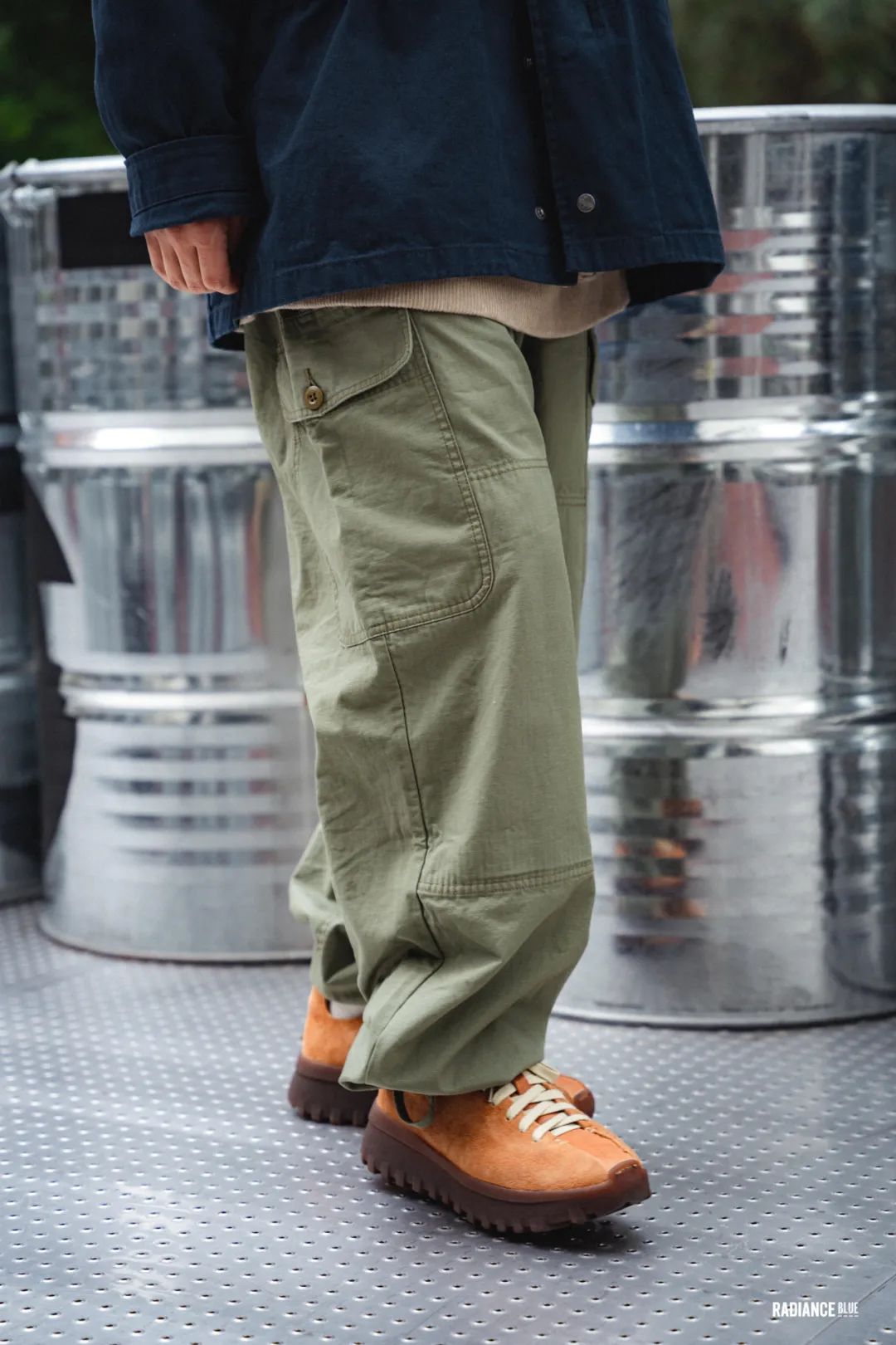 用绑带缩口后的Piped Pant使裤子变得更像一个汽球,Ripstop面料的肌理轻易地显现在裤子上,而这种略浅的军绿色与FEIT Latex Walker也能和谐地组合在一起。