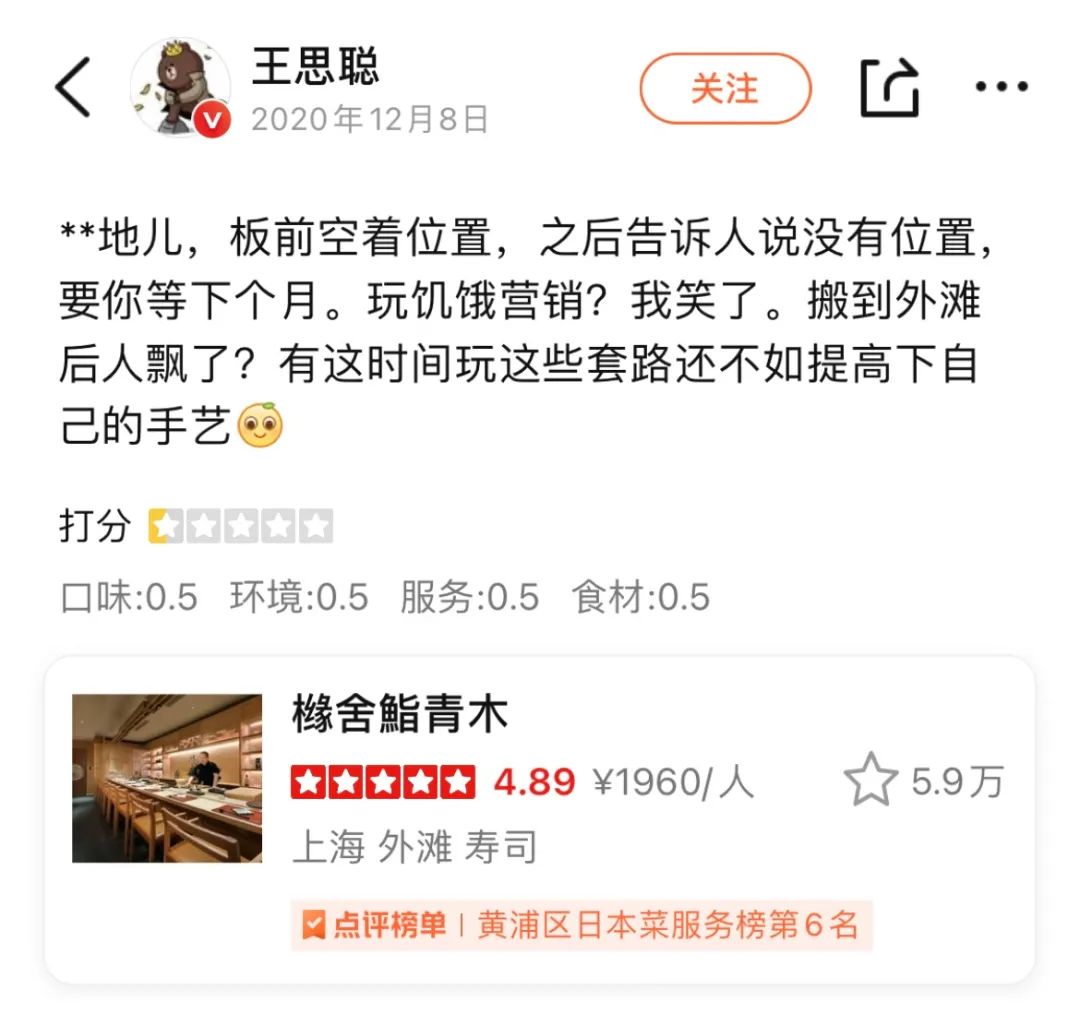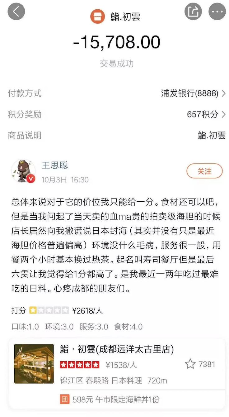上周在成都,聊到那家很贵的鮨初雲,成都朋友说,自从王思聪吃了一万多,给了一星差评之后,他家生意变更好了。