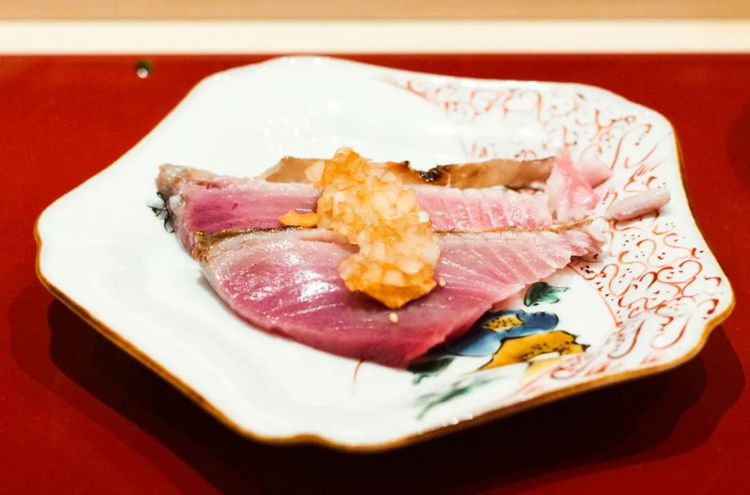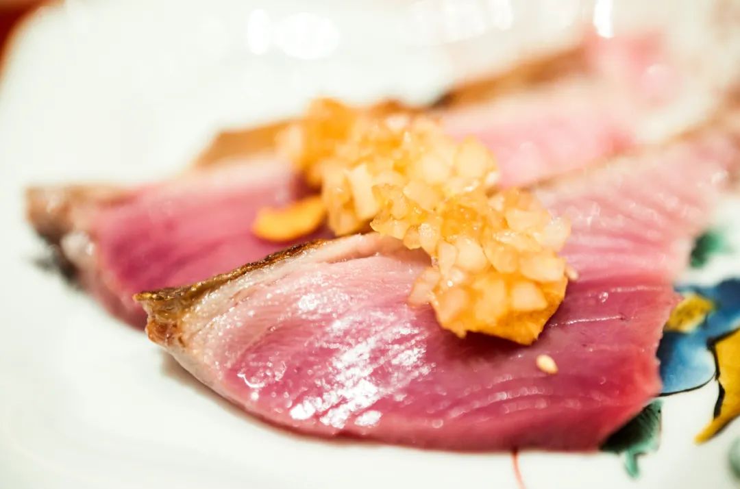 生蒜片化解这季鲣鱼过多的油度,又用炒软的洋葱迎合其鲜甜。