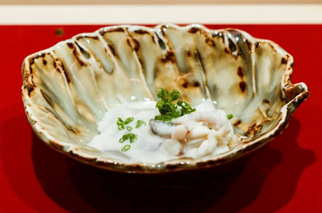 河豚皮通常醋渍冷吃,青木用未成型的白子搭配,入口绵密鲜滑,奶香四溢。