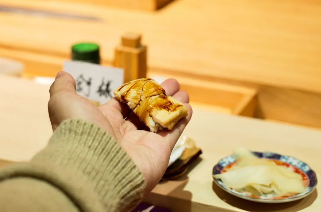 在上桌之前,用叶子包裹在炭火上微微炙烤,趁热握成寿司,鳗鱼的肥嫩和松软被小心翼翼的呈现。
