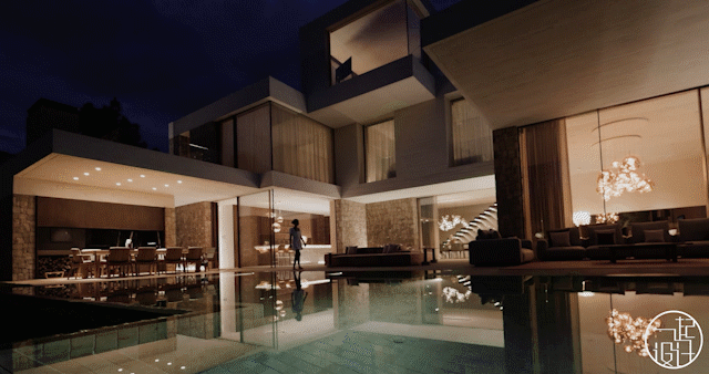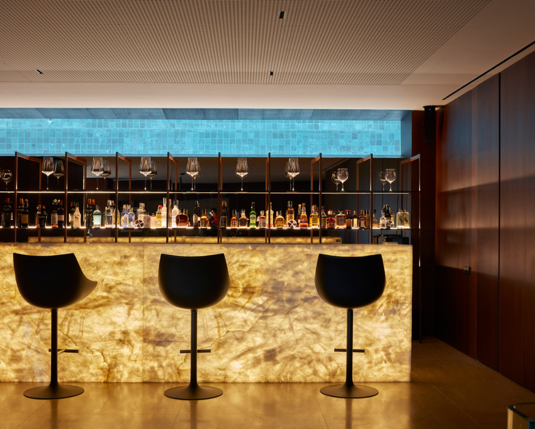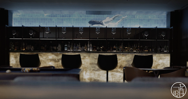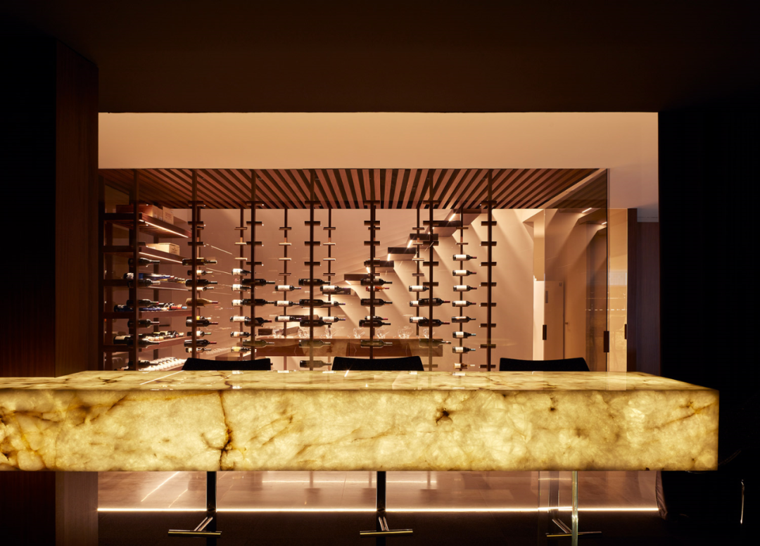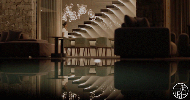 酒吧的吧台,在灯光的照耀下形成透光效果,显得更加富有艺术气息,酒架上方的玻璃天窗与室外泳池结合,形成内外之间的互动。
