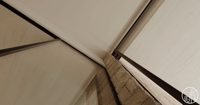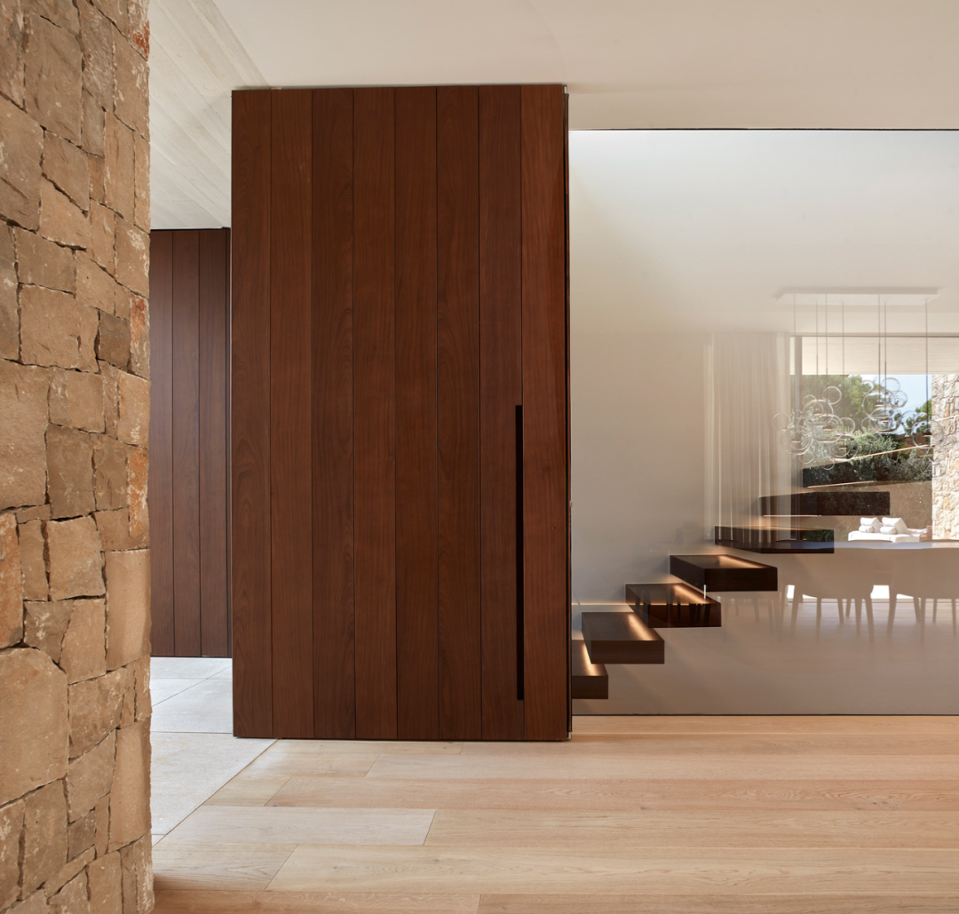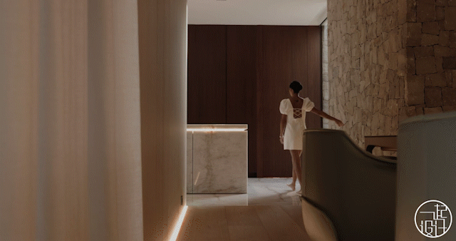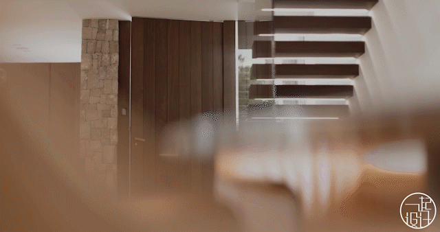 推开通顶的木门,整个面与旁边的玻璃隔墙连成一体,展现一虚一实的质感对比▽