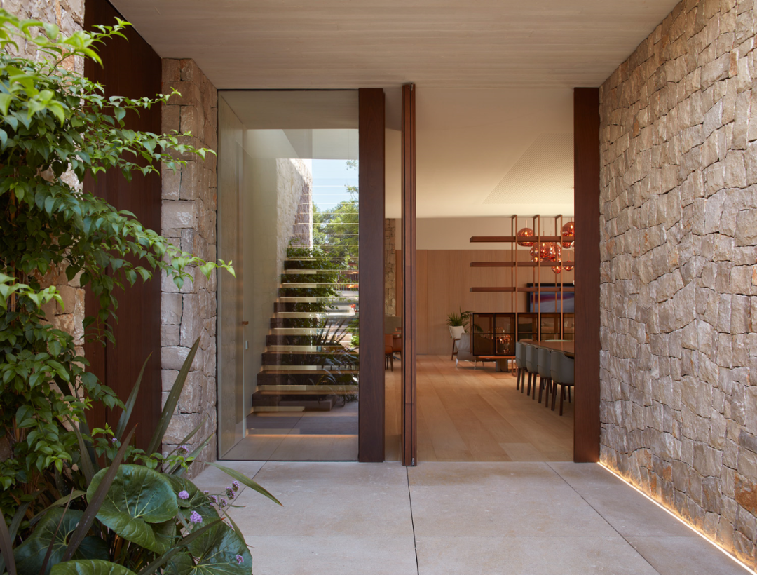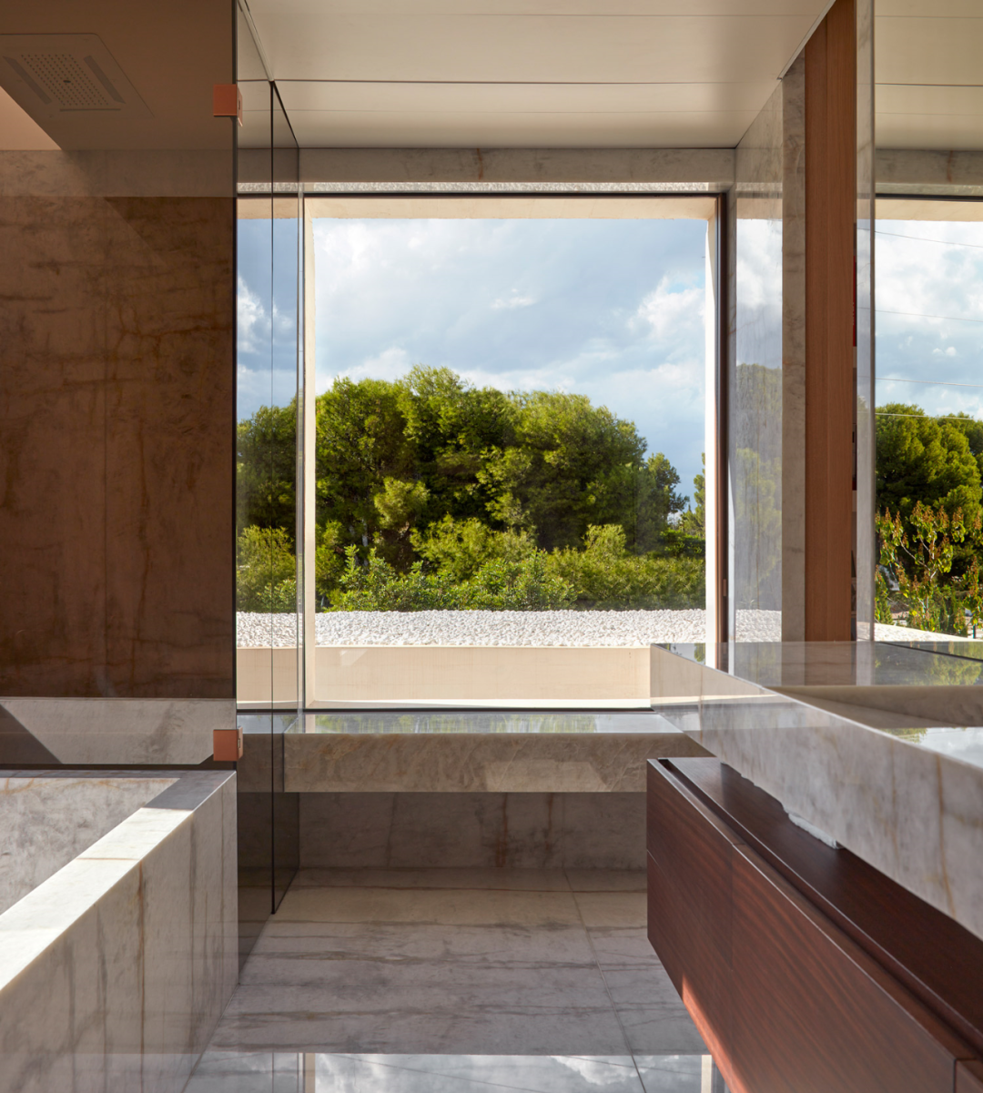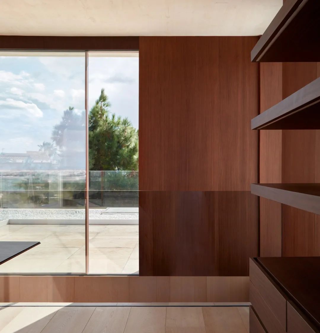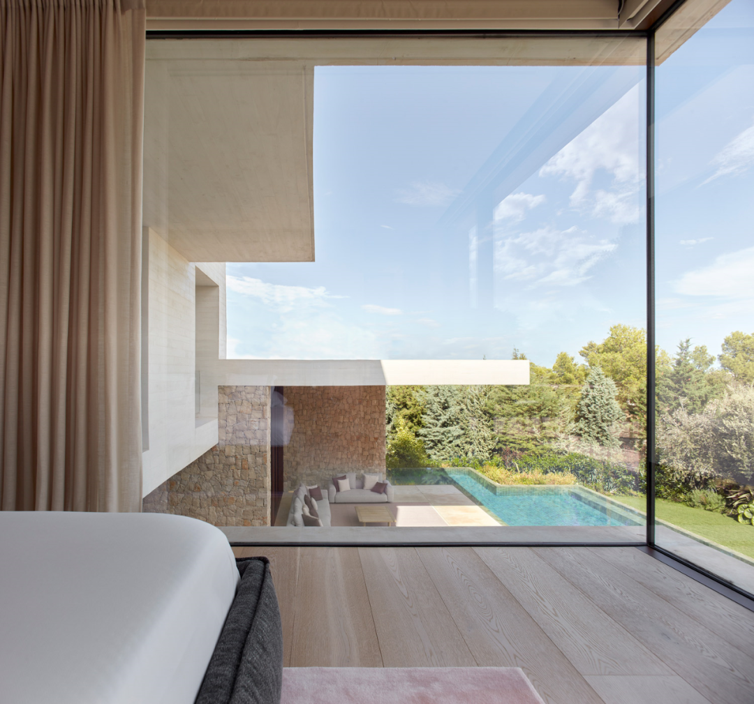 设计师还在墙壁处置入玻璃移门,既能满足采光与通风需求,也能与室外泳池联系在一起。
