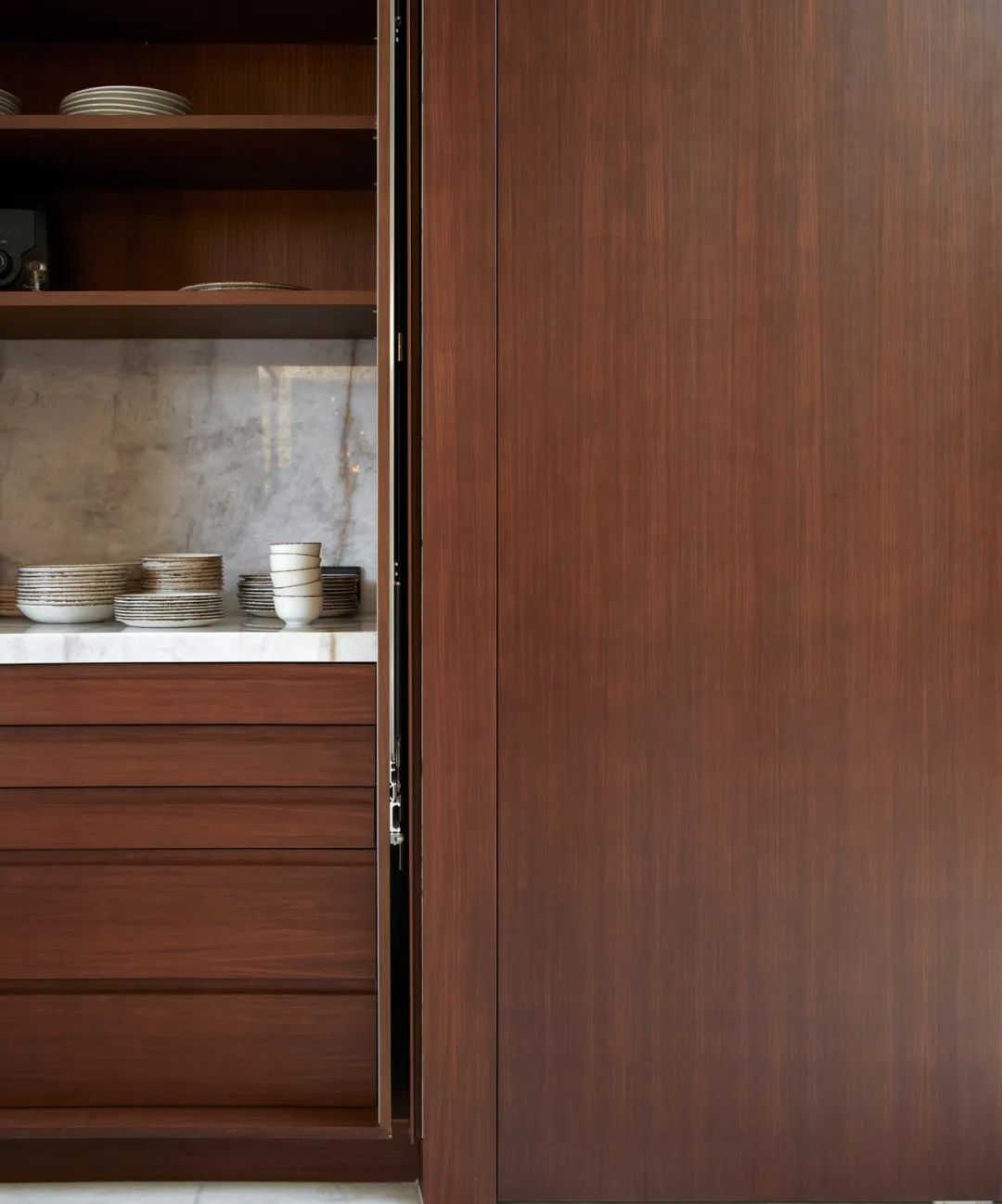 隐藏式橱柜门的设计,巧妙且不占用空间,与花园相邻的区域可以看到的室外景观▽