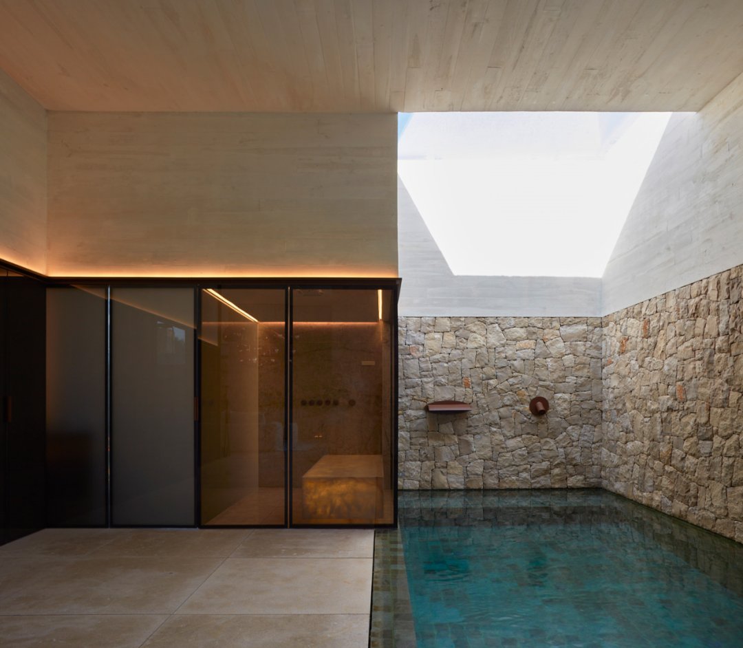 与起居室相邻的区域是一个室内恒温泳池和 SPA 的设计▽