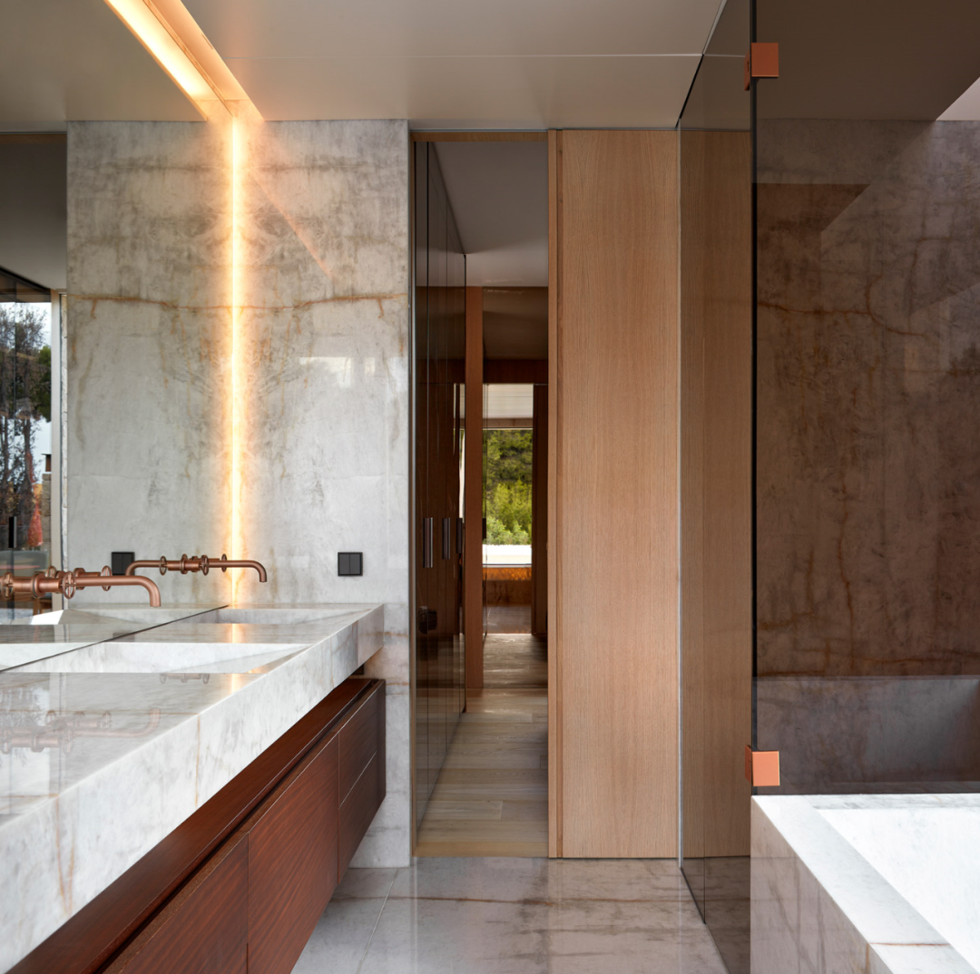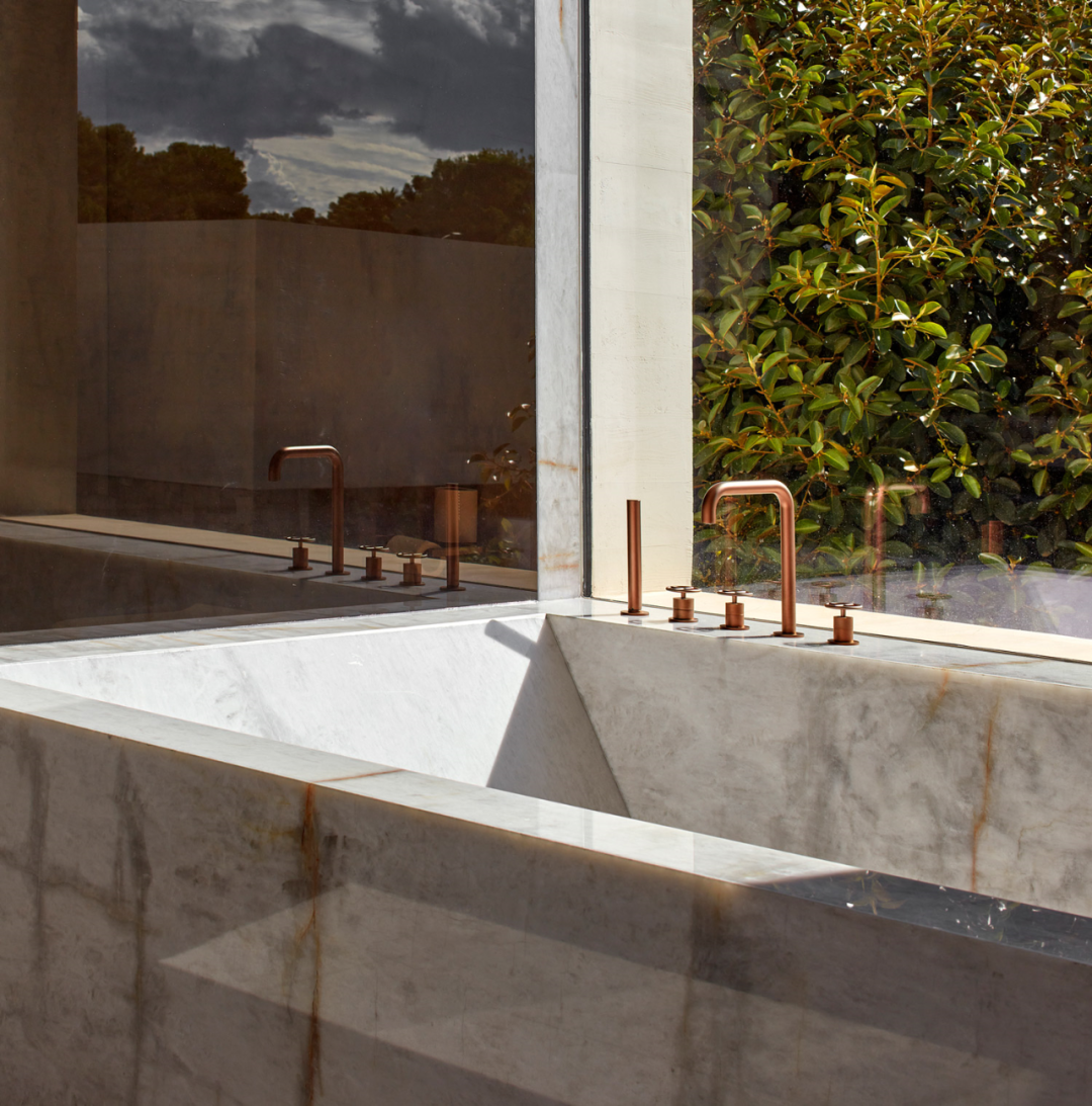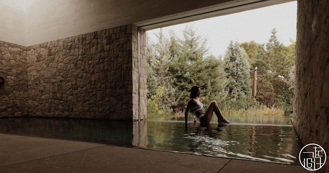 泳池边的浴缸,全石材的空间打造质感厚重,尽显艺术之美▽