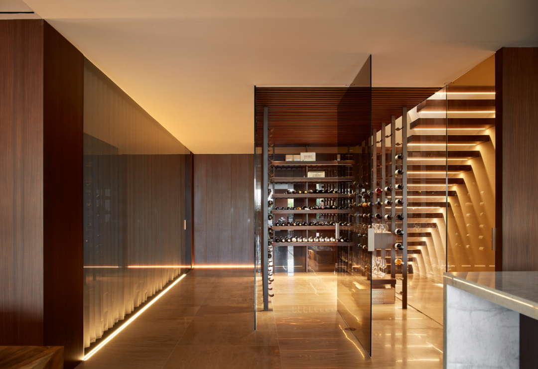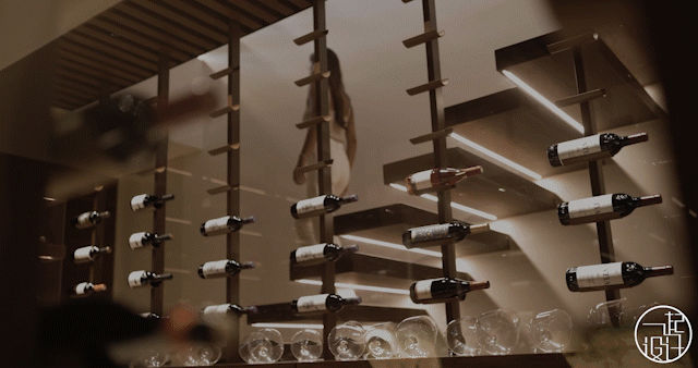 恒温酒窖位于楼梯的一侧,作为隔断与陈列展示的存在▽
