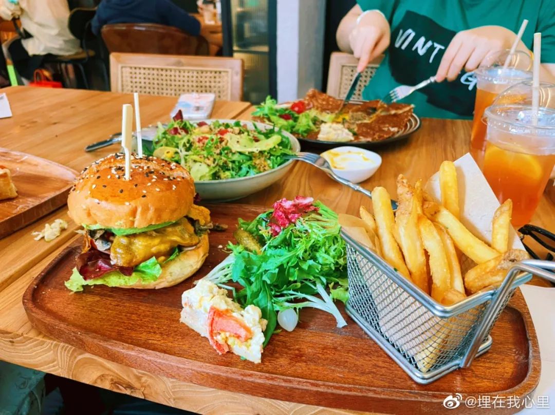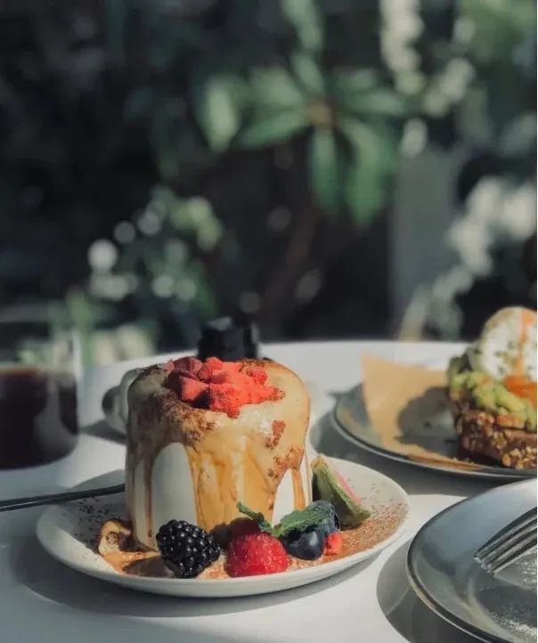 店铺一共有两层,楼上楼下是不同风格,楼下是绿野仙踪,被绿植和鲜花所围绕,带着自家毛孩子在这就餐有种爱丽丝梦游仙境的感觉,氛围感满分。菜单选择有很多,招牌的舒芙蕾松饼、可爱的杯子蛋糕、磅蛋糕都值得一尝。