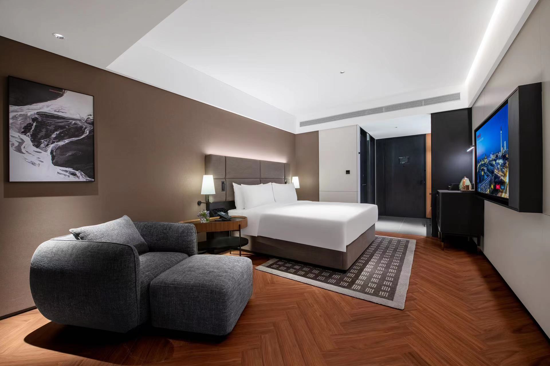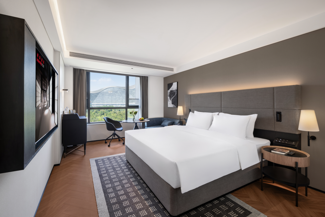 整体房型系统包含了城际大床房、城际行政大床房、城际豪华大床房、城际套房等,面积从25㎡到50㎡不等,大家可根据实际需求来去预定。此外,平时办理入住和退房仅需30秒,高效且安全。如果临时有快递和文件的话,店内的智能机器人也能够随时提供送物服务。