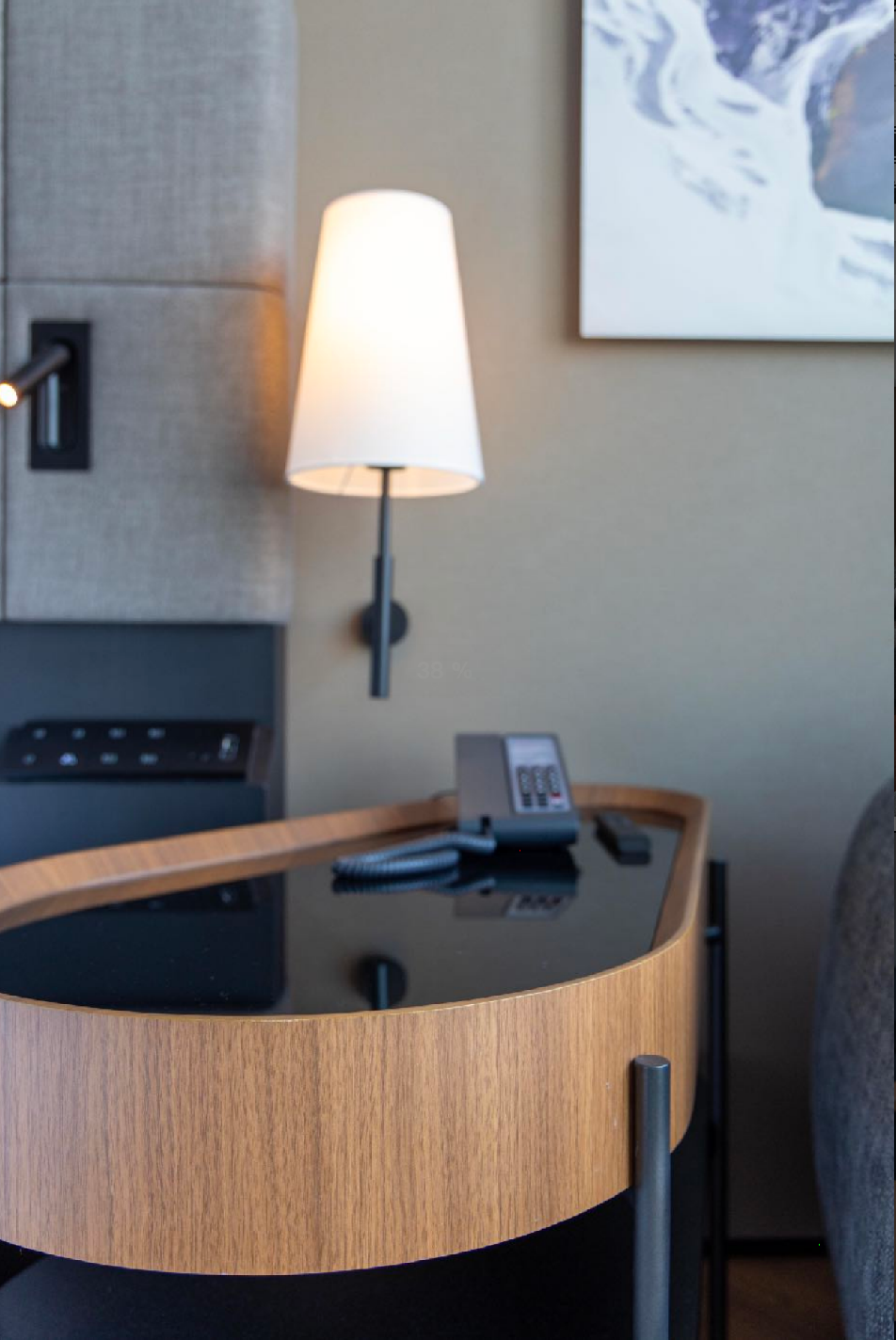正如大堂与公共区域的 Diana 灯具,作为经典的包豪斯设计单品,曾经在1992年奥运会前夕被用作照亮巴塞罗那市长的办公室。它不仅能够通过灯柱去随时调节高低从而营造出不同的氛围之光,同时亚麻色的灯罩也尽显极简之美。