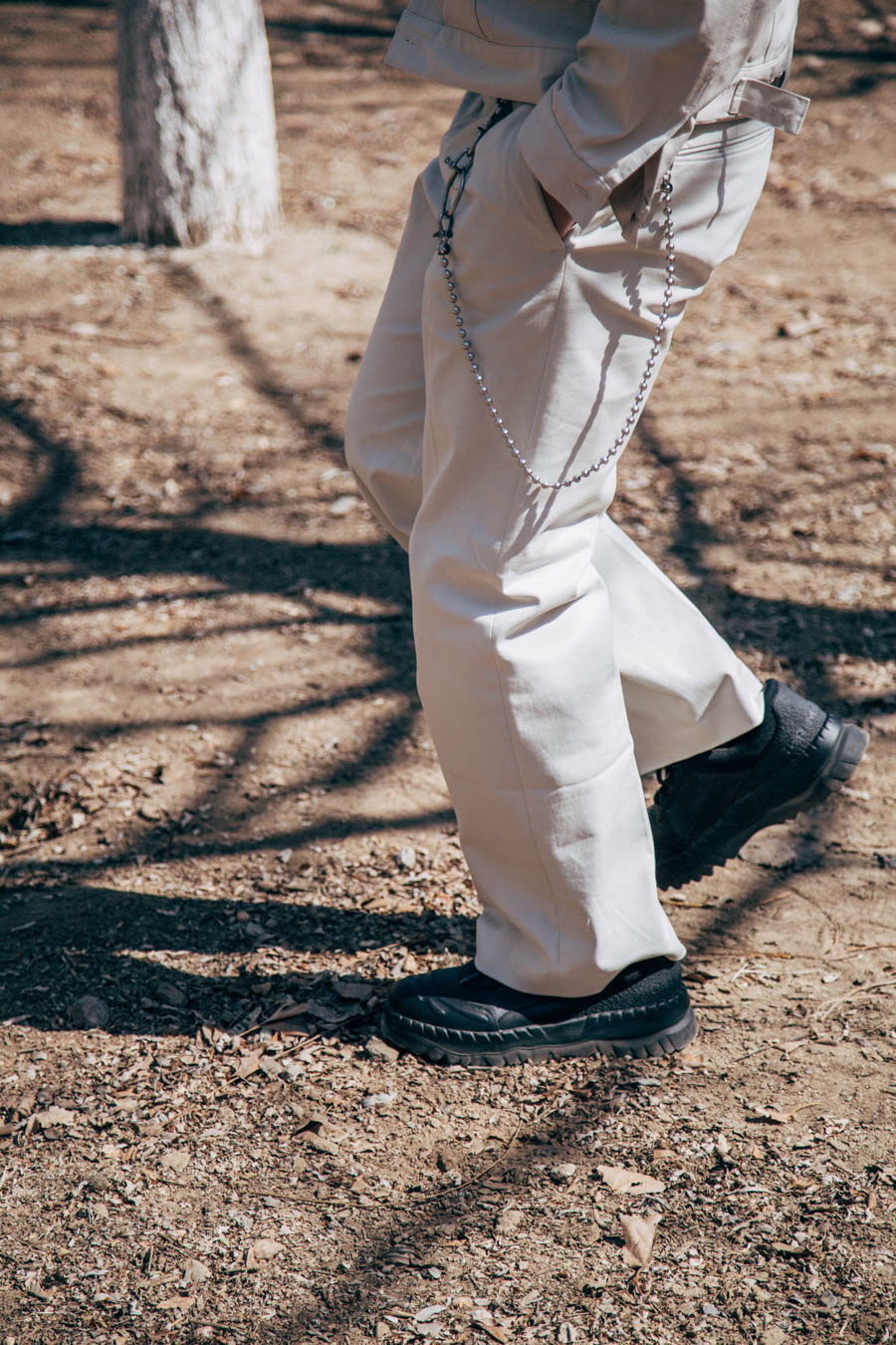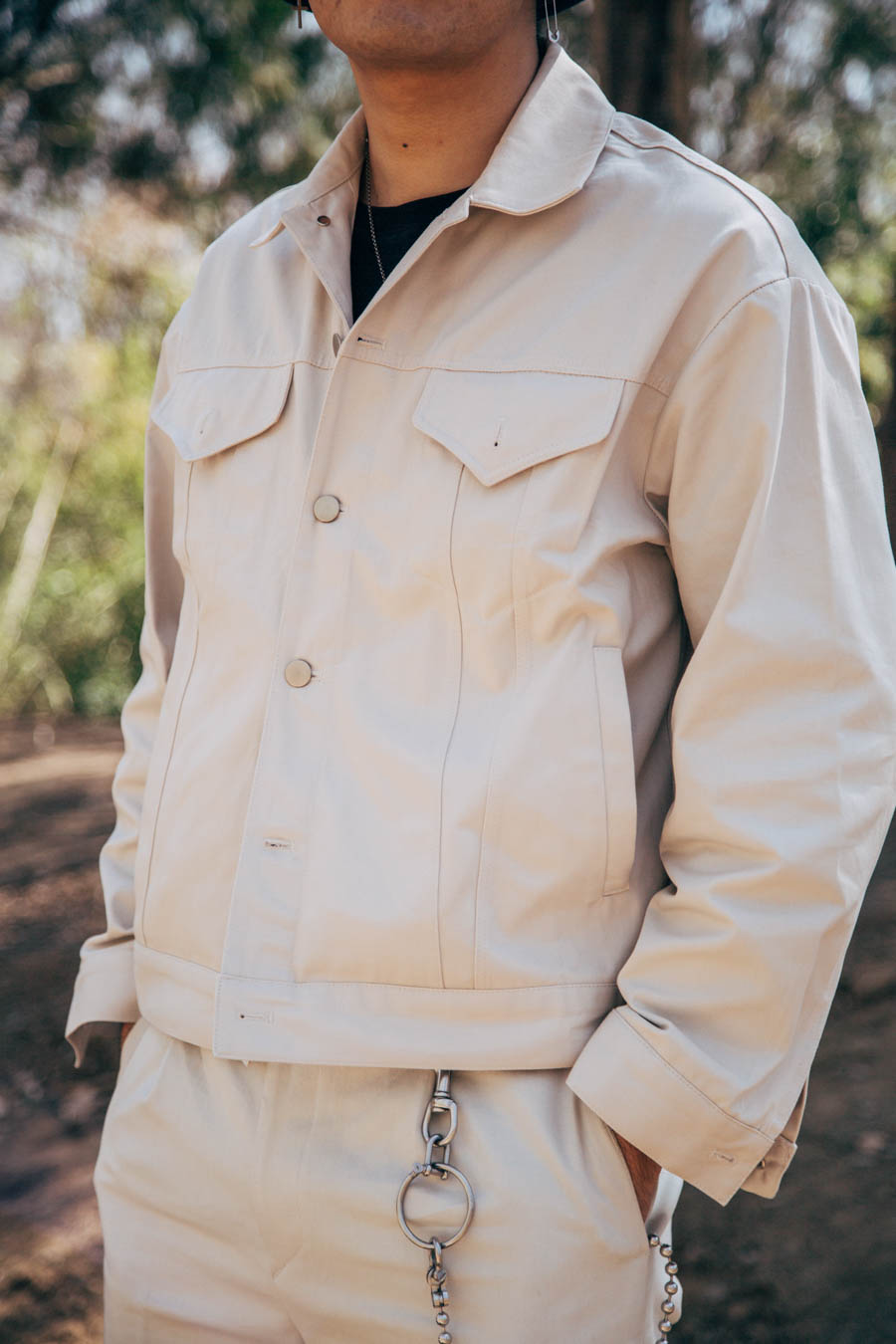 另外,在剪裁上大家同样可以参考此种方案,下身廓形感的对折堆叠工装裤,上身选择短款的夹克,这样从视觉感上可以拉伸腿部线条,加上其它细节的点缀,就算是一身白,也可以让它的造型感很丰富。