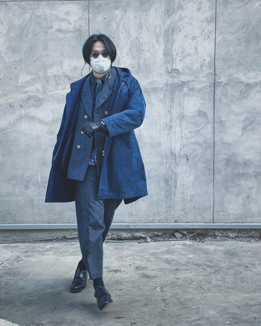 除去民俗蓝染的品牌外,最常穿的自然是自家的洋裁工装品牌MotivMfg,但我往往只能选择“黑白灰”的单品来硬钻空,借机也很想吐槽一下自己人,咋就不能多出些蓝色类单品呢?