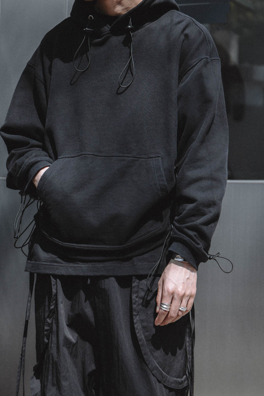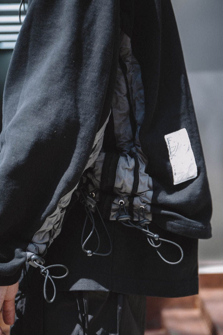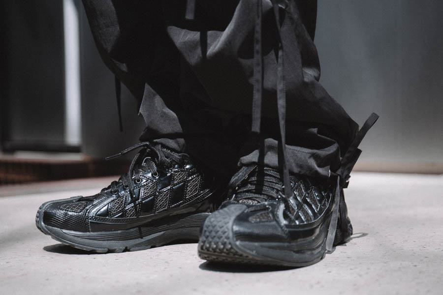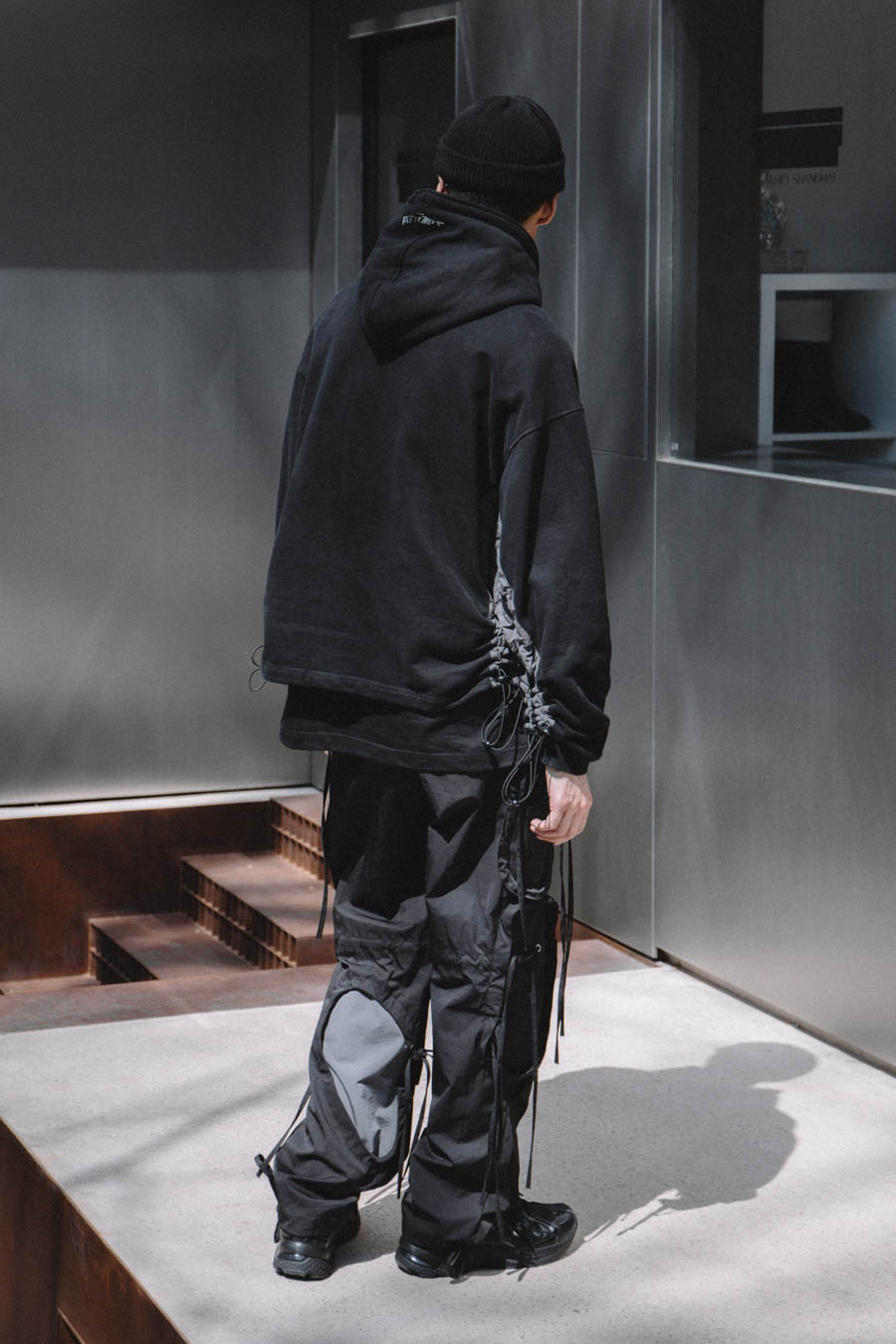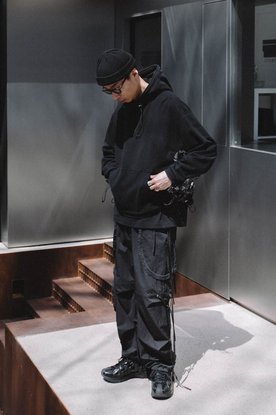 Arvintt:我在one tone搭配上会注重层次和鞋子配饰这些细节。今天穿搭灵感主要配合鞋子和裤子的搭配衍生开来,同样的黑色系,搭配不同面料的材质,表现出不同效果,衣服的抽绳和裤子的飘带很好的契合。
