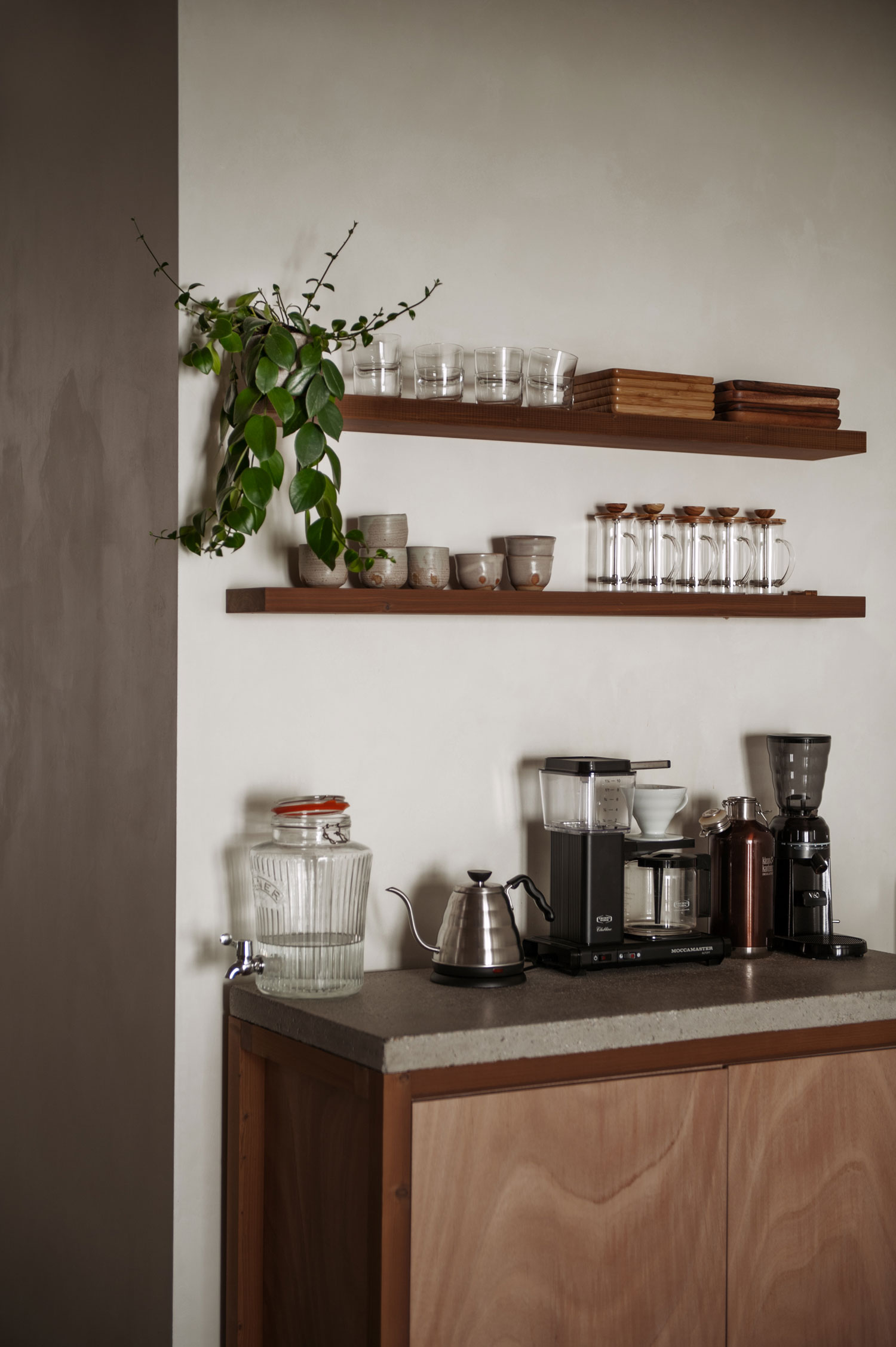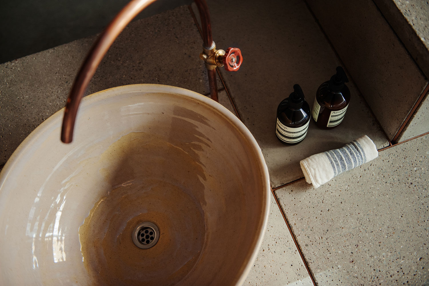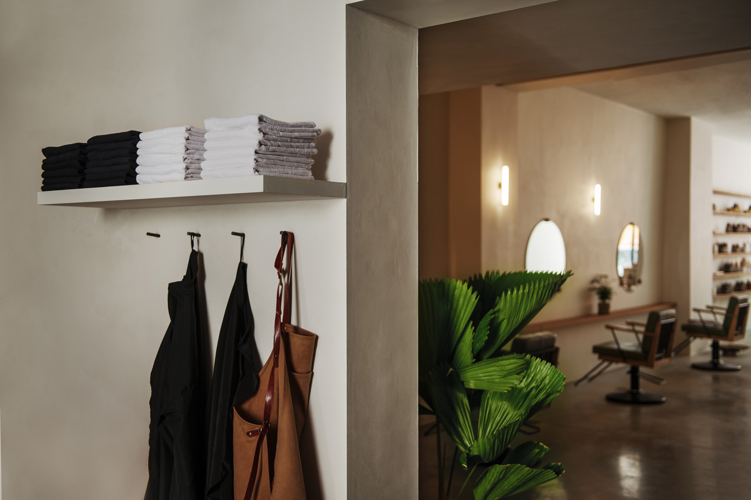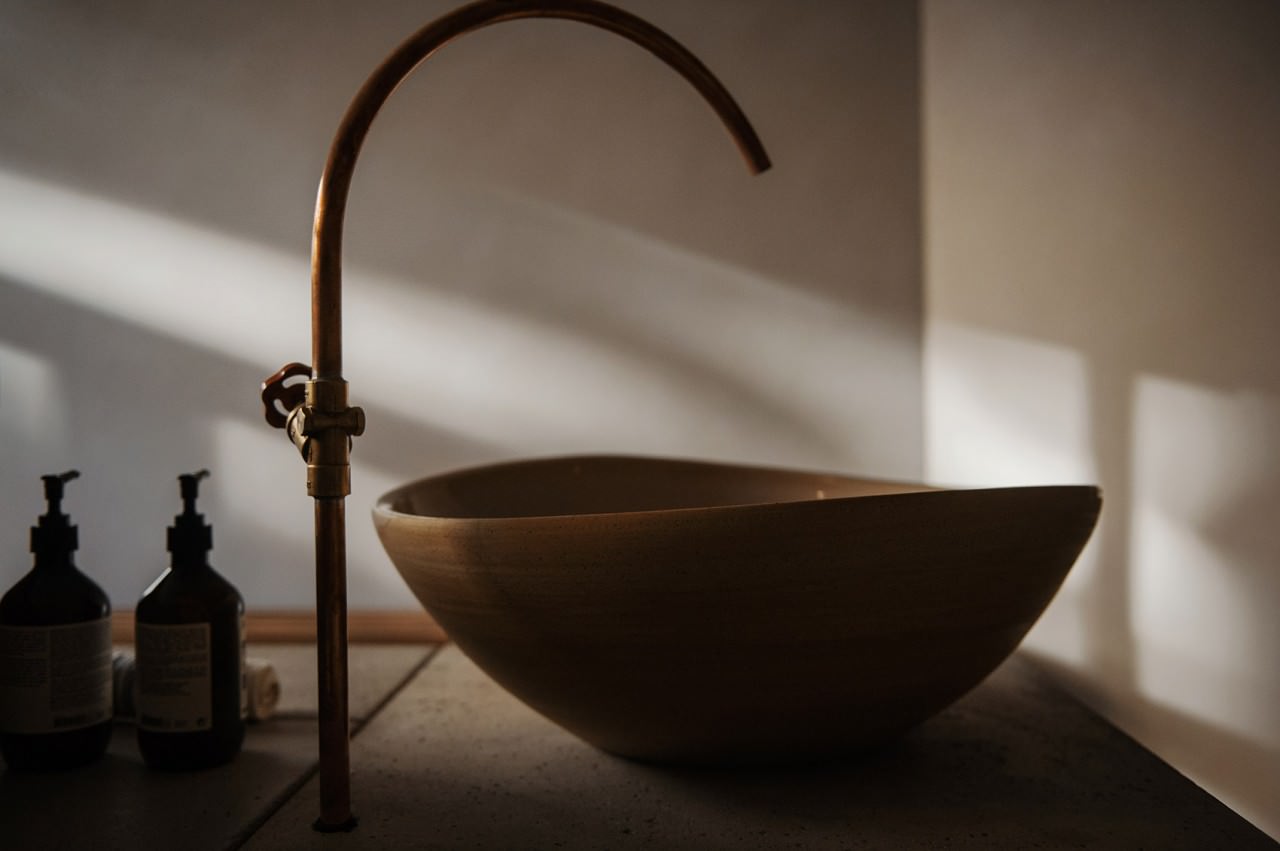 至于整个工作室的美学呈现则以东方禅学理念,结合西方极简设计为主。清新绿植与自然阳光的搭配在室内随处可见。而特别打造的极简复古座椅则透露着若隐若现的军事风格。室内其他类型的复古家具设计也比比皆是,专门定制的陶瓷洗水盆则呈现出更加粗旷的质感。