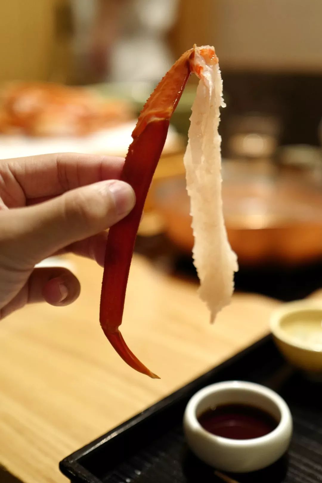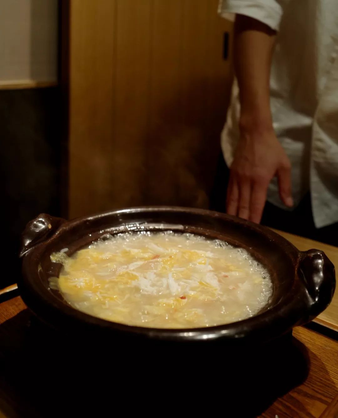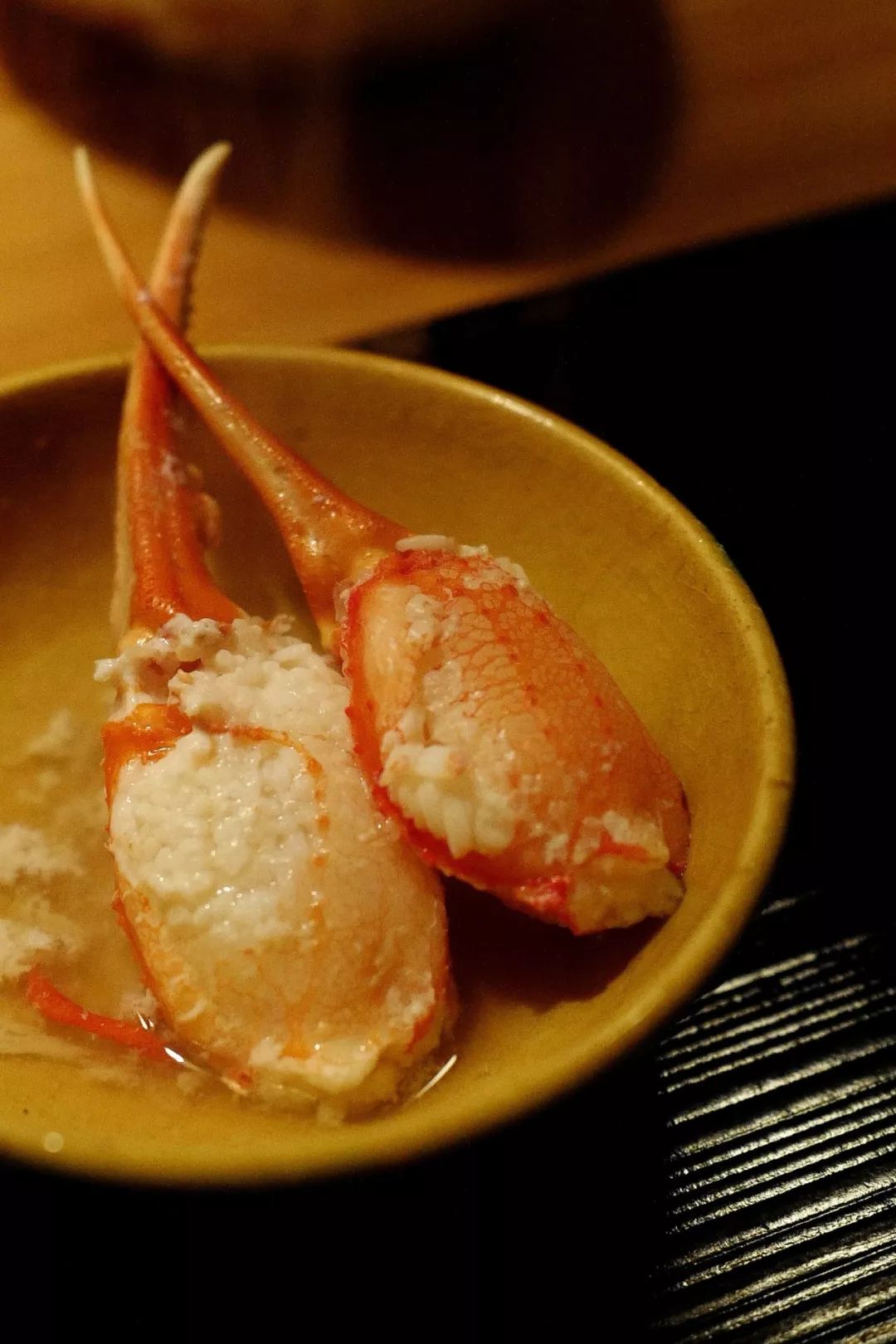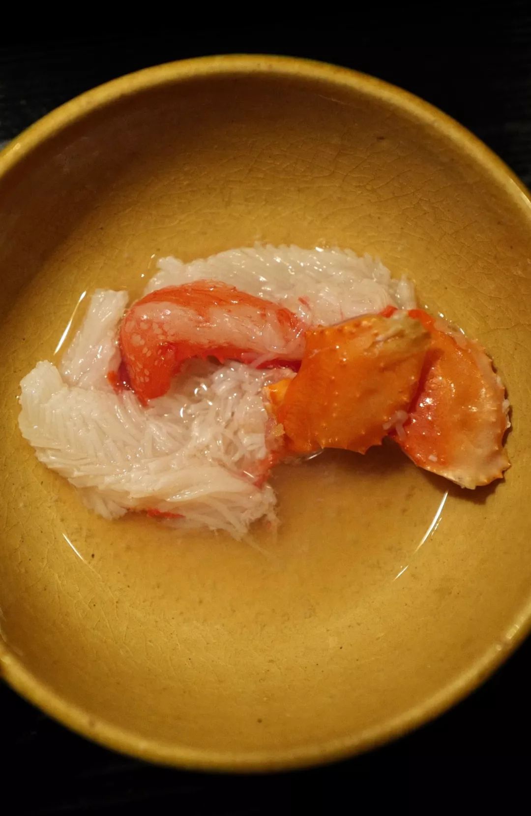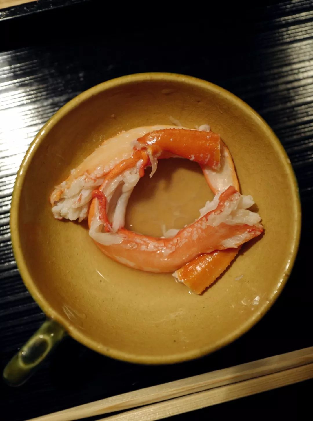 放入清淡微温的出汁,稍待数秒便捞出。经过汆烫的蟹腿,也是近乎白描的状态,在刺身的基础上只增加了些许温度,无损滑嫩的口感。