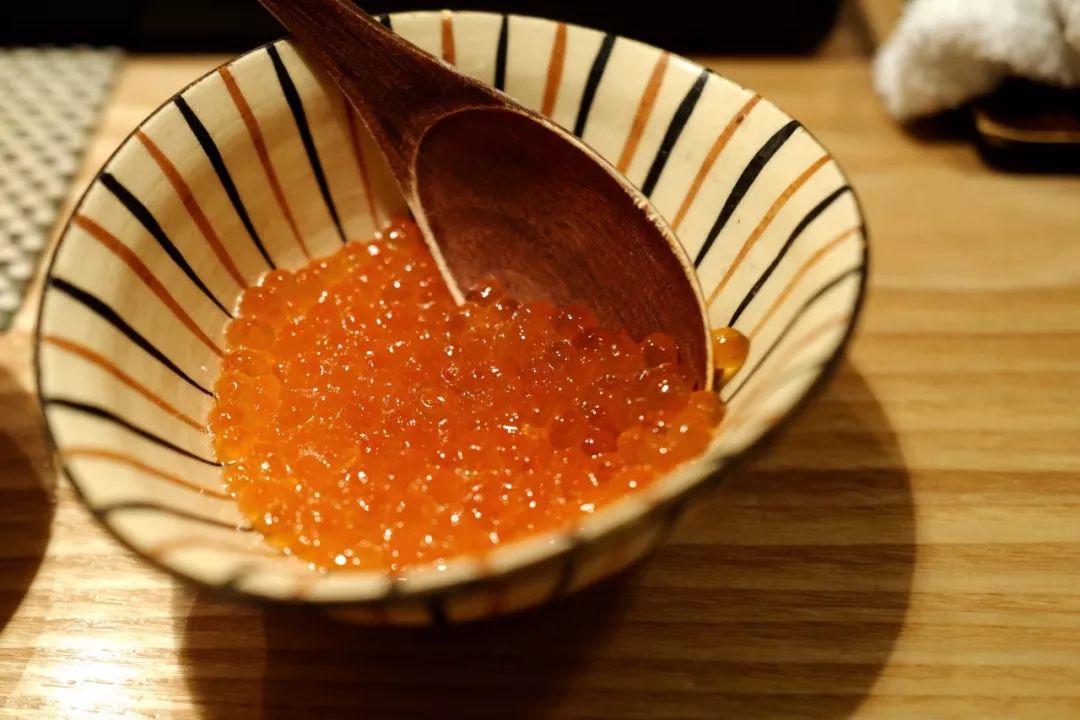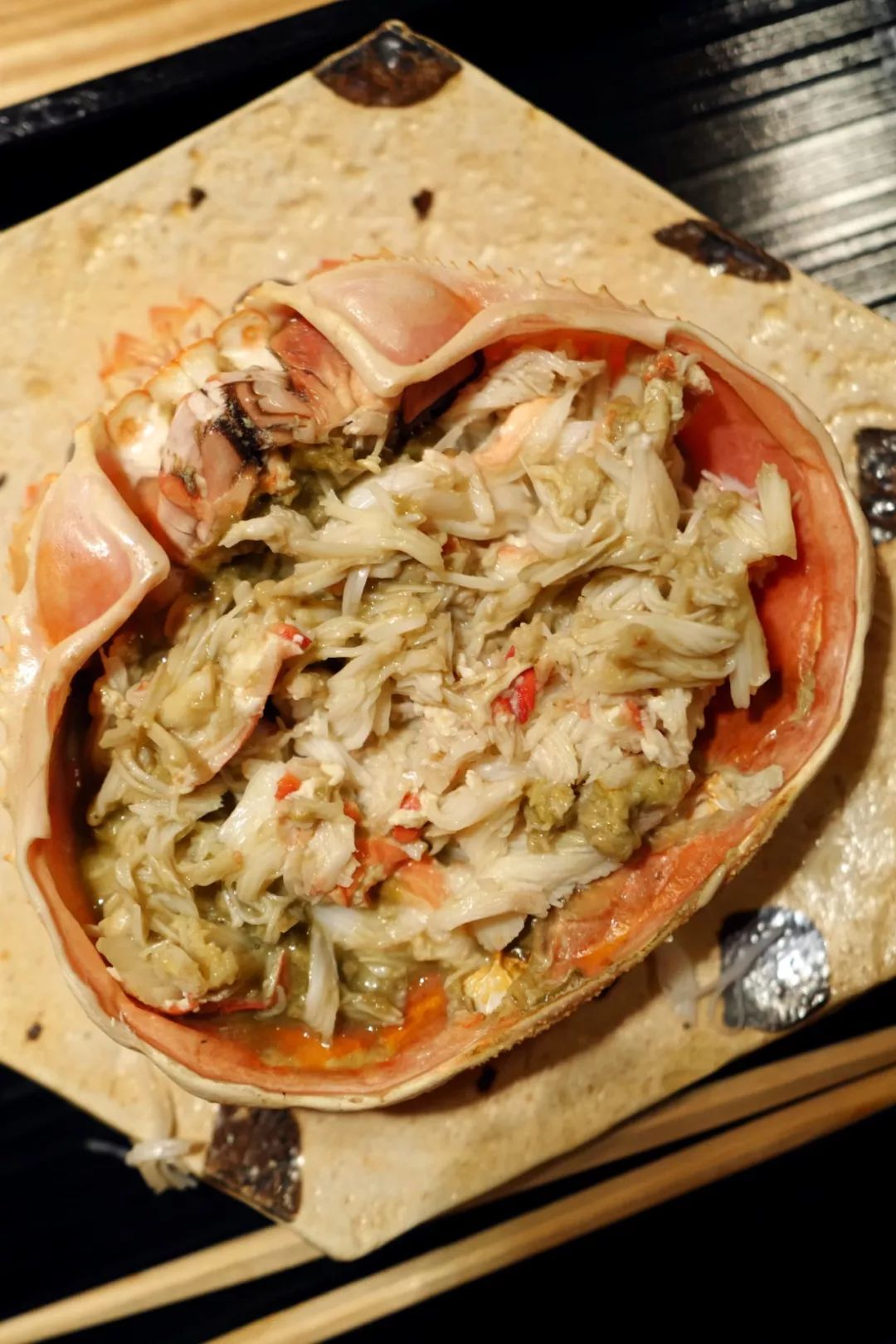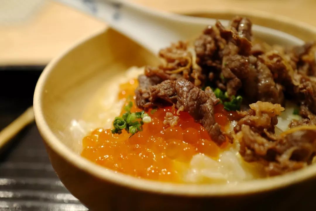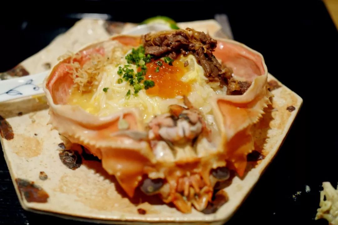 其余细碎的蟹肉被细细拆出,和鸡蛋出汁一起烩成一锅杂炊。还大方准备了鲑鱼子和松坂牛肉做浇头,鱼子爆开的瞬间,牛肉的馥郁脂香,蟹肉的甜鲜,三位一体在舌尖聚集。拿蟹盖作为容器再添一碗,最大程度的搜刮蟹黄的精华。