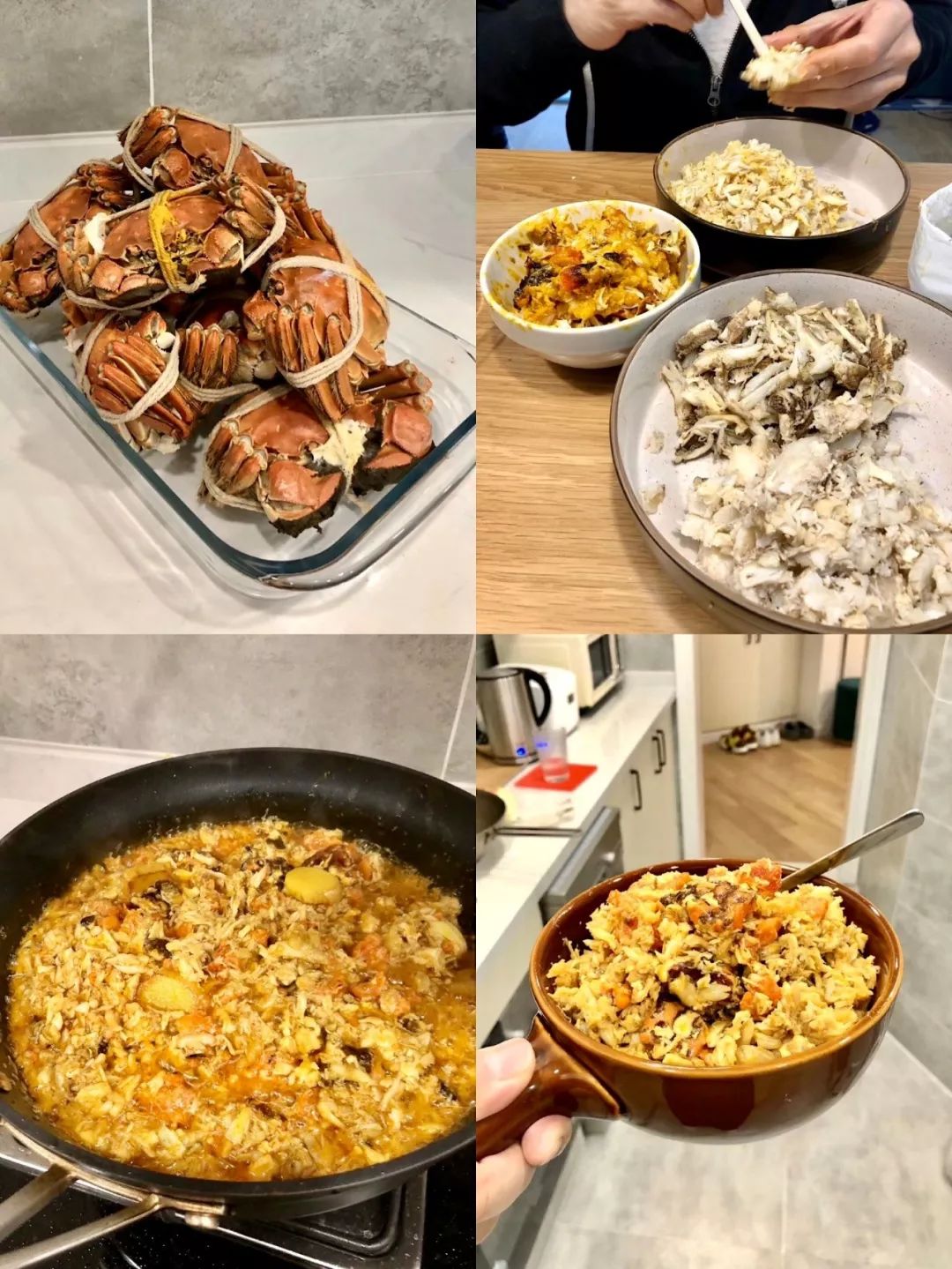 主厨拿出蟹身,一边介绍哪里是不能食用的部分,一边熟练的去除内脏,过一会白花花的蟹肉堆满案板。蟹壳和蟹黄得先烤片刻,等冒出蒸汽的时候再将蟹肉拌入。蟹黄蟹肉砌出满满三碗,这个量吃下觉得自己都快要痛风。