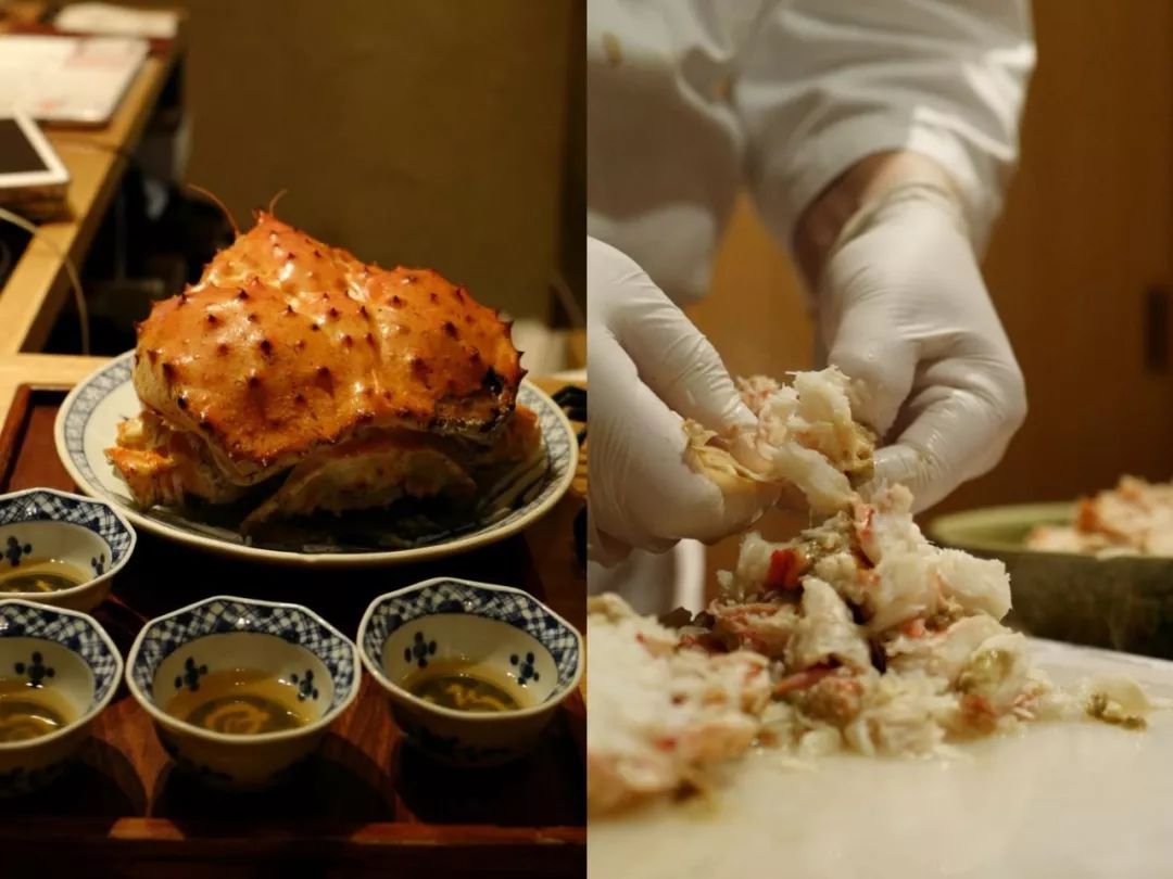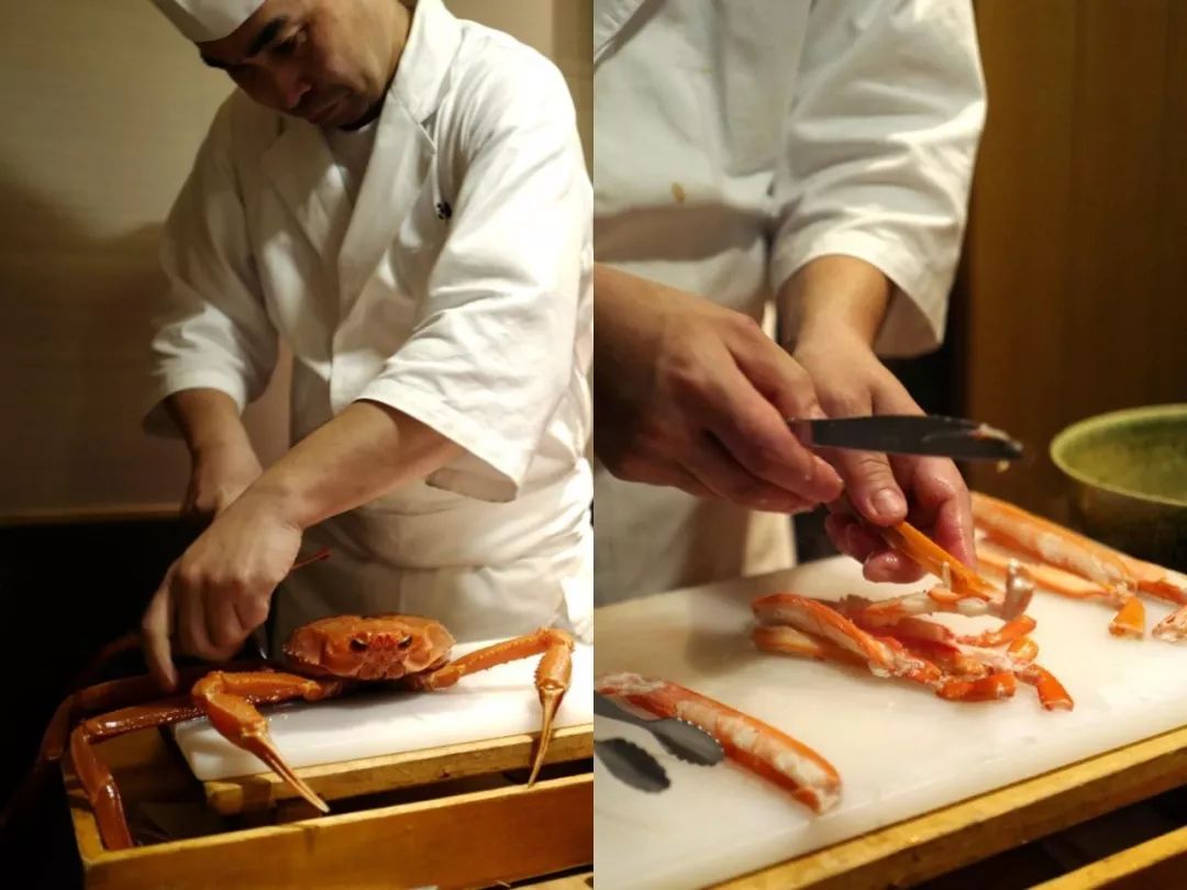 银座店的店长亲自坐镇,砧板刀具棉布和装满冰块的瓷碗依次摆放好后,开始拆蟹,手速极快,一会儿蟹螯、蟹腿、蟹壳、蟹肉一一处理完成,开始料理。