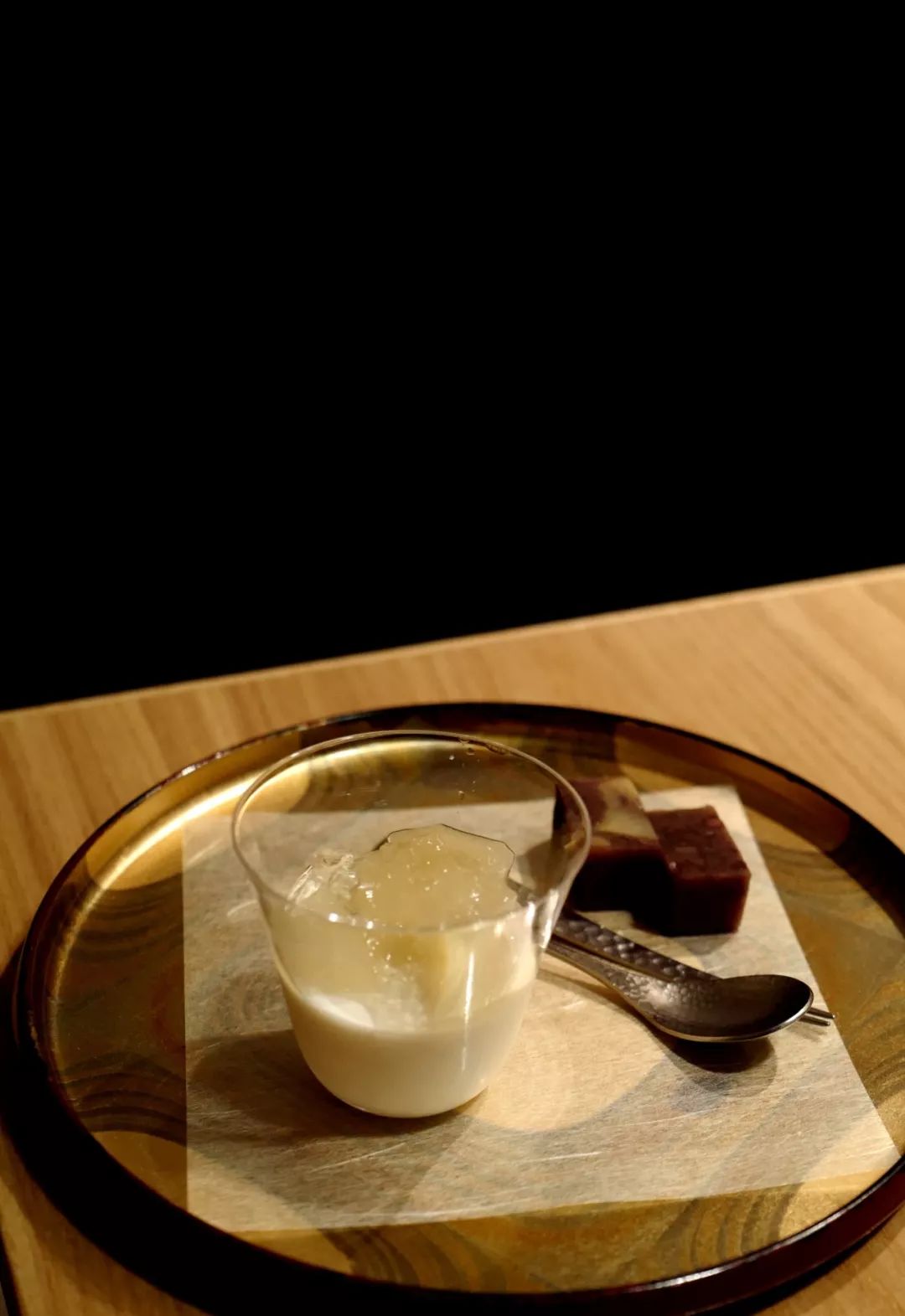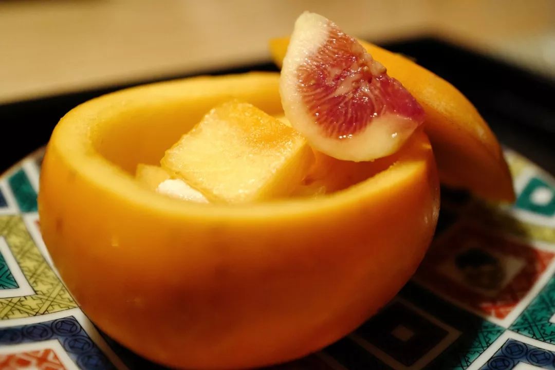 十一月是吃柿子的好时节,以柿为皿,装着胡麻豆腐,新鲜柿子和核桃。料想不到第一道菜竟然是甜口,这可和通常的顺序不太一样。