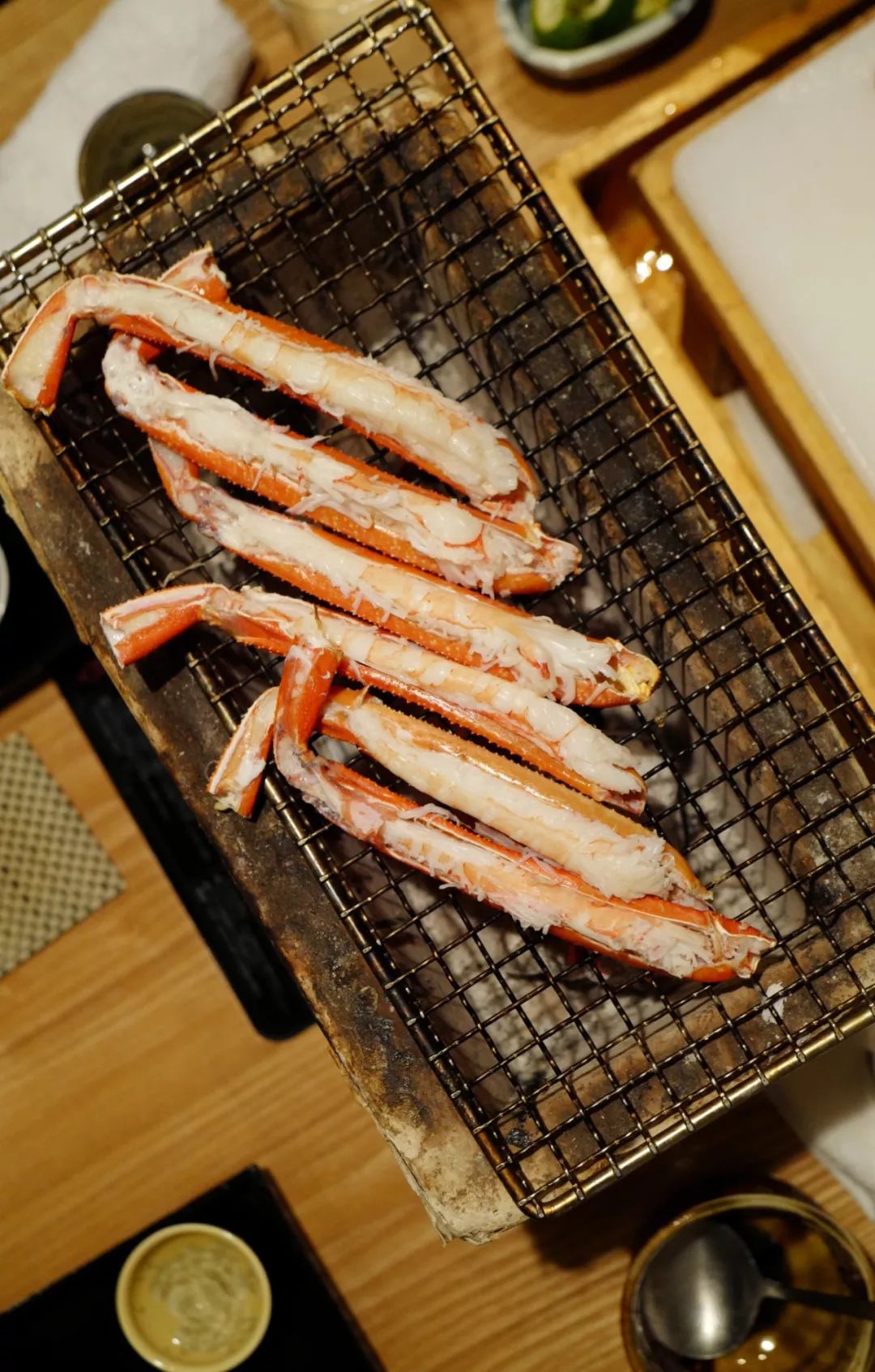 主厨搬来一个小火炉,放上蟹腿烤着吃。烤制的蟹腿带有淡淡的炭火香气,用筷子剃下肉来,挤少许柠檬汁。只感叹为什么螃蟹只长八条腿,不够吃。