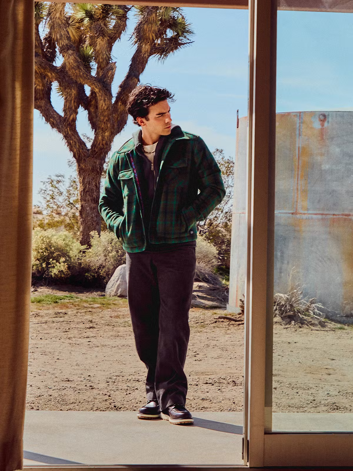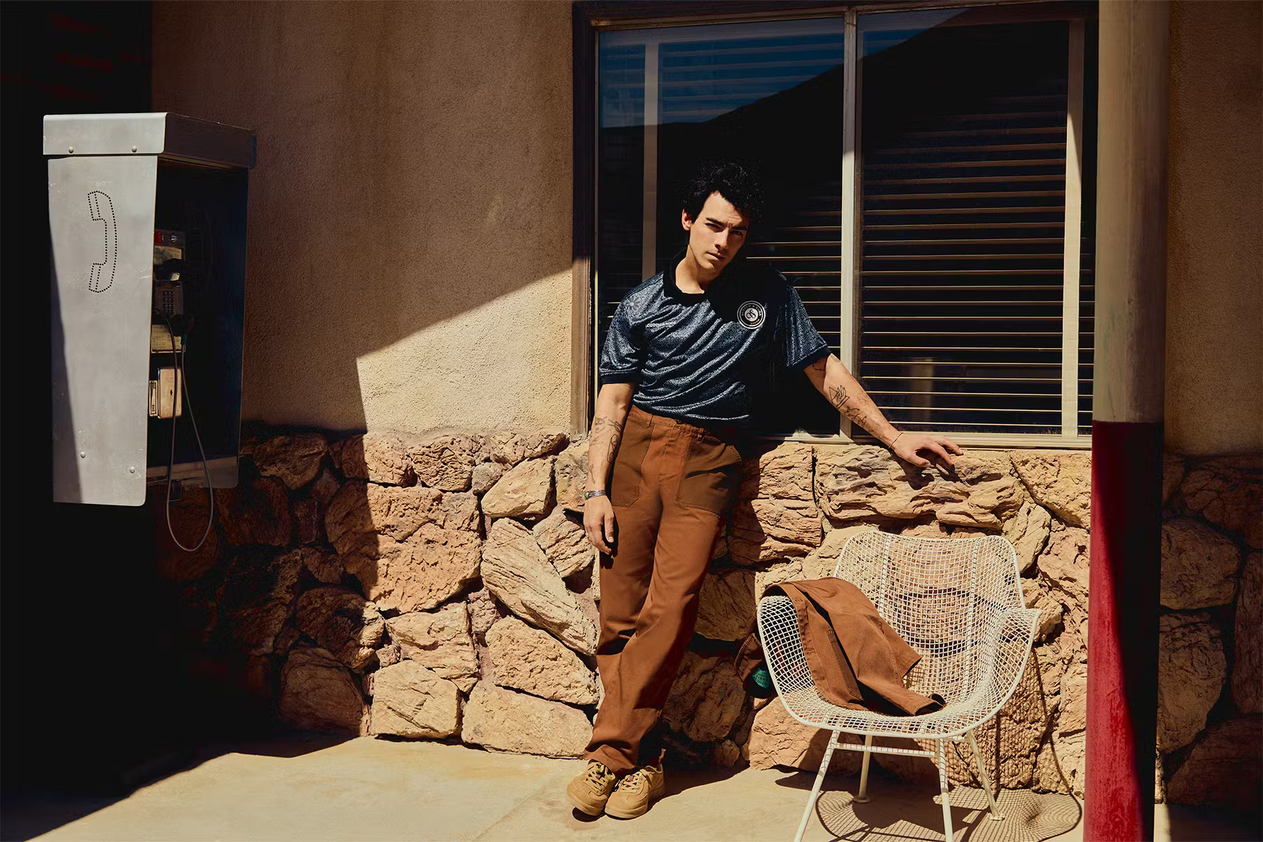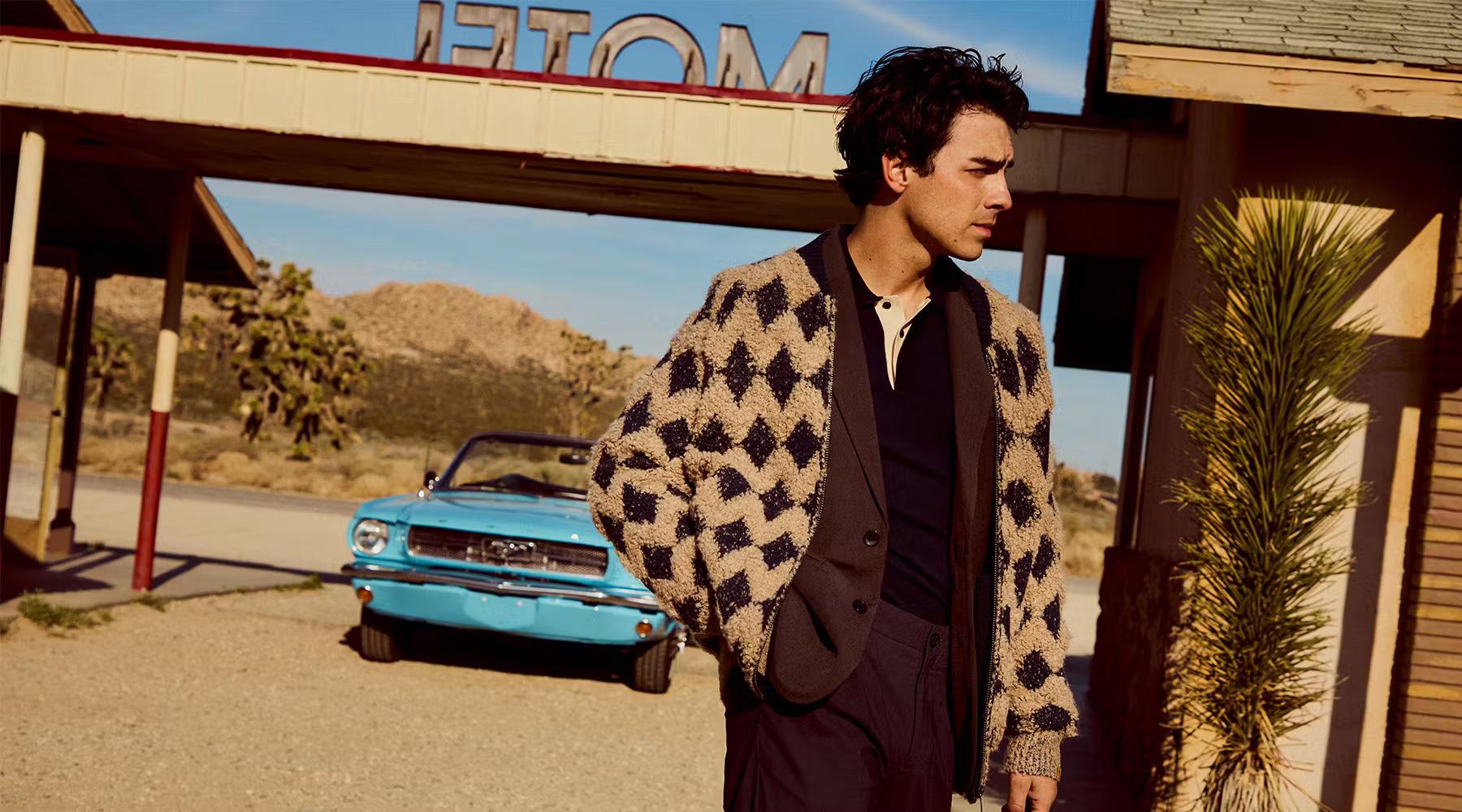 在上世纪 70 年代荒芜的西南部,Jonas 开着一辆迷人的海蓝宝石色软顶跑车……这样的场景,没有谁可以抗拒。狂野的西部魅力和美式复古风与 Jonas 的气质完美契合,给人一种《年少轻狂》里的马修·麦康纳和《好莱坞往事》中的布拉德·皮特的感觉。