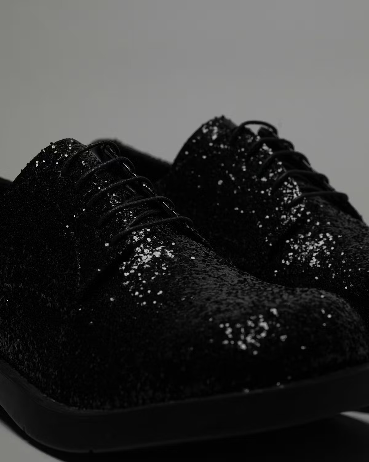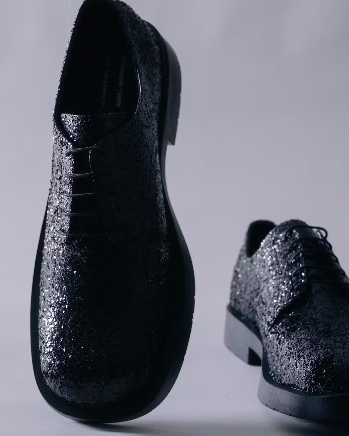 Junya Watanabe 的合作模式习惯于将一双原本就造型奇特的鞋款——譬如此次的 Camper Tossu(其特点是曲线优美的外骨骼包裹着 3D 针织袜)——重新演绎成深色系,并点缀以 Junya Watanabe 的品牌标识。CAMPERLAB Tossu 配色低调、设计别致;对比之下,MIL 1978 则是一款外观普通但细节处理别具一格的鞋履。作为一双经典的皮革德比鞋,MIL 1978 Junya Watanabe 的巧手之下,已然蜕变为一件闪耀夺目的实验品,黑色亮片被手工粘贴在全黑鞋面之上,因此每一双鞋都足够闪亮,却又略有不同。
