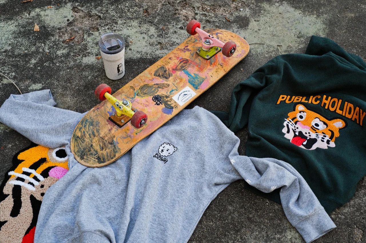 「公眾假期Ph.」给人第一印象可能是偏街头风格的服饰——T恤、卫衣、棒球帽等,但这些都是 2021 年加入的品牌副线「Ph.」,品牌一开始的定位其实是家居装饰类单品,比如收纳箱、地毯、时钟……之所以融入街头服饰,与 Kenneth 从青少年时期开始便养成的兴趣爱好有很大关系。