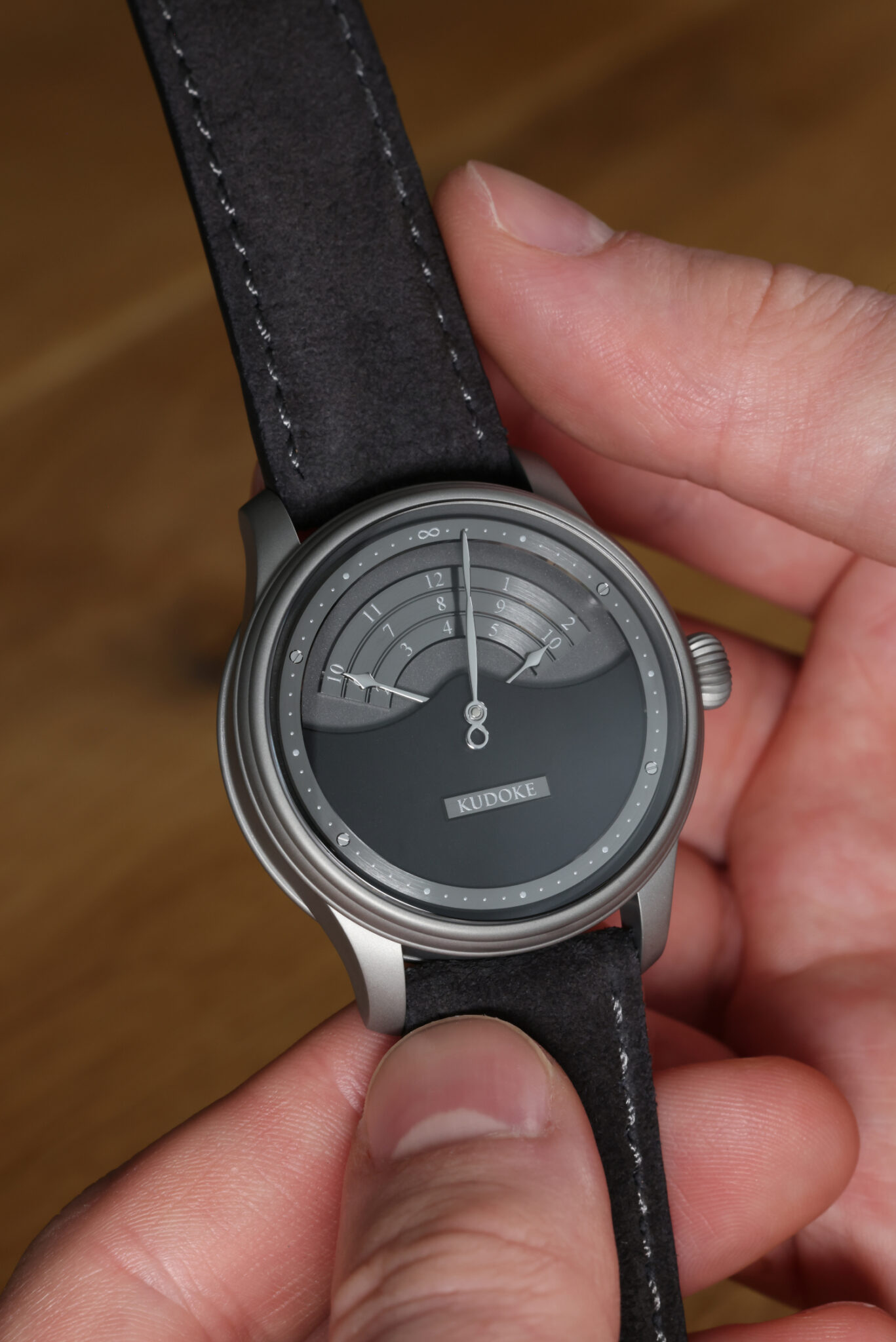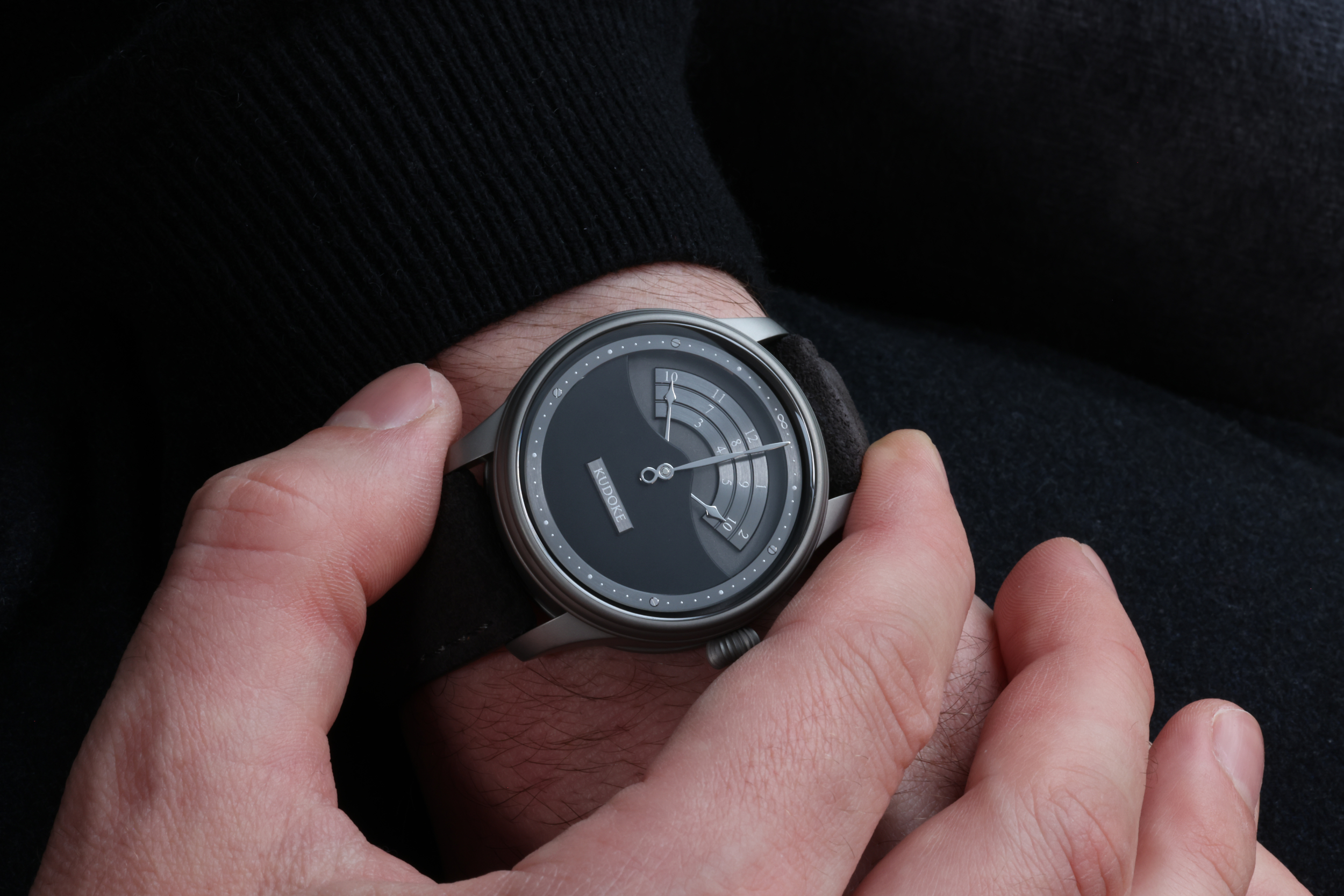 表盘是Nocturne最引人注目的部分:采用双层结构,上层为电镀黑色漆面,下层基础盘带有黑金处理元素,整体营造出深邃的黑色调。读时方式继承了Kudoke 3的标志性设计——这是一款“两针四手”或极具诗意的非常规显示。