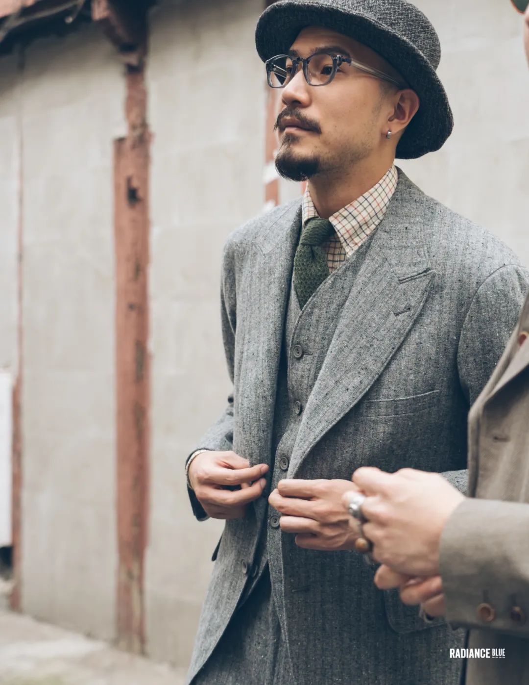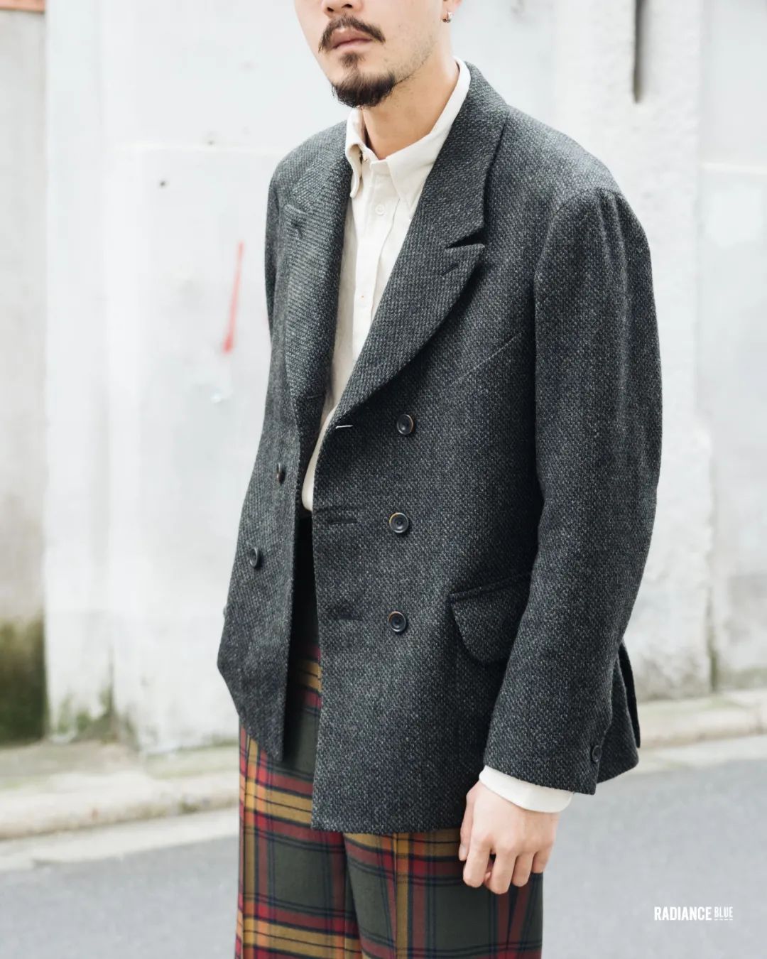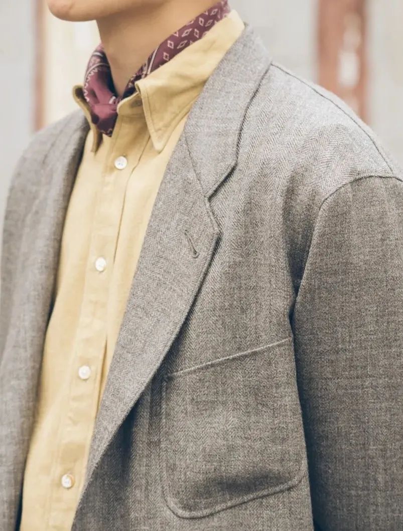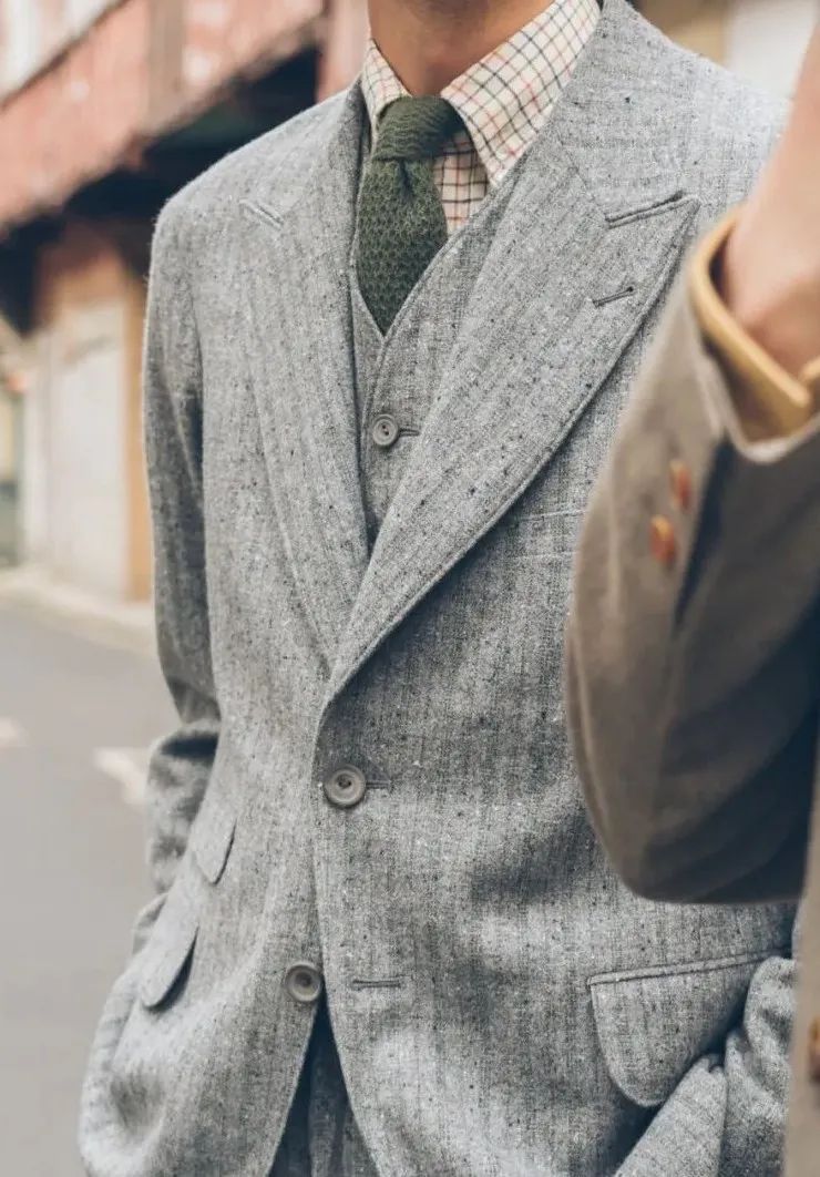 值得一提的是雨哥身上MotivMfg的,遠近皆宜,遠看像是很深的灰綠色,經過一番近看硬摸後發現這款來自Lovat Shetland的羊毛花呢面料確實有被譽為經典的可取之處。無論是在視覺上四種色調的綠色紗線與灰、黑色紗線紡織在一起的交錯感,還是觸覺上凹凸不平的肌理感,都是一絕。