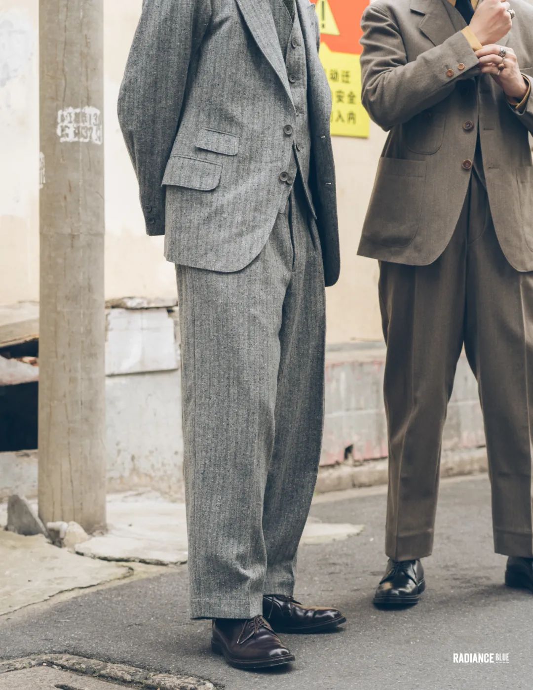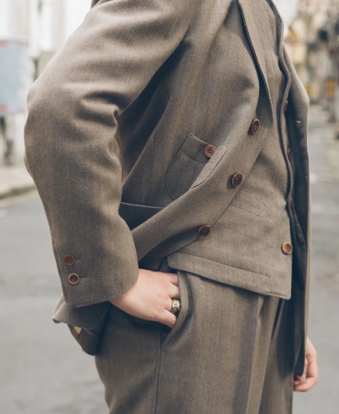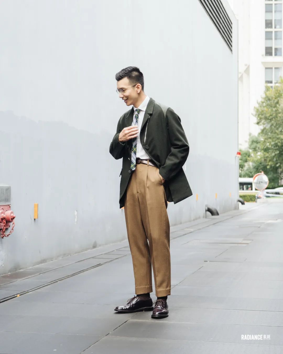 值得一提的是雨哥身上MotivMfg的,遠近皆宜,遠看像是很深的灰綠色,經過一番近看硬摸後發現這款來自Lovat Shetland的羊毛花呢面料確實有被譽為經典的可取之處。無論是在視覺上四種色調的綠色紗線與灰、黑色紗線紡織在一起的交錯感,還是觸覺上凹凸不平的肌理感,都是一絕。