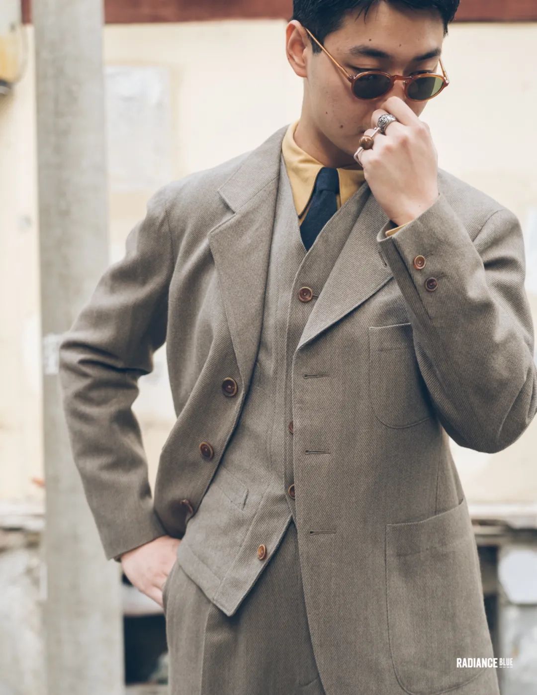 镜头挪到旁边也穿着三件套的小吉,虽然同是三件套,剪裁也与上款相同,但所呈现的轮廓却是有所不同的,再用各种的配饰来展现不一样的品味与气场。