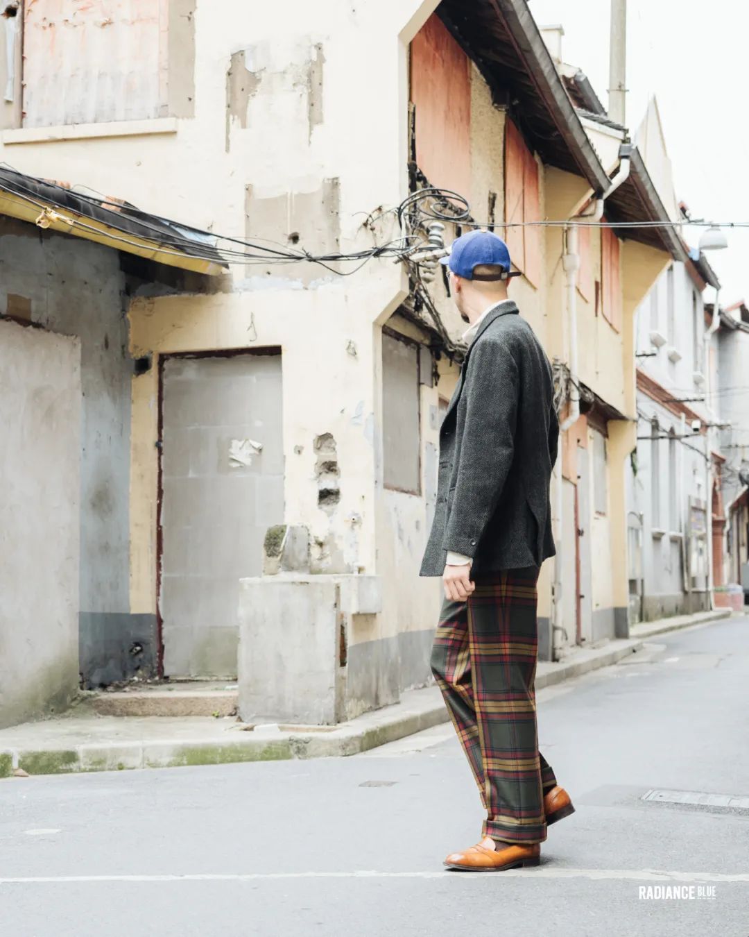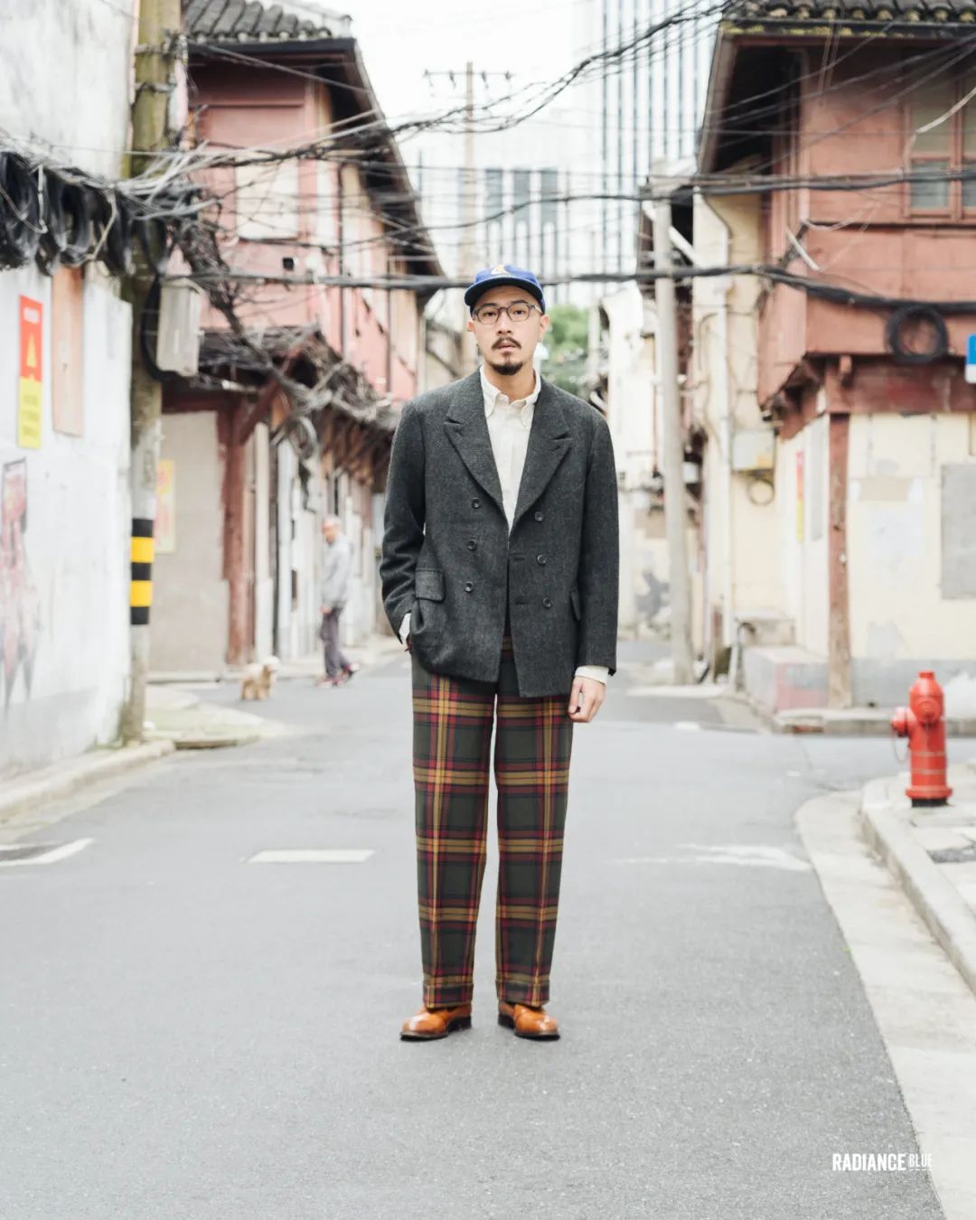 看吧,笔者说他是在玩弄颜色真不是假的,利用off duty works格纹裤中的各种颜色串连起MotivMfg的西装外套与皮鞋,头上的蓝色棒球帽更是为整体提亮了不少。