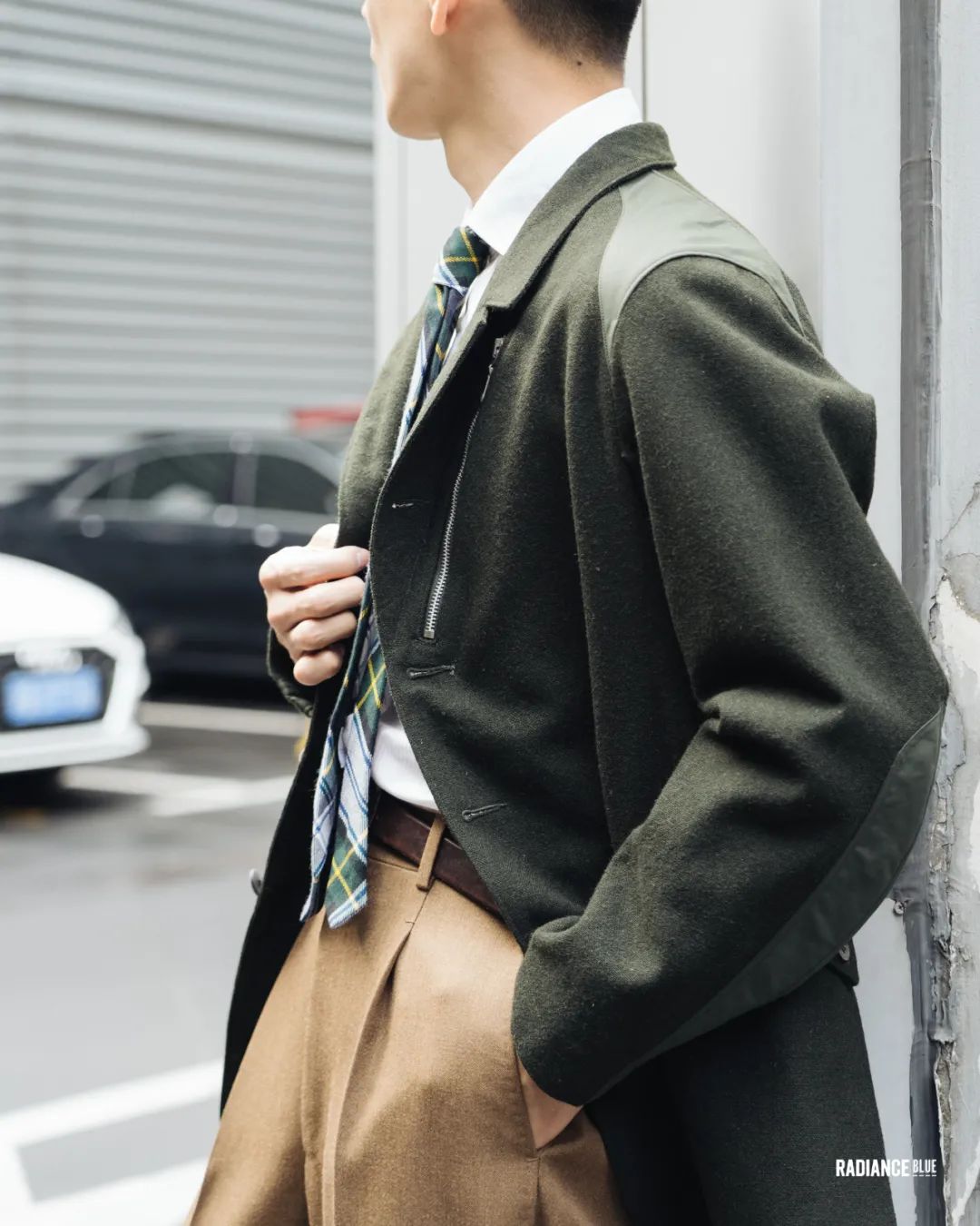 蓝黄绿相互交错的领带稳稳地挂在白衬衫上,外面套着一件看着像是西装又像是猎装的夹克,难道是MotivMfg的机能羊毛猎装夹克?这次第一回看到实物,再次赞叹设计师Daniel的想像力。天成把兜帽卸下,将它变成一件裁缝式的夹克,确实是很适合今日的选择。
