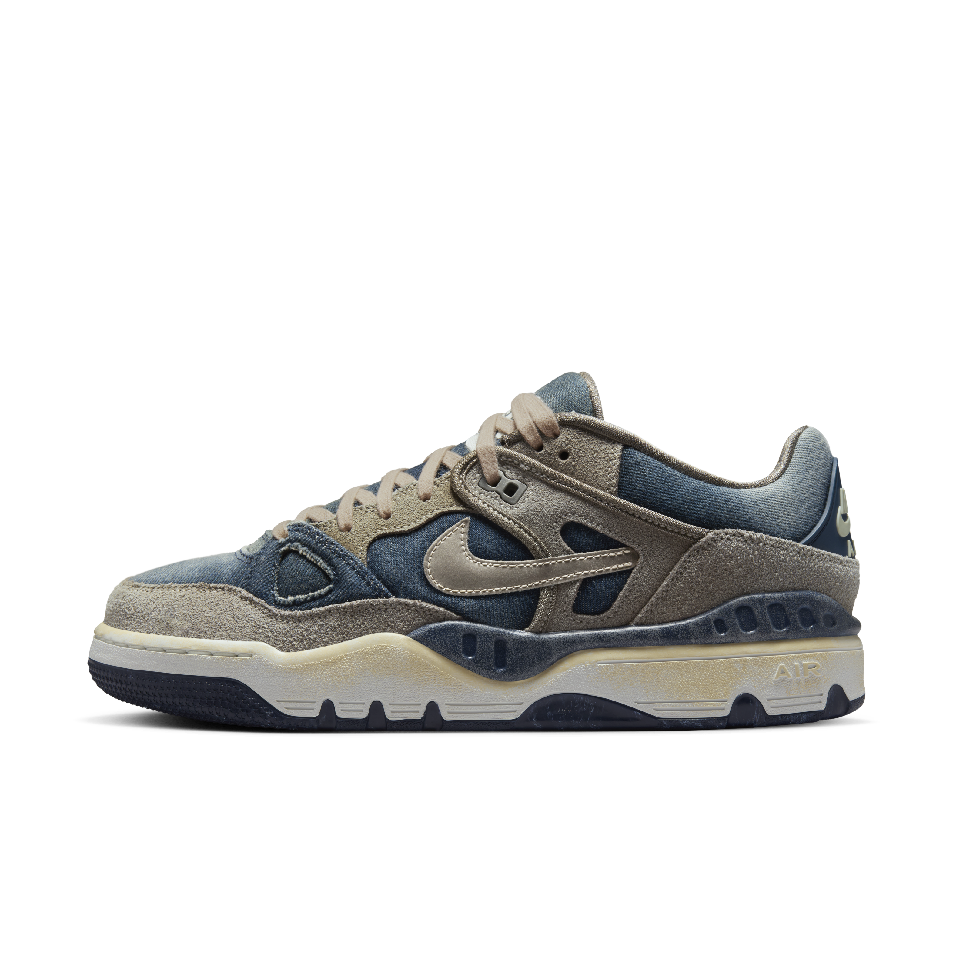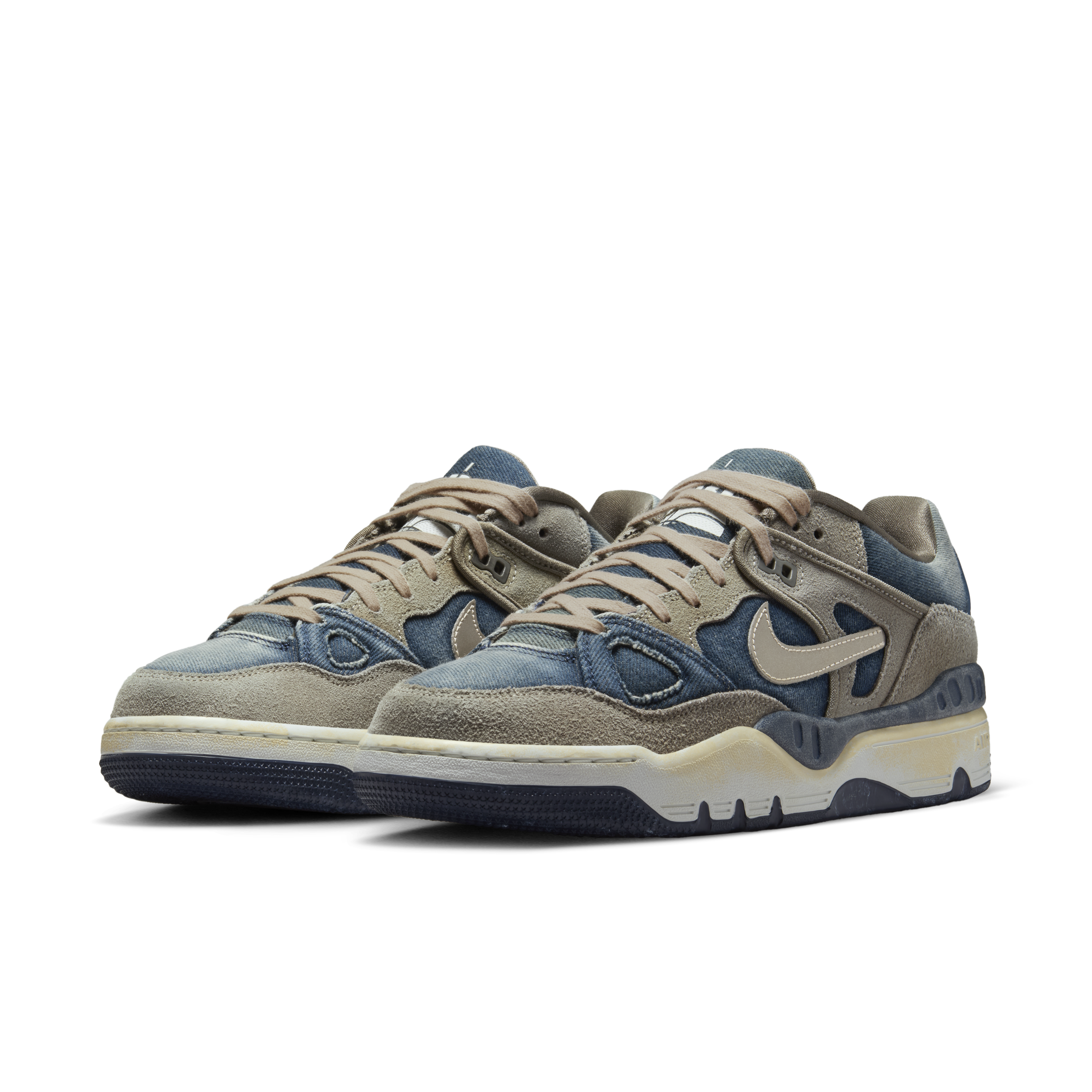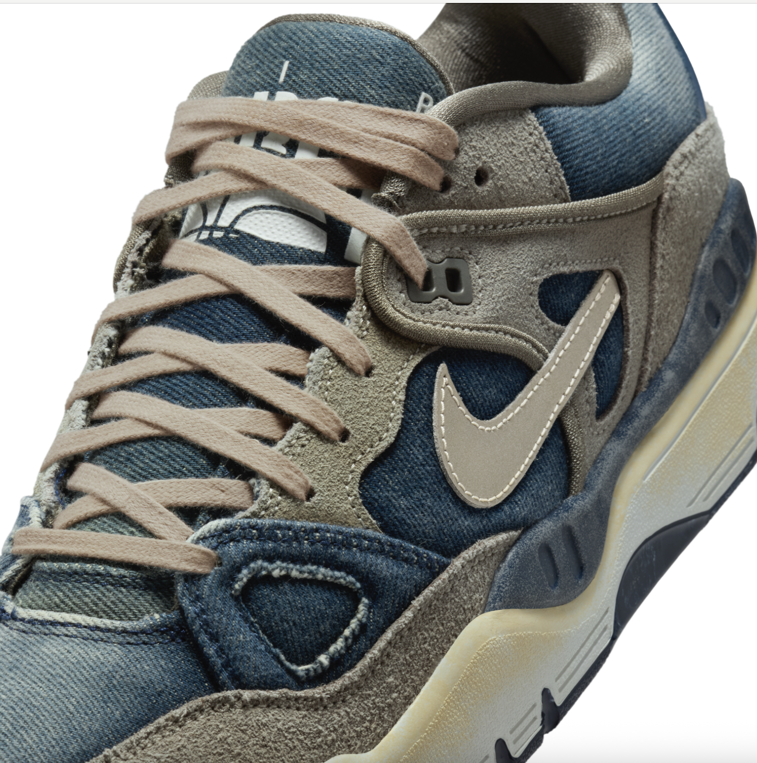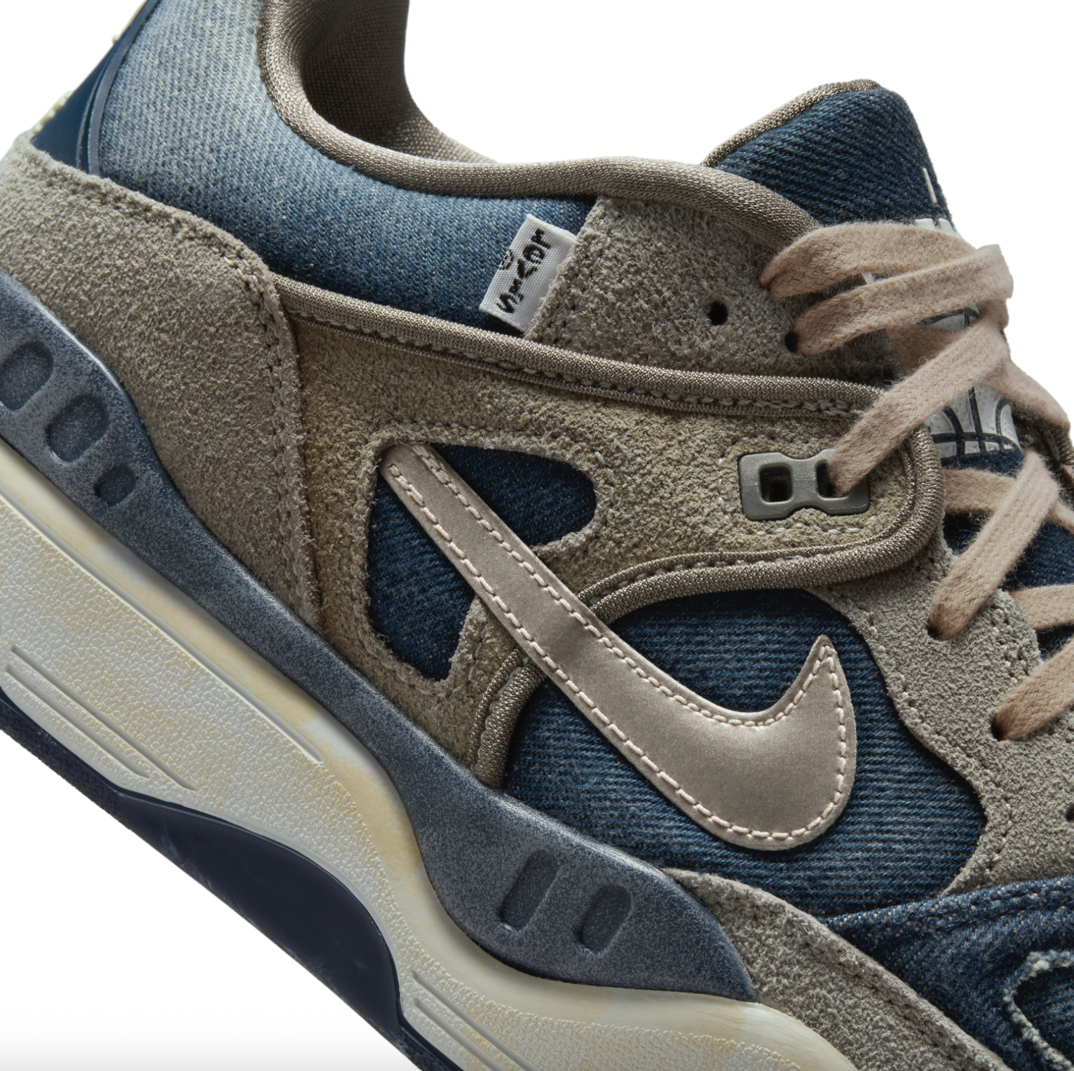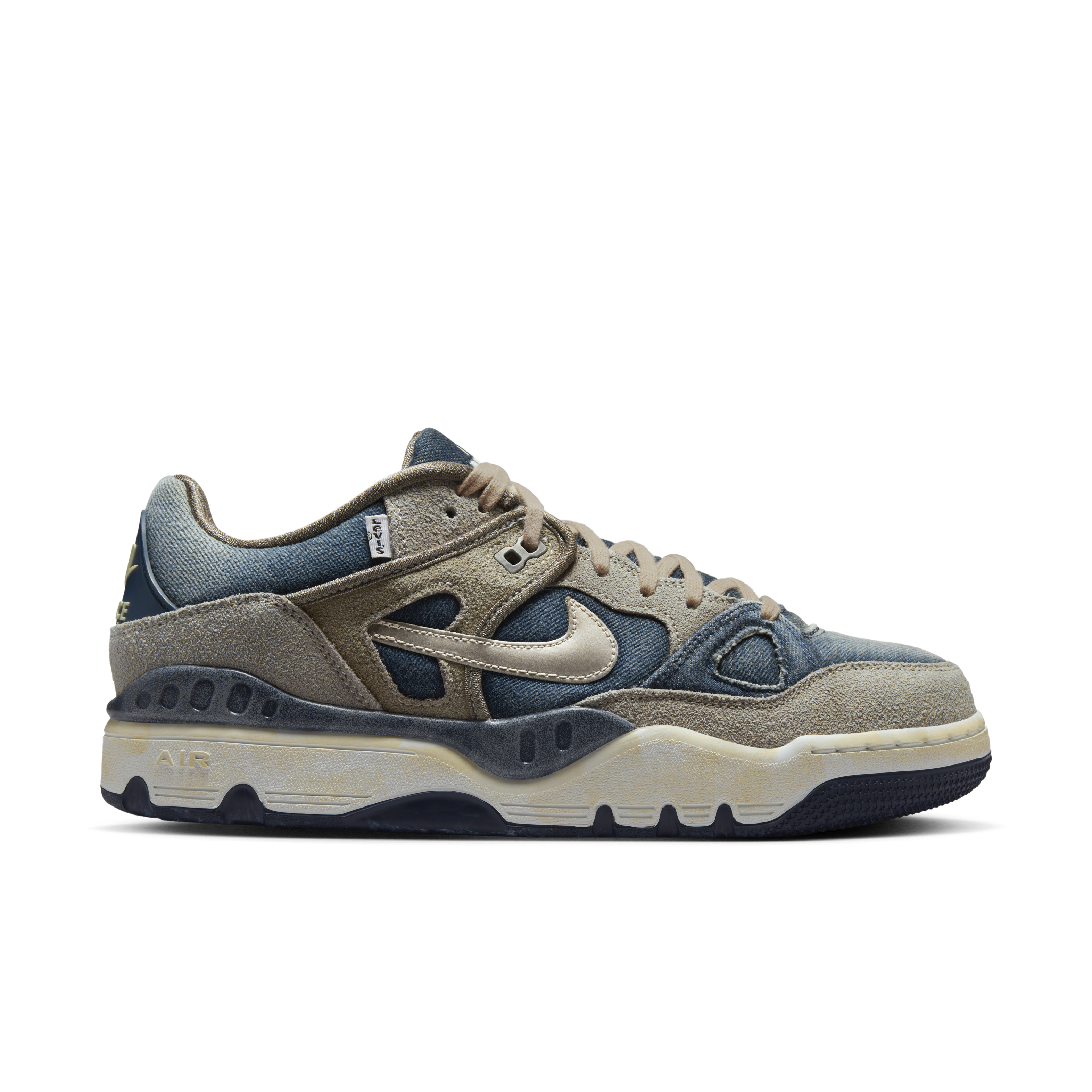 鞋款以橄榄灰(Olive Gray) 配色呈现,高品质工艺打造,凸显Levi's® 与NIGO标志性的复古做旧美学,完美契合双方一贯的设计内核。鞋面采用做旧牛仔布与翻毛皮拼接打造,两种材质碰撞交织出丰富的视觉层次。细节设计上,右脚鞋侧缀有经典Levi's® 旗标,金属质感swoosh标识随步伐折射光影;EVA 中底经特别氧化处理呈现自然泛黄,刻画岁月痕迹;橡胶外底则延续 Nike 一贯的耐用与性能。每一处细节,皆是三方基因的共生表达。
