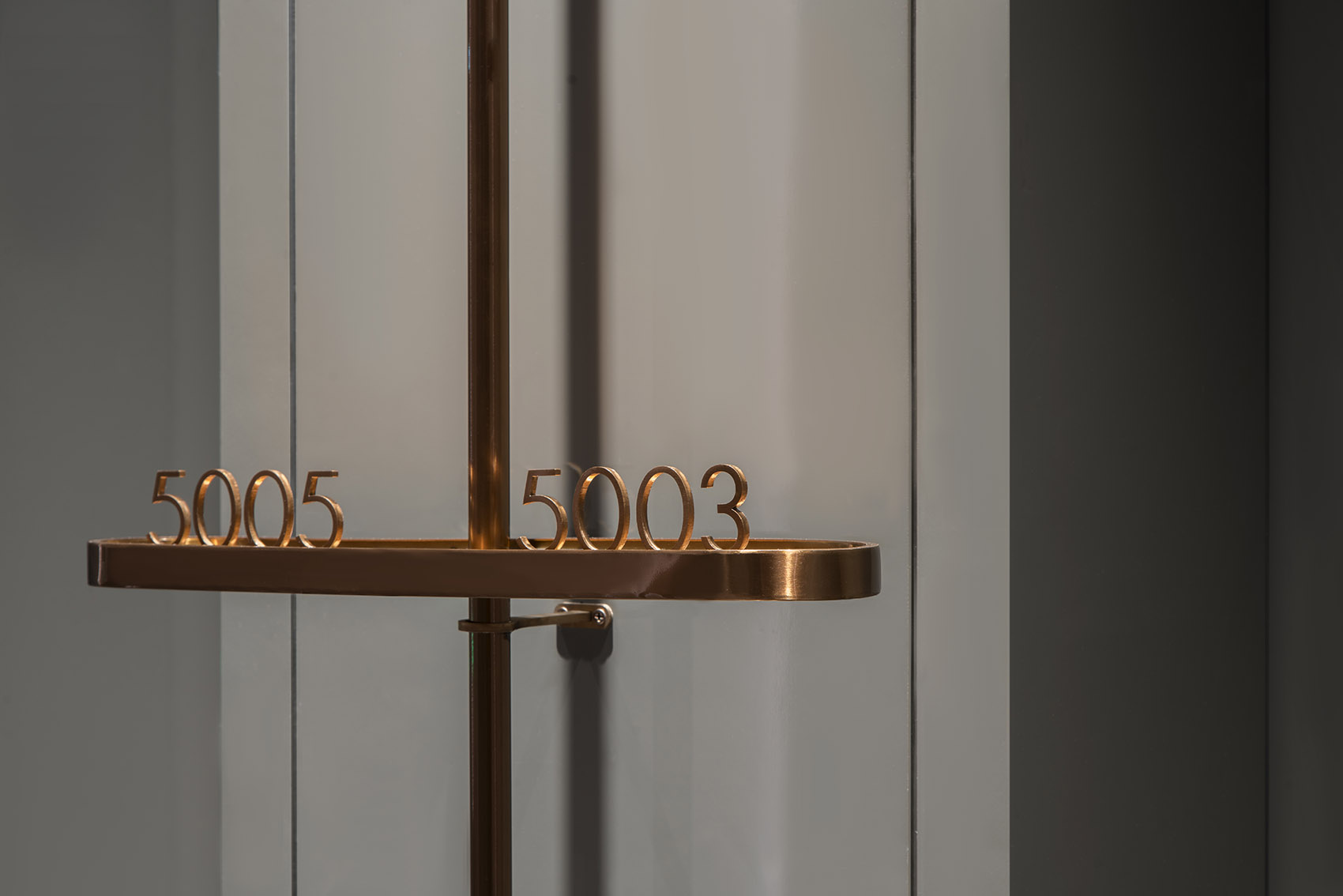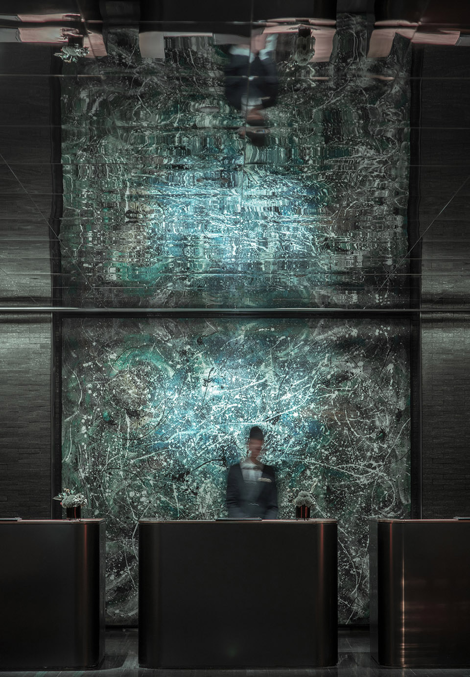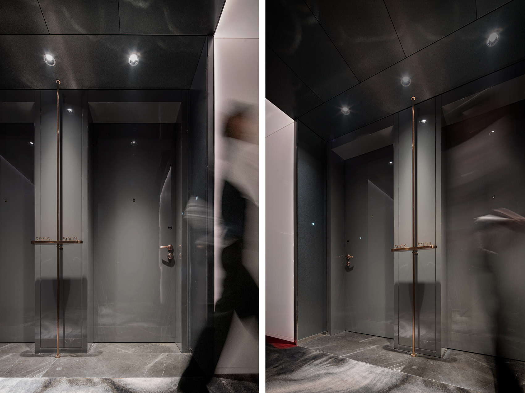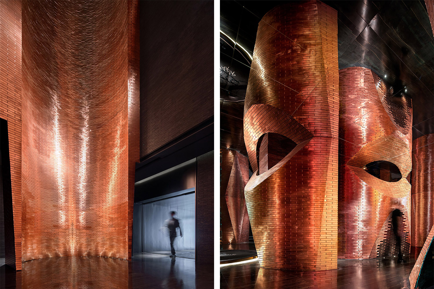 一层入口,是营造视觉记忆的第一触点。10米通高的空间,两扇围合50000片金属砖墙巍峨耸立,延续环境语言的同时,形成绝对的包裹,将周边的嘈杂迅速地隔离开,仅留下砖墙的形态作为线索,游丝一线牵连着整座城市的记忆,为整体设计埋写伏笔,材质与色彩在这里打开一个微小的窗口,正待你徐徐展开。
