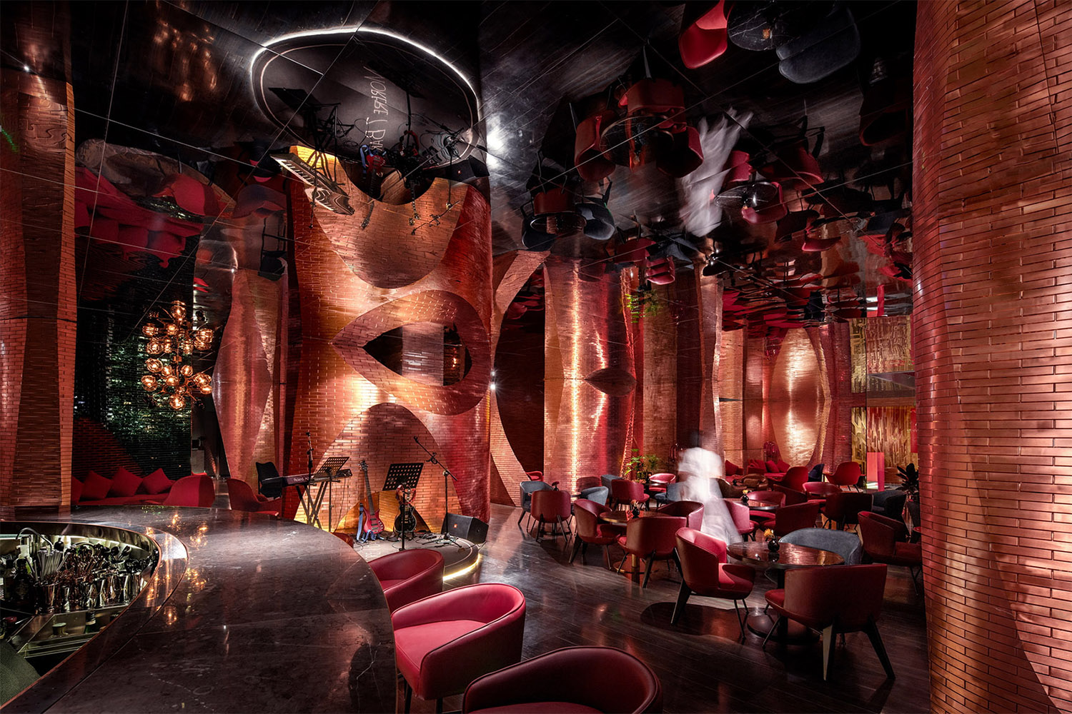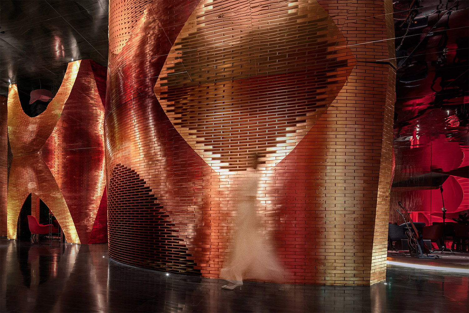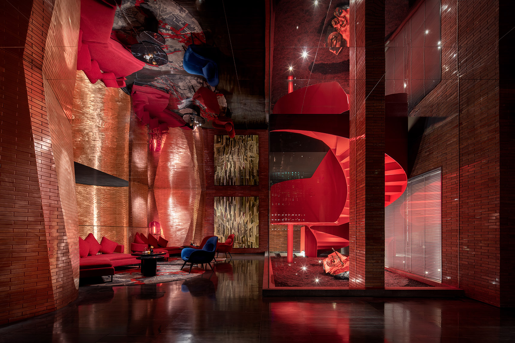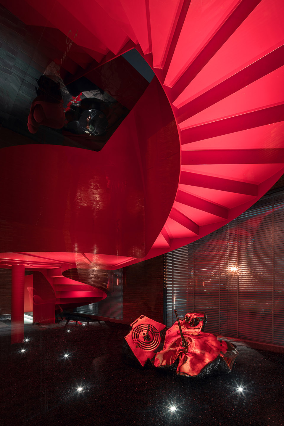 除了流动的砖墙,室内空间中大量使用灯光的变幻和丝绒元素,设计通过视觉线索和颜色来营造持续运动感。一侧的旋转楼梯采用红色烤漆钢板扭旋而上,极具冲击的色彩与形态,让旋转楼梯如同雕塑般,以一种不容忽视的方式,要求你的观看。