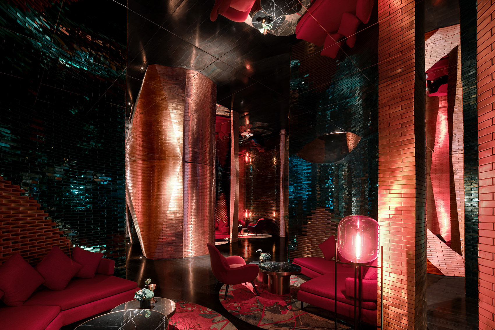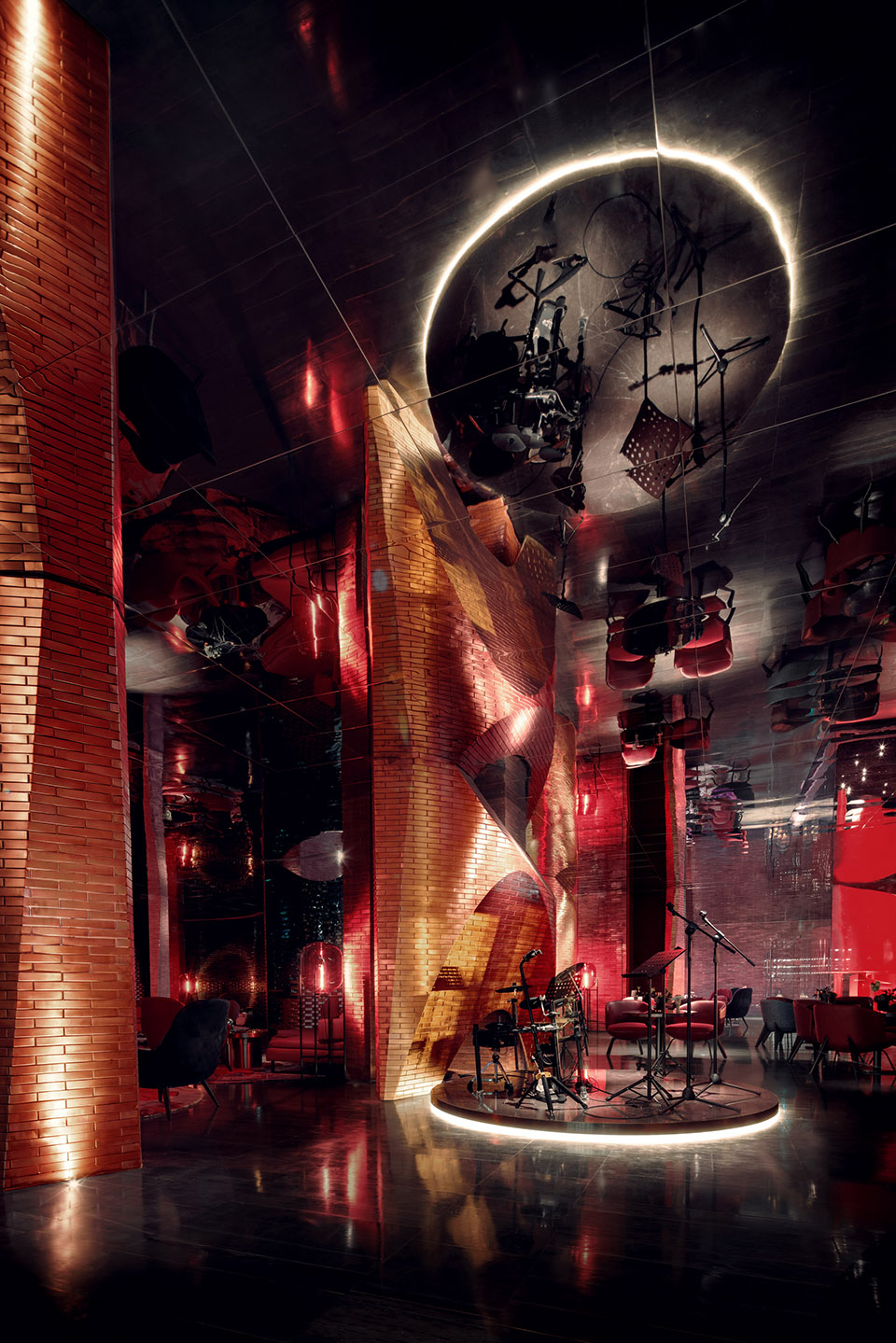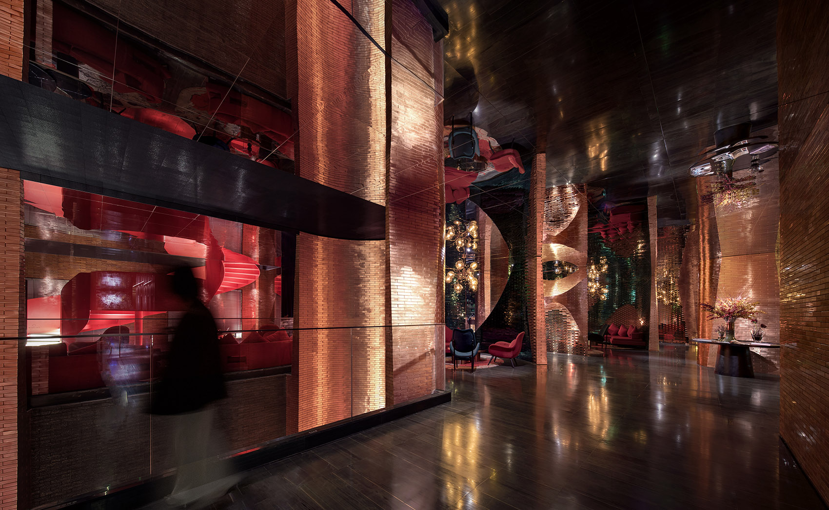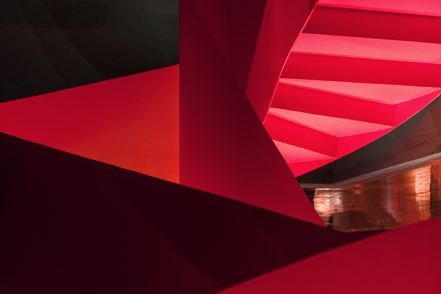 除了流动的砖墙,室内空间中大量使用灯光的变幻和丝绒元素,设计通过视觉线索和颜色来营造持续运动感。一侧的旋转楼梯采用红色烤漆钢板扭旋而上,极具冲击的色彩与形态,让旋转楼梯如同雕塑般,以一种不容忽视的方式,要求你的观看。