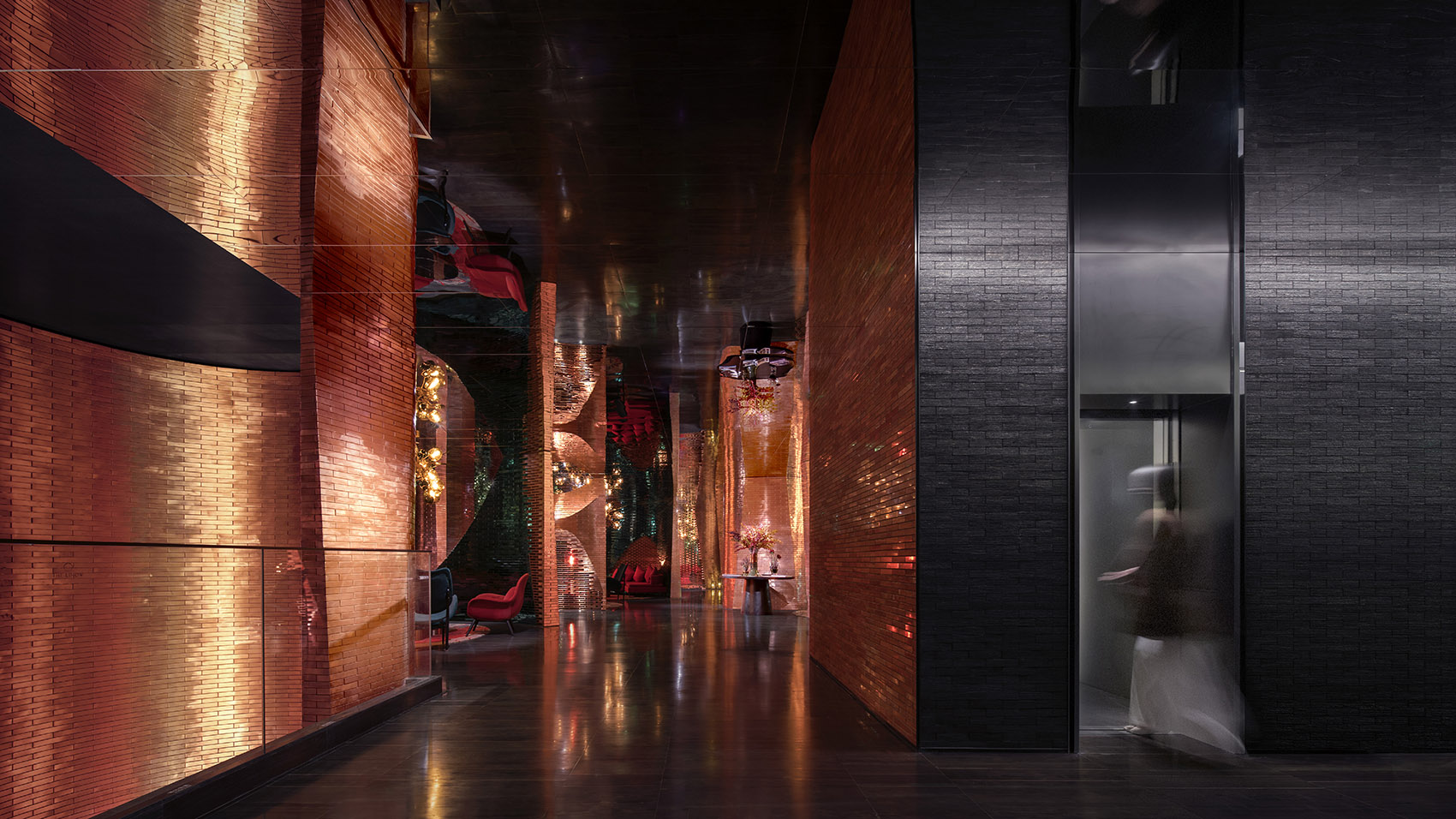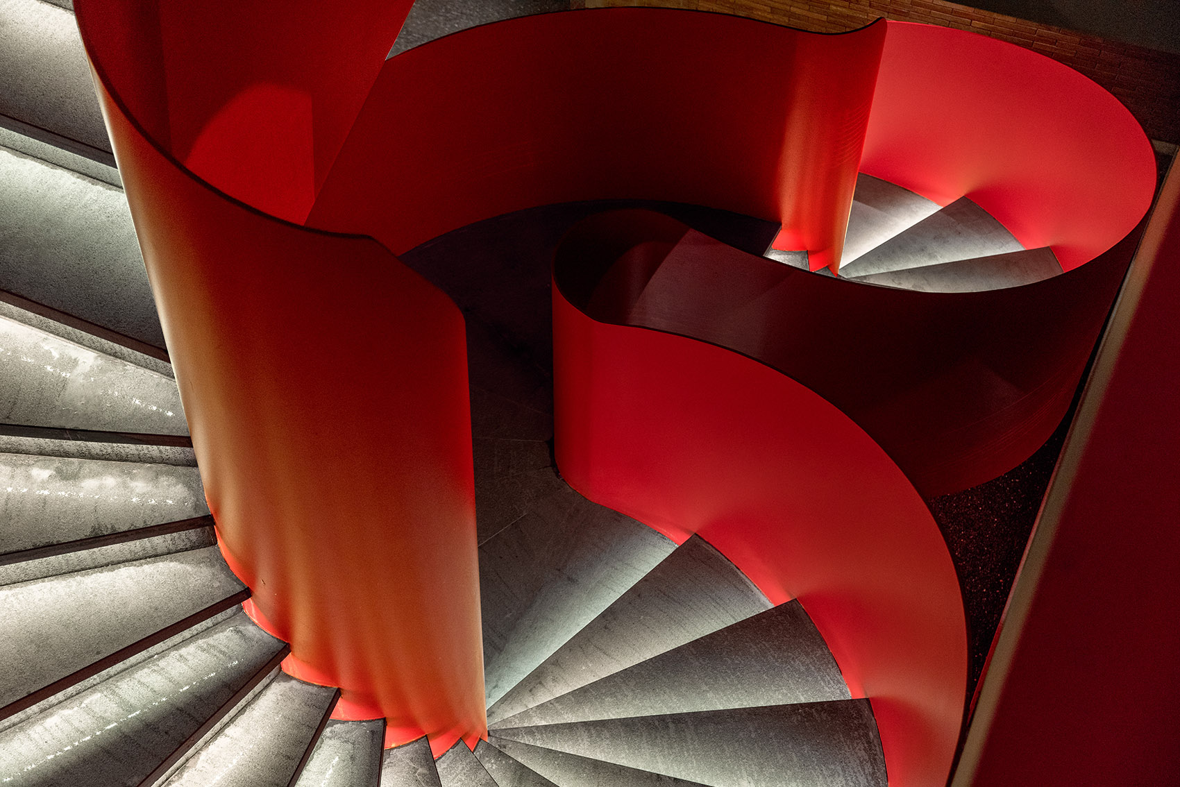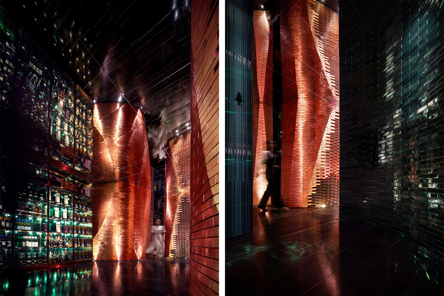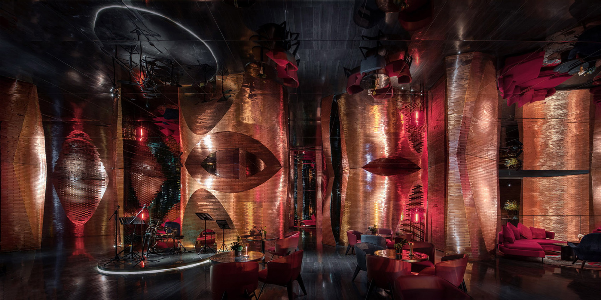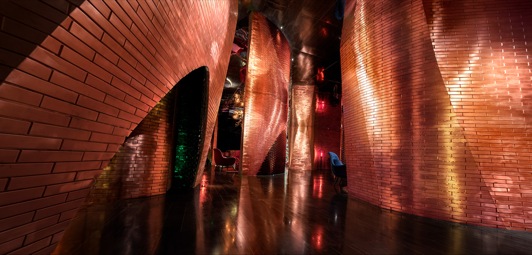除了流动的砖墙,室内空间中大量使用灯光的变幻和丝绒元素,设计通过视觉线索和颜色来营造持续运动感。一侧的旋转楼梯采用红色烤漆钢板扭旋而上,极具冲击的色彩与形态,让旋转楼梯如同雕塑般,以一种不容忽视的方式,要求你的观看。