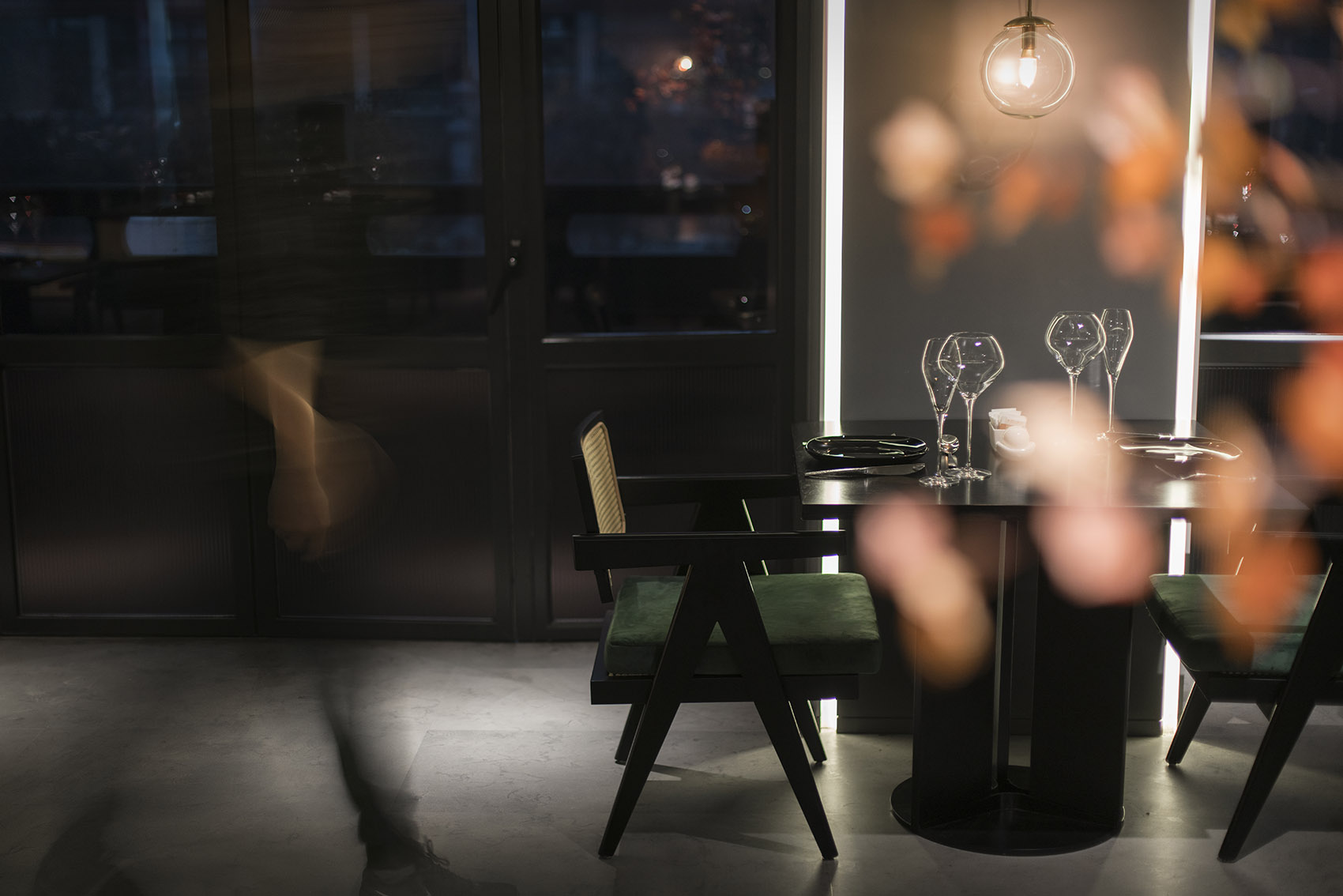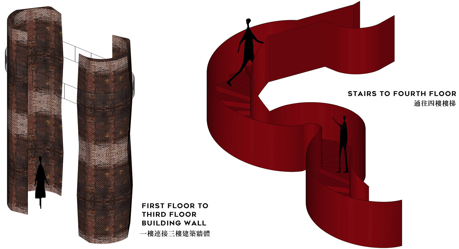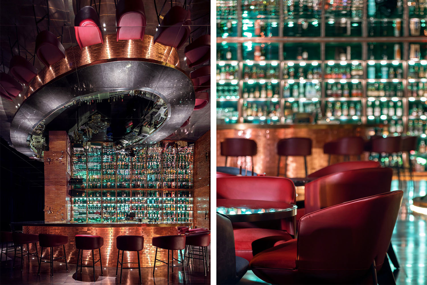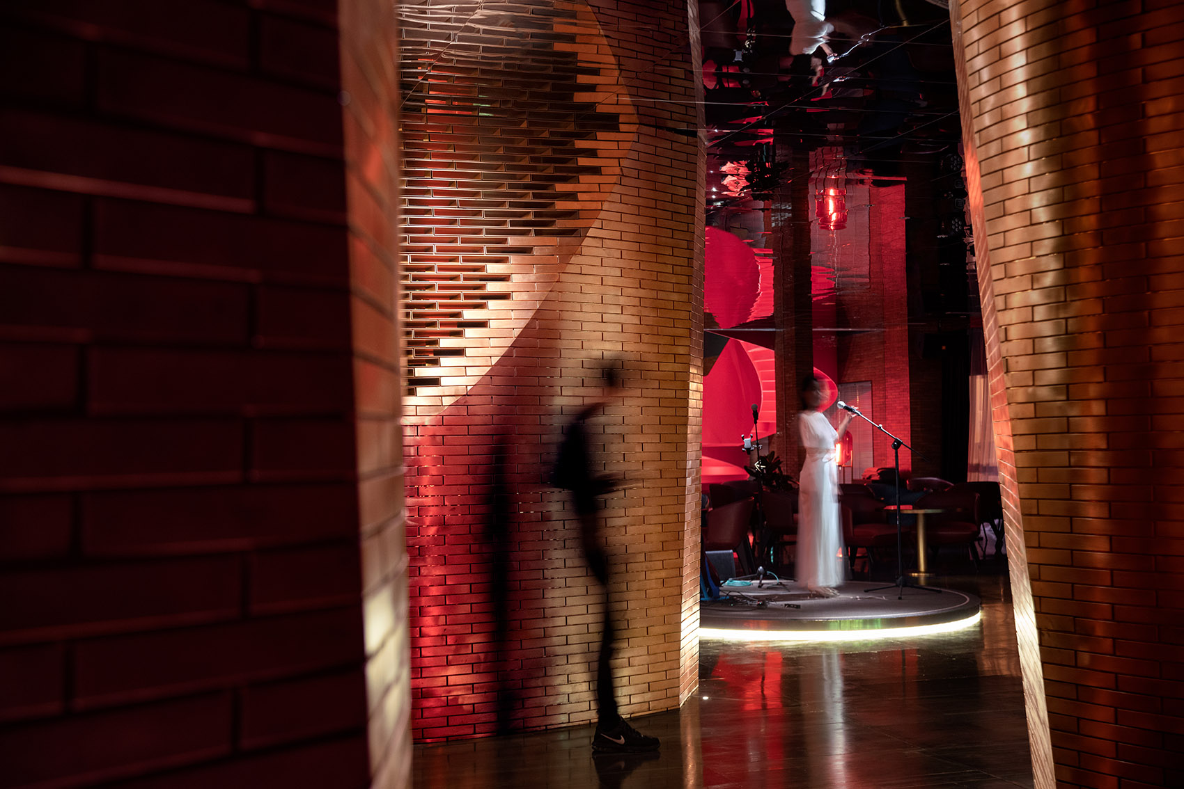 除了流动的砖墙,室内空间中大量使用灯光的变幻和丝绒元素,设计通过视觉线索和颜色来营造持续运动感。一侧的旋转楼梯采用红色烤漆钢板扭旋而上,极具冲击的色彩与形态,让旋转楼梯如同雕塑般,以一种不容忽视的方式,要求你的观看。