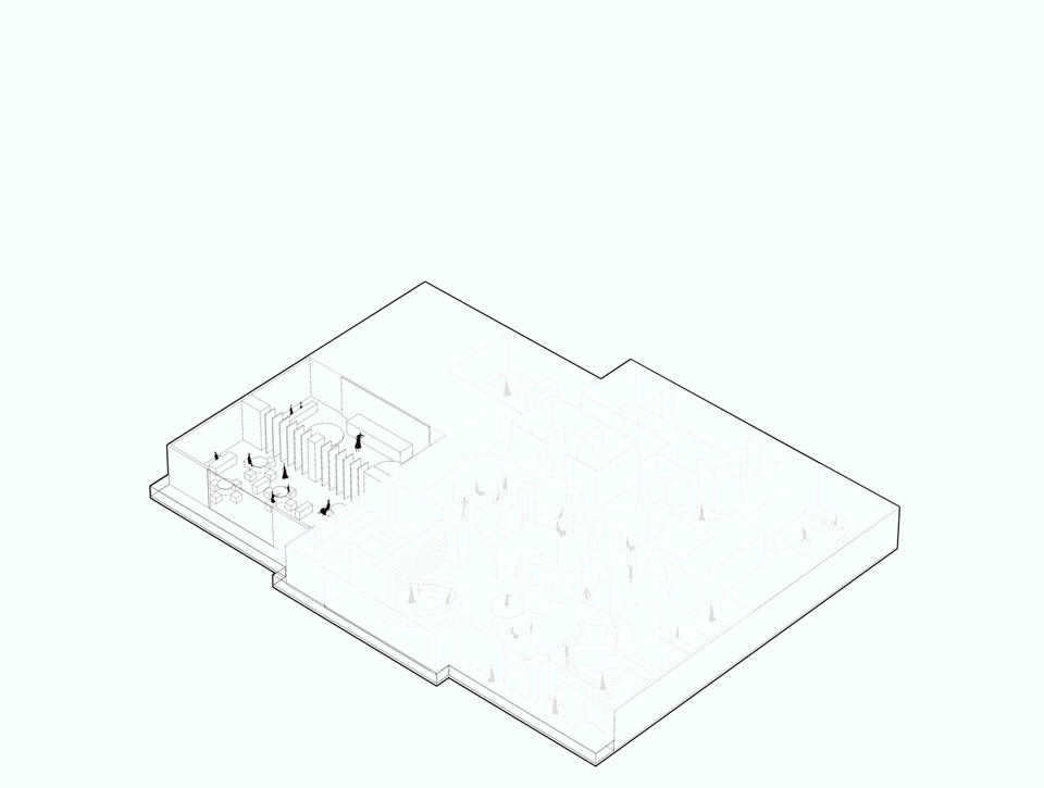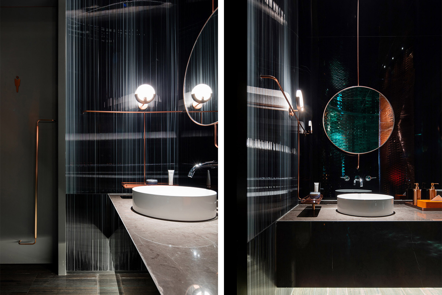 设计在方法、材料层面拆解重组,通过材质的创新,赋予旧元素以全新的语言,在不同的空间,通过营造新旧对比,制造不同的空间体验;利用光影在材质表面的蕴晕,营造层叠变换的迷幻效果,回应土壤的底色。