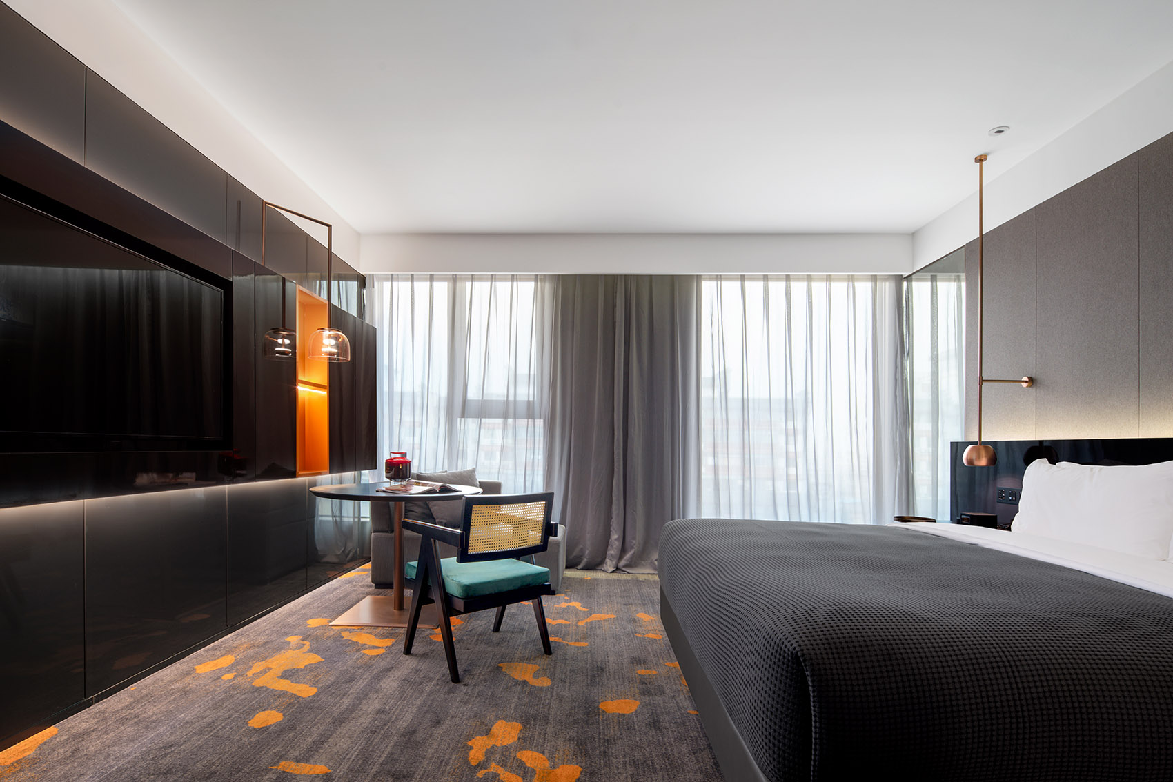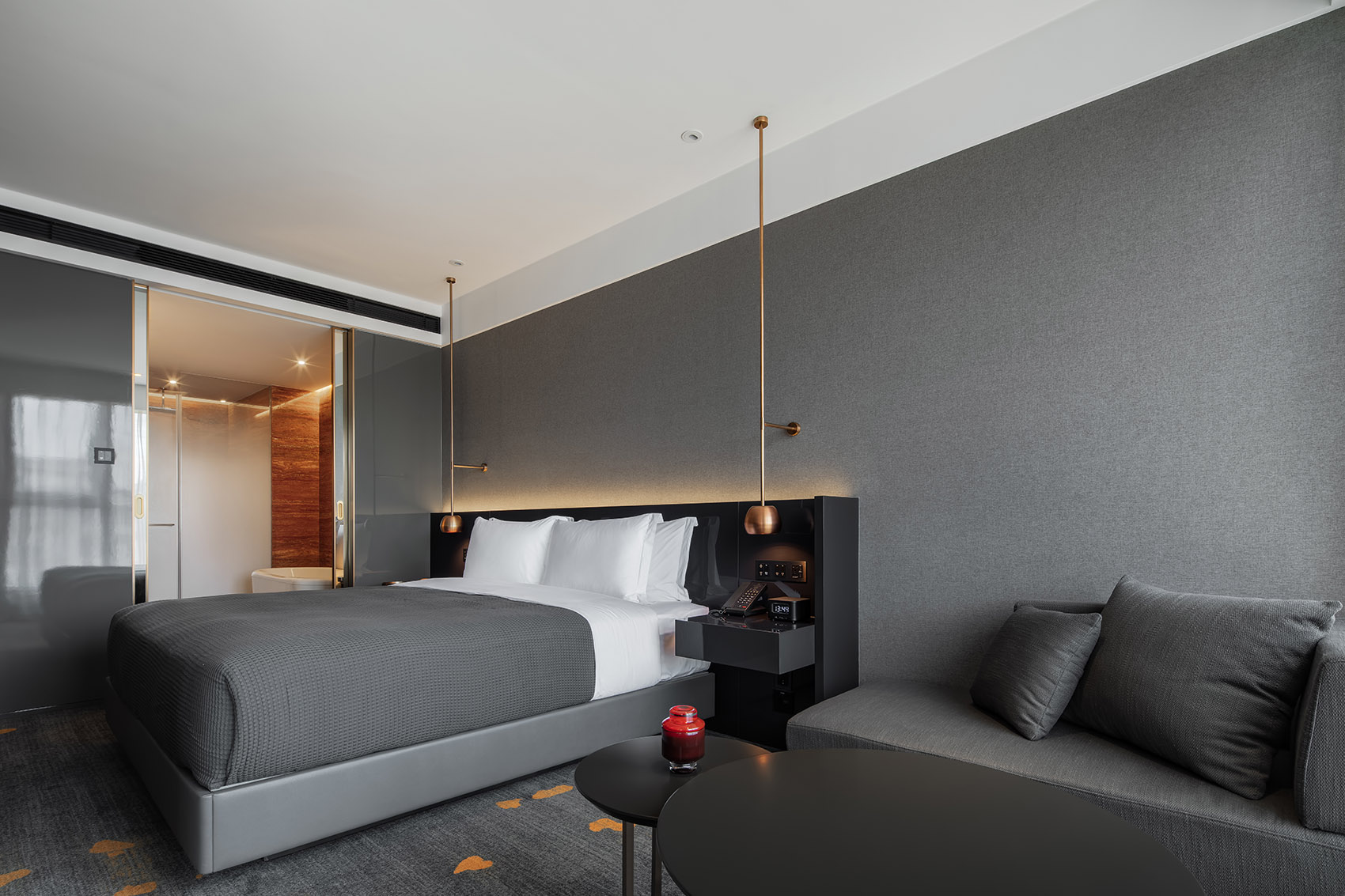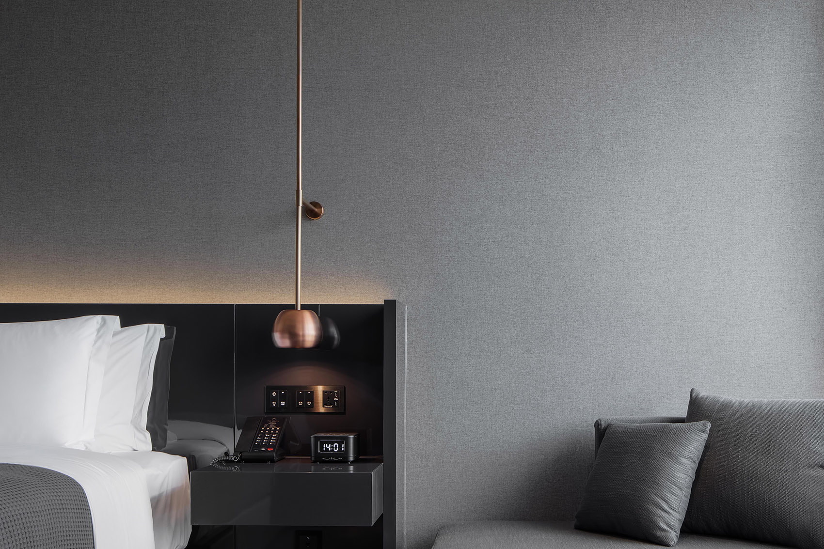 Linow 独有的品牌色——亮金色贯穿于整个设计,在雅致的客房走道中跳脱出活力与时尚,为宾客带来一种积极美好的生活向往。酒店客房处处可见设计心思,精雕细琢的室内设计,配上定制家具,丰富多样的质感和壁饰,有如为每间房间编织出一个触觉绣帷。